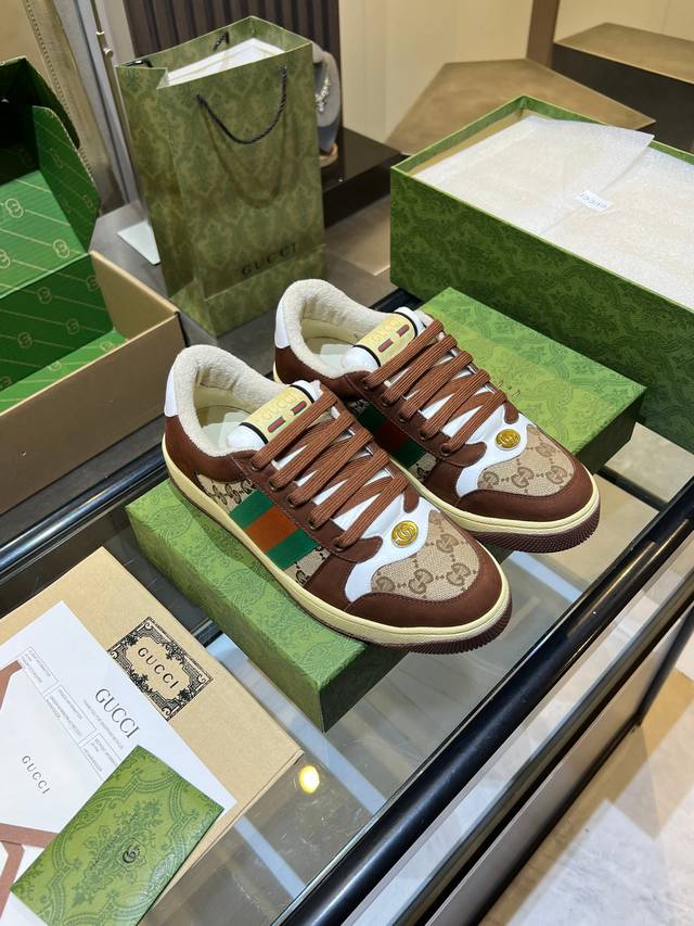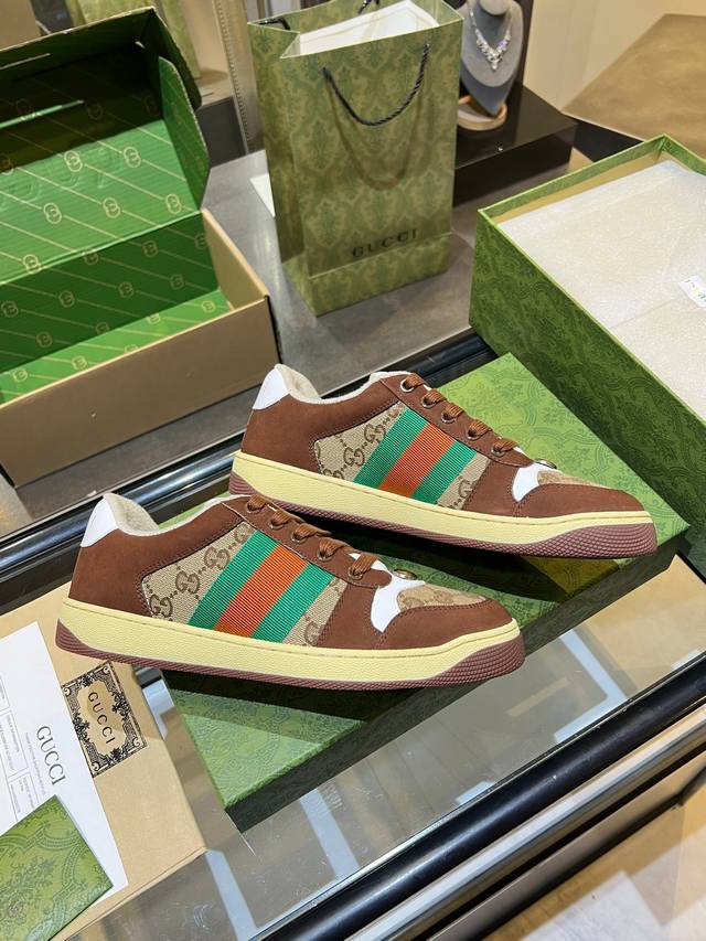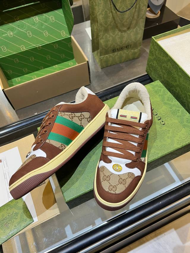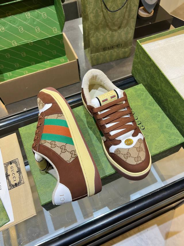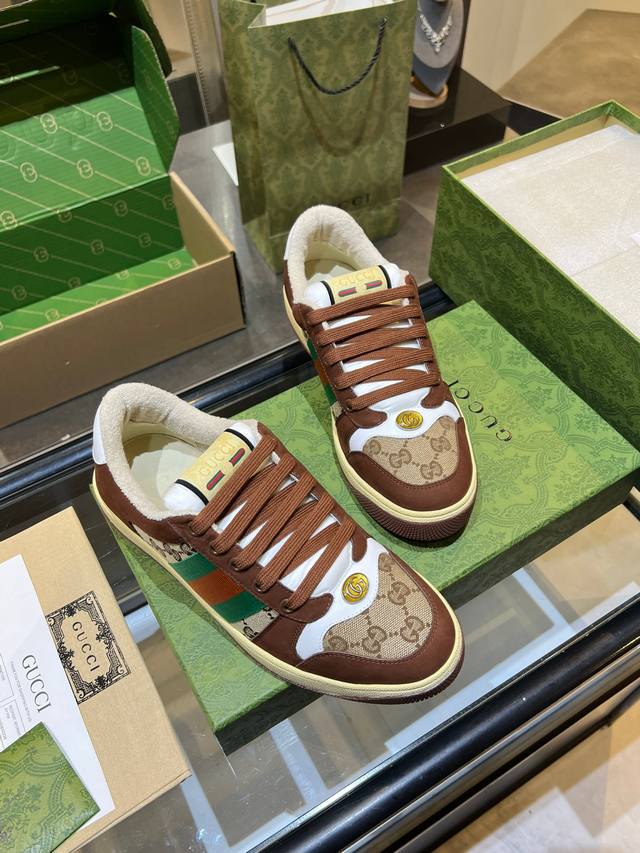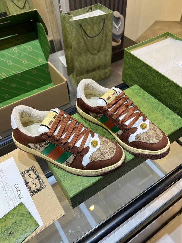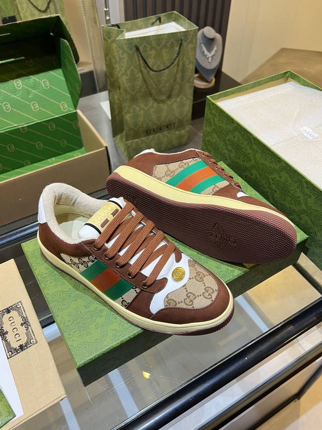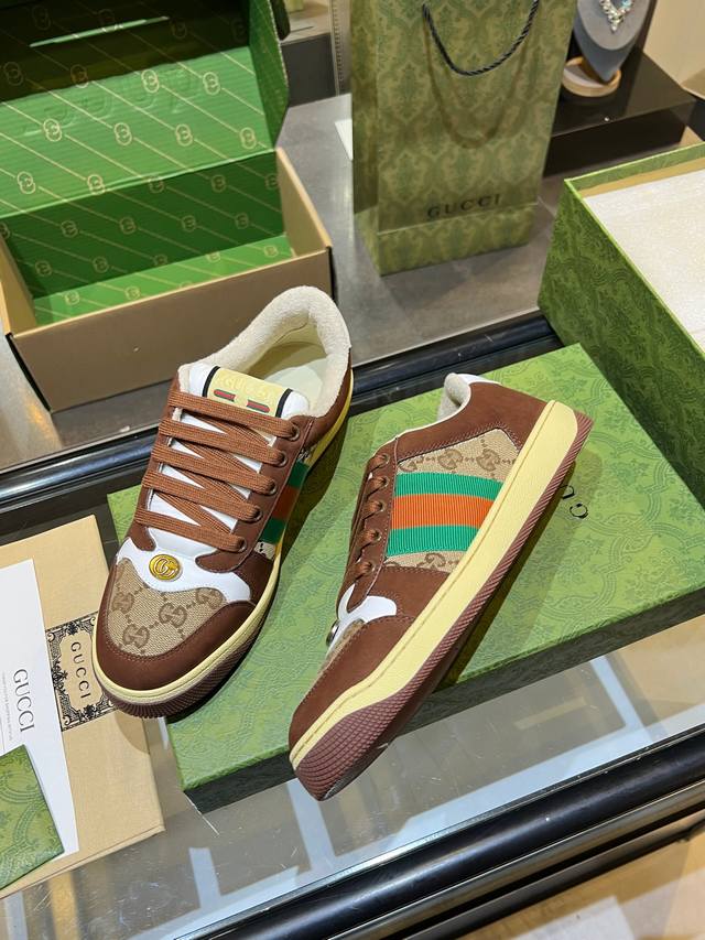 Gucci distressed sneakers, top-quality factory, impeccable 1:1 replica, incredibly comfortable to wear. Features include a vintage distressed design, a washed retro label on the tongue, and a metallic double Gucci logo (99% identical to the original). The entire shoe is covered in Gucci elements; the terry cloth lining and 3mm latex insole make it far more comfortable than genuine leather shoes. The eco-friendly TPU outsole is durable, soft, and elastic. The inner tongue uses imported elastic bands for excellent tension without constricting the foot. I only develop shoes with the original design; only shoes made from the original can be perfectly replicated, far surpassing other versions on the market. Every stitch is tight and full. The adjustment process is meticulous, requiring hundreds of revisions to achieve the perfect fit for all foot shapes. Women's sizes 35-40 - Men's sizes 39-45.