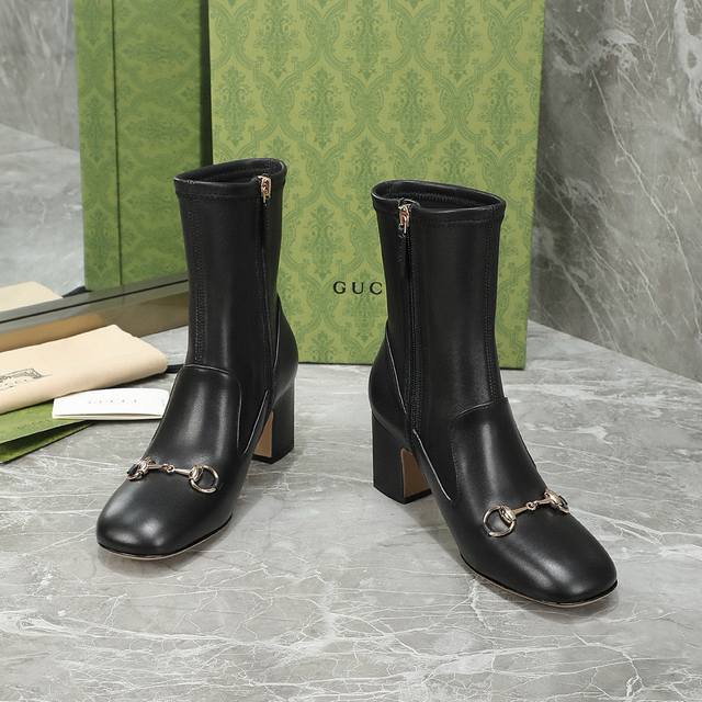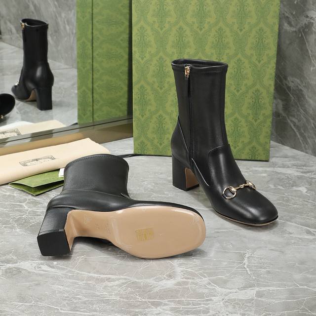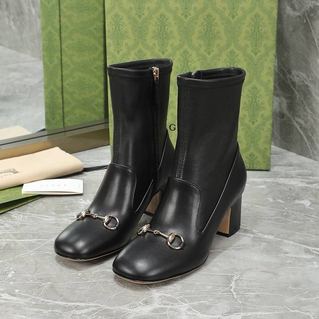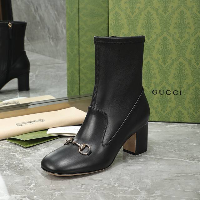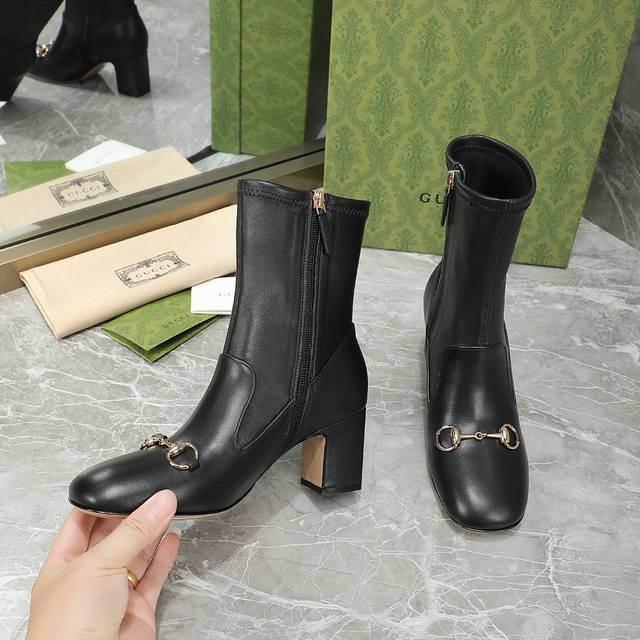 Gucci Fall/Winter Horsebit Ankle Boots. The classic 1955 horsebit design features a minimalist aesthetic with no unnecessary details. The semi-circular square toe is full and stylish, and the overall lines of the shoe are very soft, conforming to the shape of the foot. Material: Imported calfskin + elastic sheepskin. Lining: Sheepskin. Outsole: Italian genuine leather. Heel height: 6.5/9.5 cm. Sizes: 35-40, 41, 42 (custom sizes available).