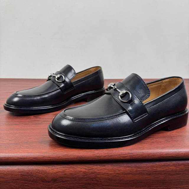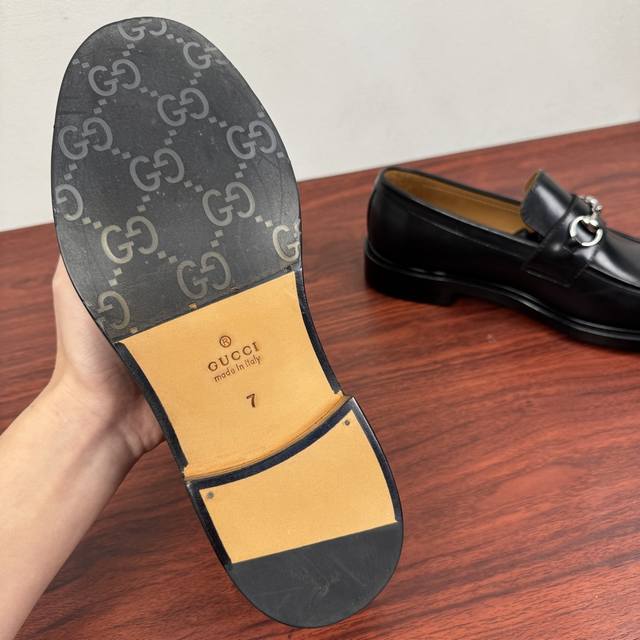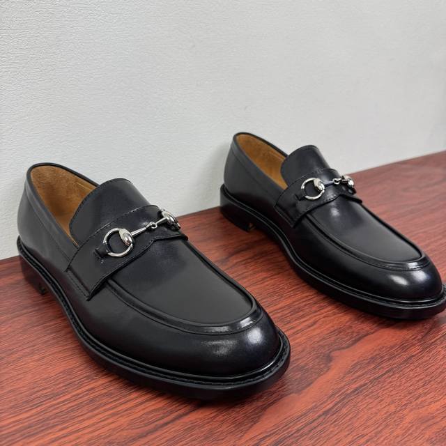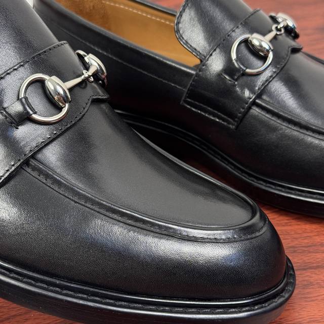 Gucci New Horsebit Loafers for Men! These classic horsebit loafers exude timeless elegance, paying homage to the brand's rich heritage. The meticulously crafted leather sole and semi-circular toe inject a fresh charm into the design. Iconic hardware and metal buckle details complement each other perfectly. The classic relaxed fit and solid-color leather highlight a simple yet classic style. Made from premium leather, the leather is supple, durable, and has excellent texture. The lining is made of naturally dyed calfskin with evenly distributed perforations, providing a soft and comfortable feel. The thickened genuine leather outsole features a composite rubber heel for excellent comfort, wear resistance, and slip resistance. A top choice for understated luxury, these loafers are versatile and come with full packaging! Sizes: 39-40-41-42-43-44. Custom sizes available: 38, 45, 46. Item No.: 812158 Black Calfskin.