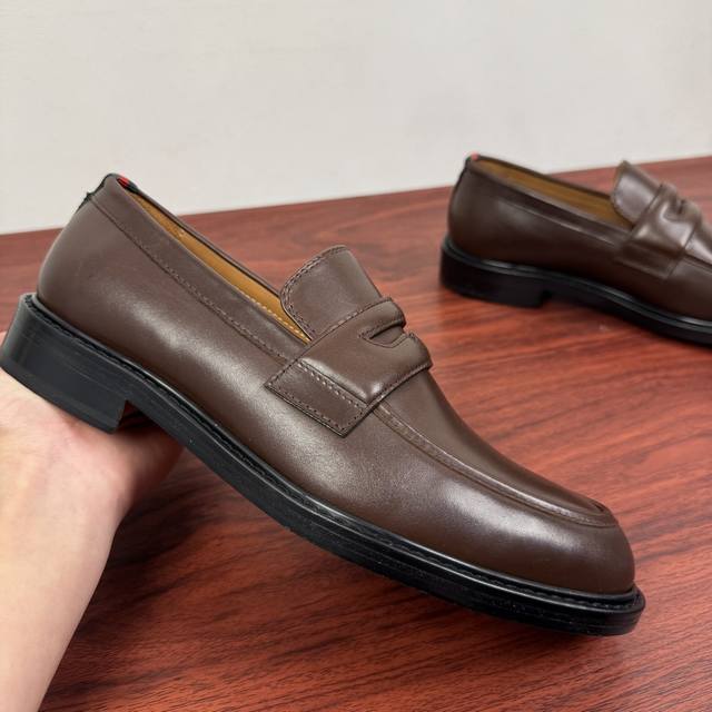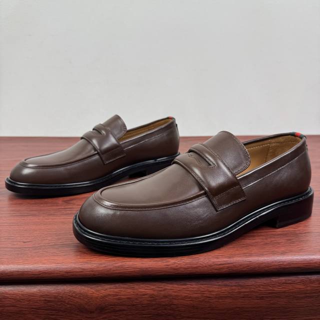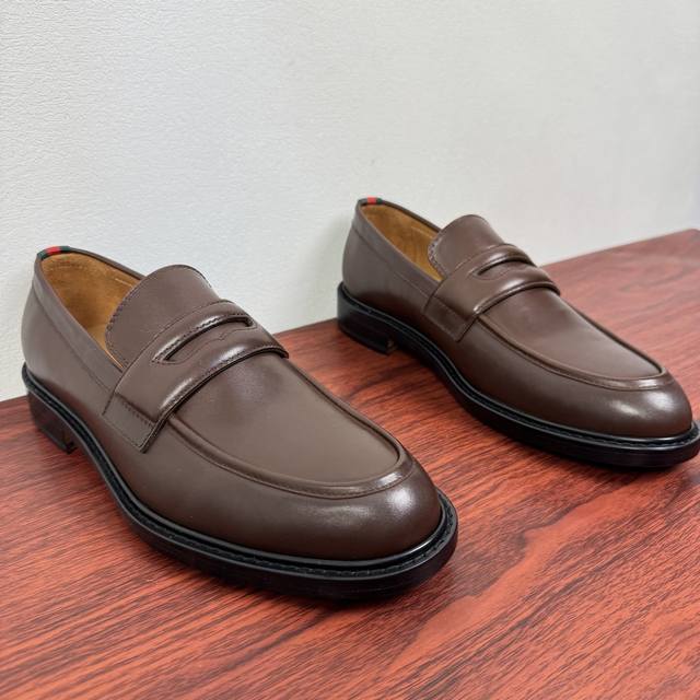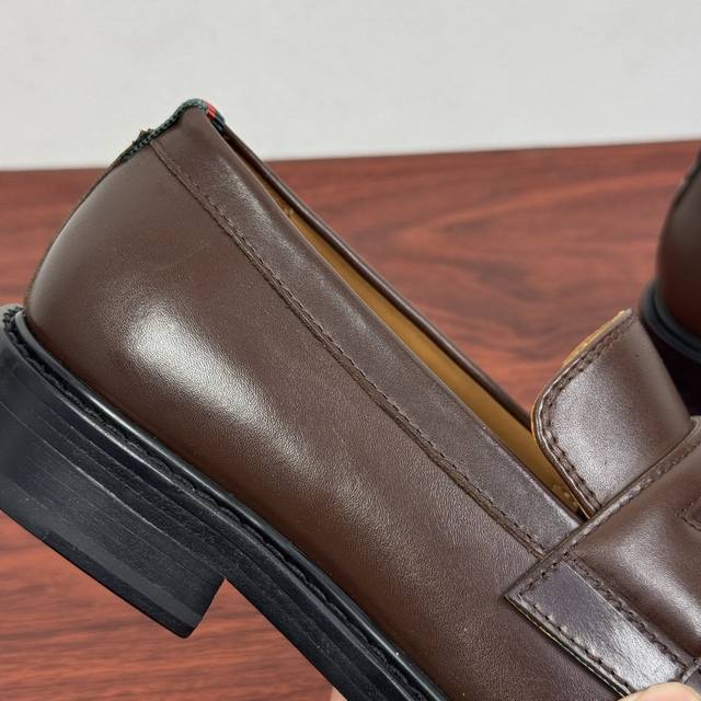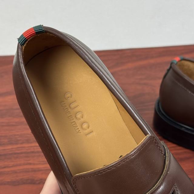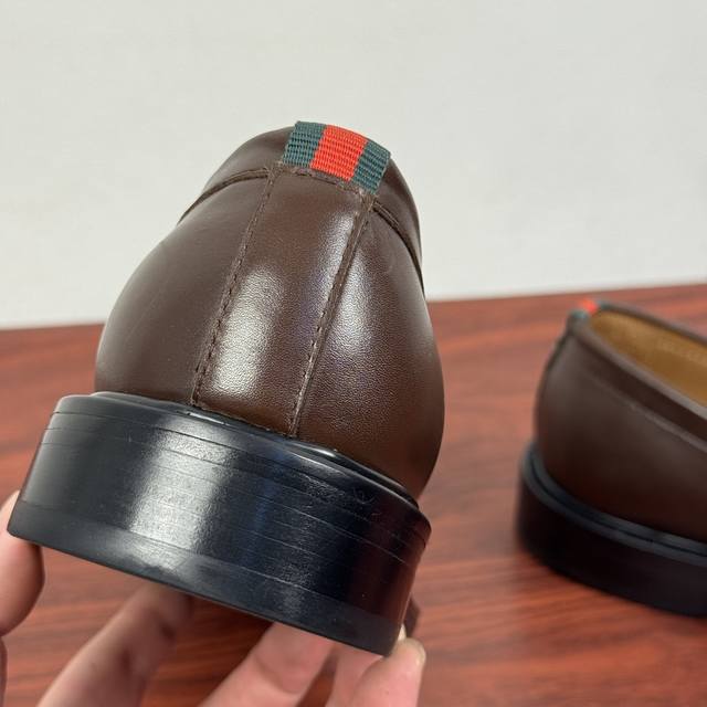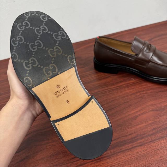 Gucci New Men's Solid Color Leather Loafers! These elegant loafers are crafted from soft, smooth cowhide leather and offer two style options. The upper features a genuine leather buckle detail, adding a subtle yet chic logo element. The minimalist design and classic European last shape are standard. The heel is adorned with red and green webbing details showcasing the brand's signature style. Made from premium leather, the craftsmanship is evident in the details. The naturally dyed calfskin lining has even and delicate perforations, offering softness and comfort. The thickened genuine leather outsole features a composite rubber sole at the heel, providing excellent comfort, durability, and slip resistance. A top choice for understated luxury, these loafers are versatile and come with full packaging! Sizes: 39-40-41-42-43-44. Custom sizes available: 38, 45, 46. Item Number: 812168. Brown Leather.