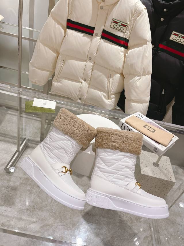 Gucci Paris Fashion Week China 2022 Merino Sheepskin Sheepskin Snow Boots, jacquard fabric, logo, top-grain cowhide, Australian imported sheepskin lining. DDD This Gucci snow boot combines two of the brand's iconic elements: gold horsebit hardware and V-shaped matelassie quilting. It is made in Italy from a blend of wool felt, trimmed with soft leather, and fully lined with beige sheepskin to keep feet warm. The rubber platform sole is embossed with the logo and provides excellent grip. DDD Heel height is approximately 3 cm. DDD Classic gold calfskin leather, beige sheepskin lining. DDD Slip-on style. DDD Made in Italy. DDD Follows true to size, please select your usual size. DDD Chinese size 35-42. DDD