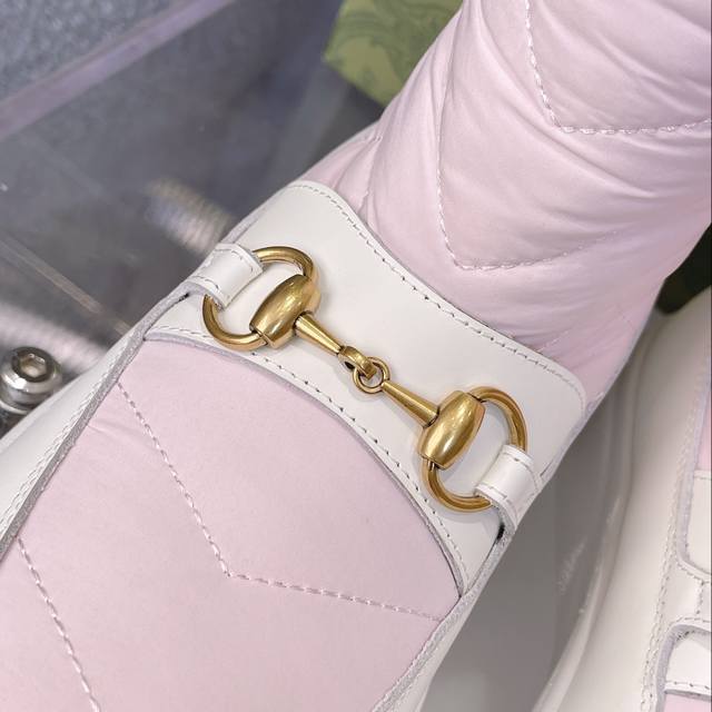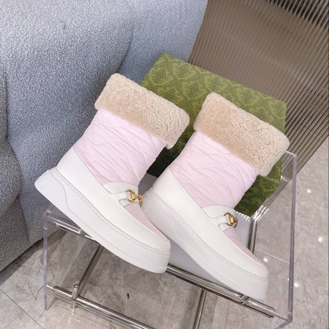 Gucci Paris Fashion Week China 2022 Merino Sheepskin Sheepskin Snow Boots, jacquard fabric, logo, top-grain cowhide, Australian imported sheepskin lining. DDD This Gucci snow boot combines two of the brand's iconic elements: gold horsebit hardware and V-shaped matelassie quilting. It is made in Italy from a blend of wool felt, trimmed with soft leather, and fully lined with beige sheepskin to keep feet warm. The rubber platform sole is embossed with the logo and provides excellent grip. DDD Heel height is approximately 3 cm. DDD Classic gold calfskin leather, beige sheepskin lining. DDD Slip-on style. DDD Made in Italy. DDD Follows true to size, please select your usual size. DDD Chinese size 35-42. DDD