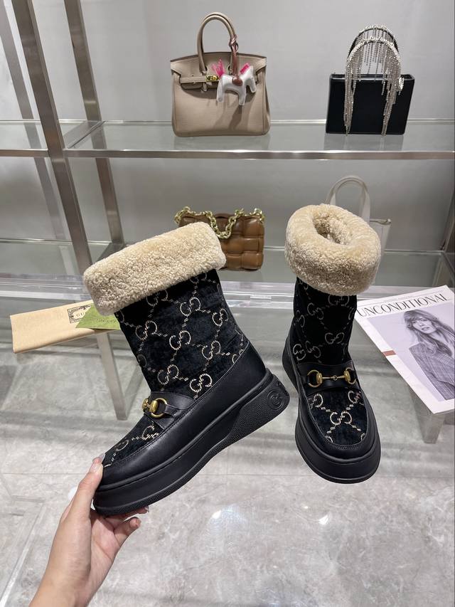 Gucci Paris Fashion Week China 2022 Merino Sheepskin Sheepskin Snow Boots, jacquard fabric, logo, top-grain cowhide, Australian imported sheepskin lining. DDD This Gucci snow boot combines two of the brand's iconic elements: gold horsebit hardware and V-shaped matelassie quilting. It is made in Italy from a blend of wool felt, trimmed with soft leather, and fully lined with beige sheepskin to keep feet warm. The rubber platform sole is embossed with the logo and provides excellent grip. DDD Heel height is approximately 3 cm. DDD Classic gold calfskin leather, beige sheepskin lining. DDD Slip-on style. DDD Made in Italy. DDD Follows true to size, please select your usual size. DDD Chinese size 35-42. DDD