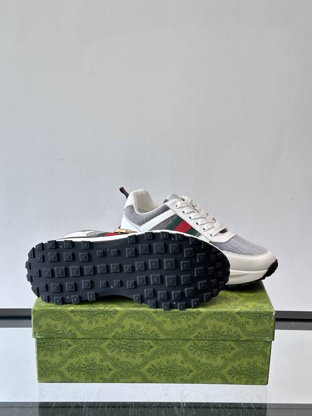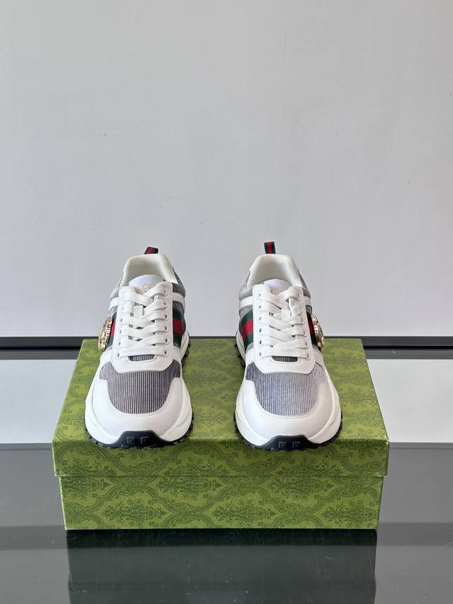 Gucci Rhyton sneakers, featuring a mesh and leather combination, the classic double-G metal logo, and red and green webbing, exuding brand prestige. The thick rubber sole provides cushioning and comfort, suitable for everyday wear or light exercise. The breathable upper ensures a comfortable feel, and the black color is versatile and dirt-resistant. A couple's design, stylish and practical, it's a favorite among young people! Pair with jeans or sporty clothing for an effortlessly trendy look. Available now! Sizes: 39-44, 38.45 (Custom sizes available).