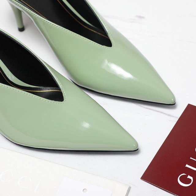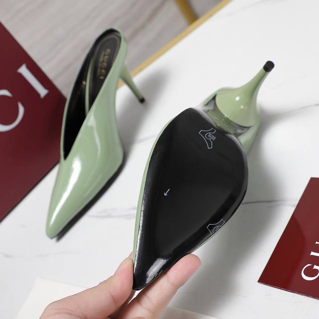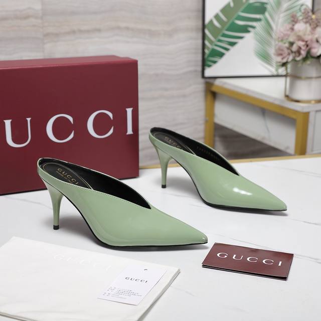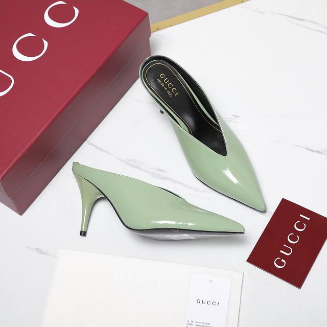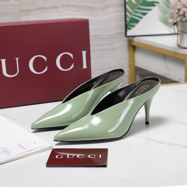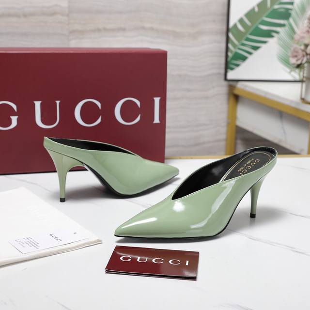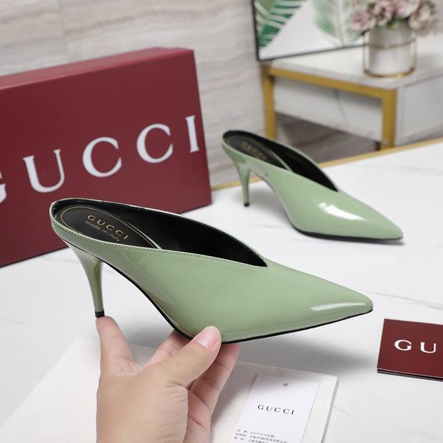 Gucci Top-Quality Replica! 2025 Summer New Arrival. Top-tier quality, 1:1 replica! The material is identical to the original, with excellent texture; there's no difference compared to the original. These high-heeled sandals have become a classic item for the brand. The chain and rhinestone buckle, inspired by Mr. Gucci's initials, imbue the shoe with the brand's essence. The brand uses different textures and color schemes to inject modern essence into the classic slipper. The chain and rhinestone embellishments make it simply classic. Material: Imported cow patent leather. Lining: Imported sheepskin. Heel height: 5.5cm/8.5cm. Outsole: Italian genuine leather. Sizes: 35-41, 41.42 (custom made). Full original packaging! Price: [Price not specified]