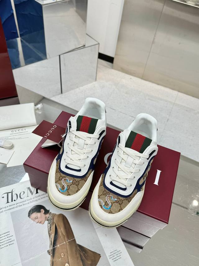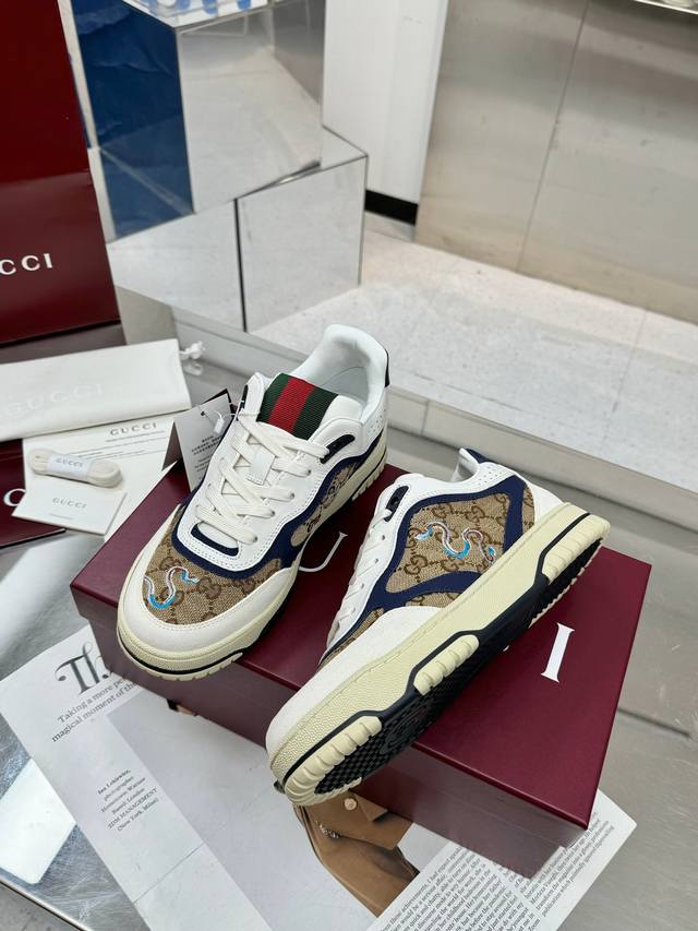 Gucci's latest hot-selling high-top and low-top distressed couple sneakers are now available. These high-top and low-top sneakers feature a basketball-inspired silhouette, cleverly incorporating perforated panels and a distressed effect, showcasing unique craftsmanship. The design incorporates interlocking double-G accessories and Gucci branding details, subtly paying homage to the brand's design heritage. Material : Original custom-made imported top-grain cowhide; Lining: Sheepskin lining; Sole: Original molded TPU sole; Sole thickness: 3cm; Size: Men's 39-46; 46 custom-made.