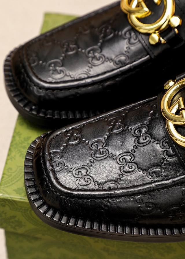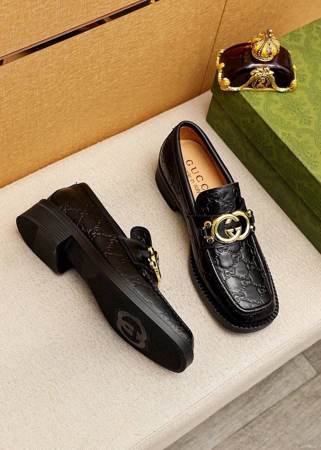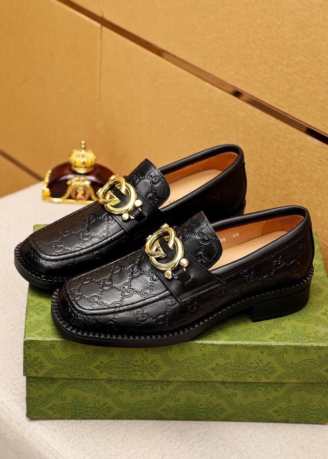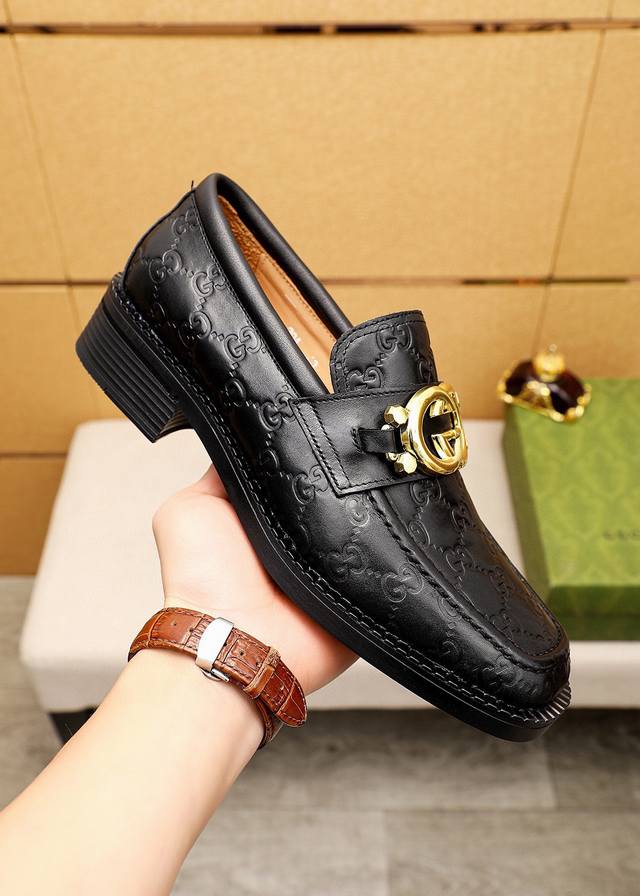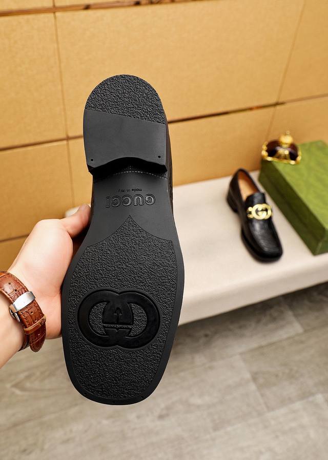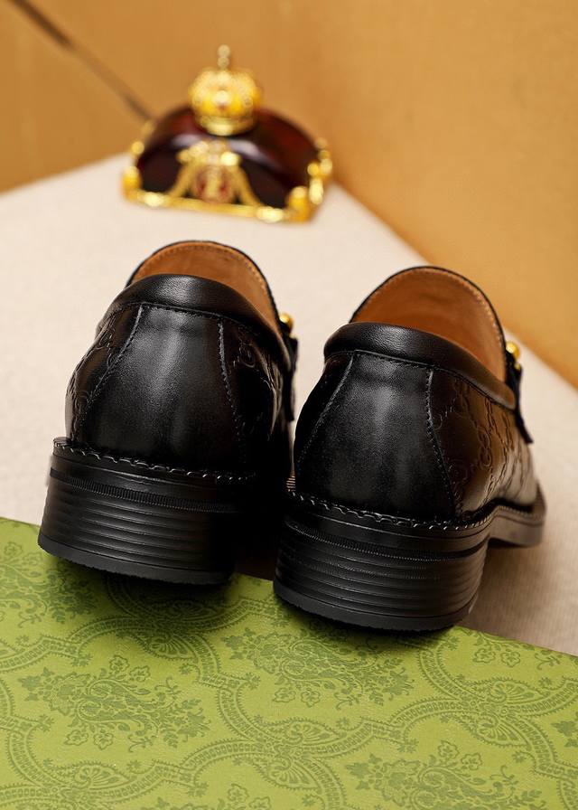 Original Gucci dress shoes, official website style, made with top-grain Italian calfskin, premium imported water-dyed cowhide lining, meticulously handcrafted, original outsole. Actual product photos; the real thing looks even better. Standard sizes 38-44, 45, 46. Custom sizes available.