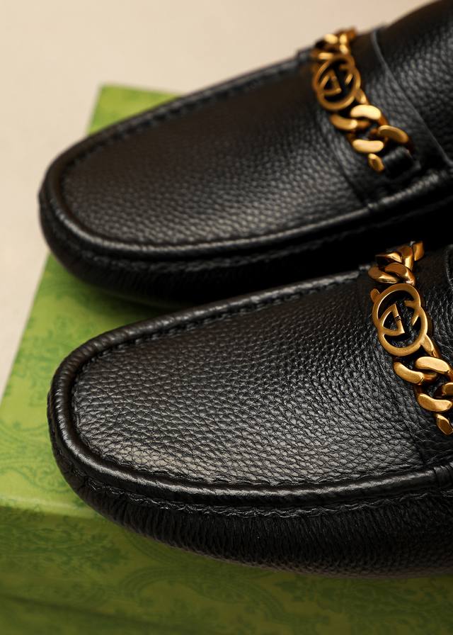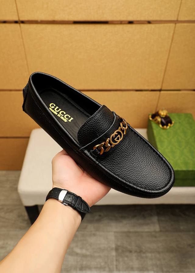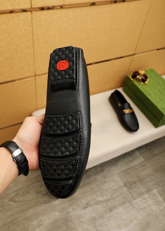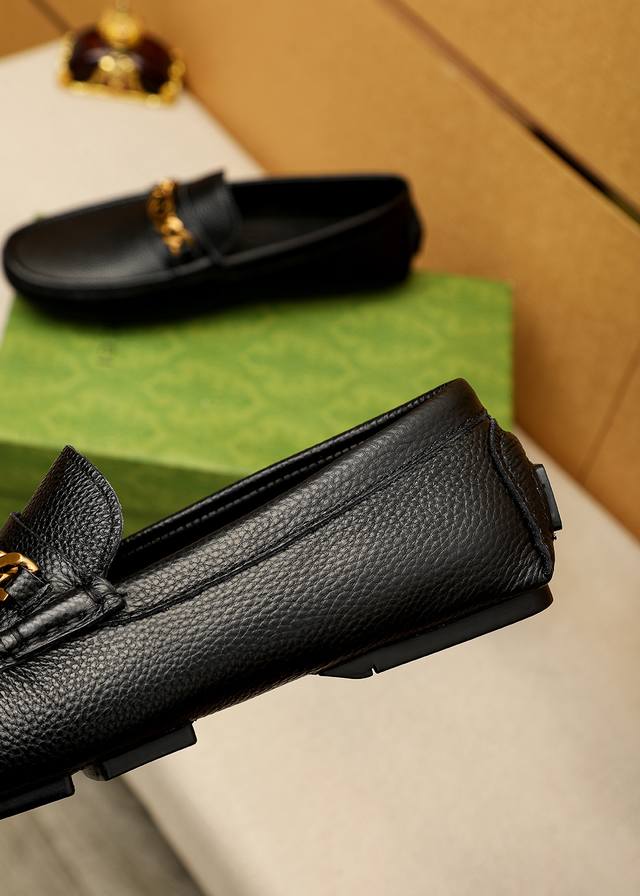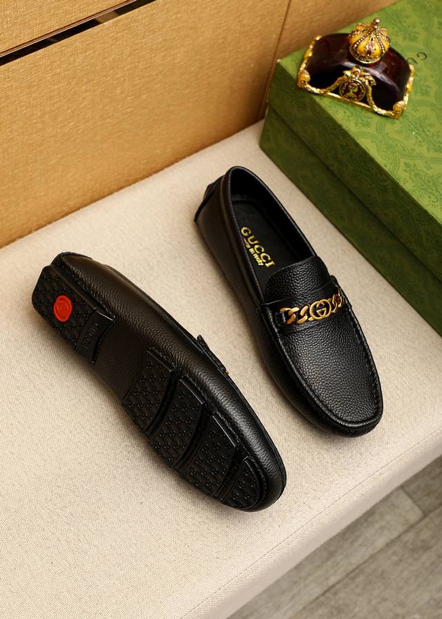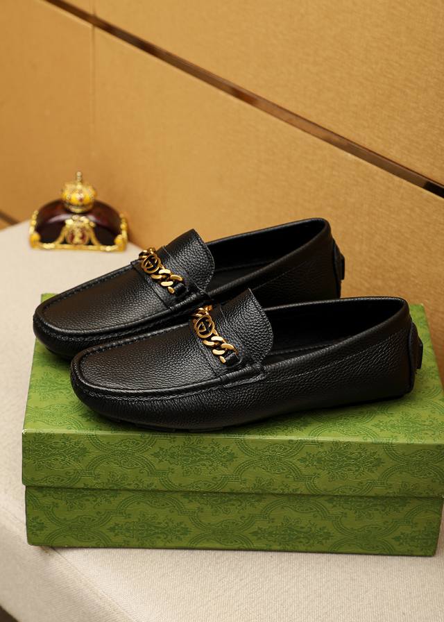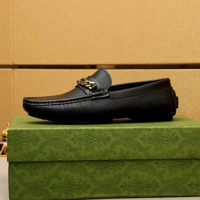 Product Trademark: Gucci Driving Shoes True to Size: 38-44, 45 (Custom Made) Materials: Selected top-grain lychee-textured cowhide upper + luxurious hardware buckles, imported sheepskin lining. Strong three-dimensional visual effect, original outsole. Colors: 2 colors available.