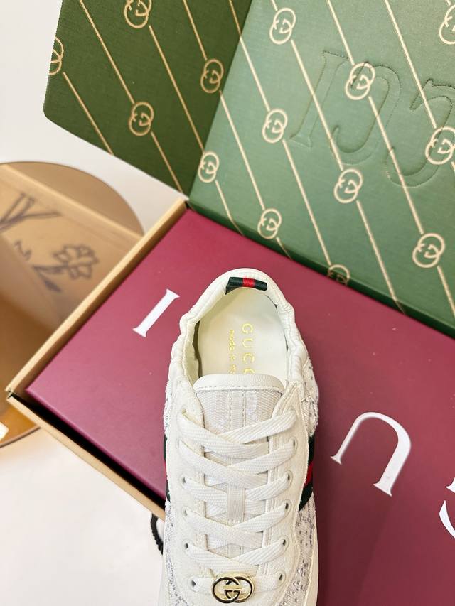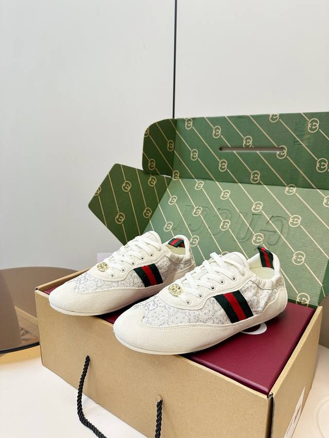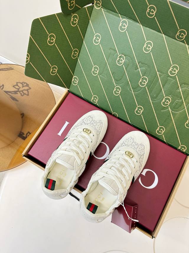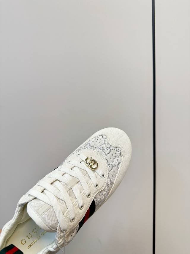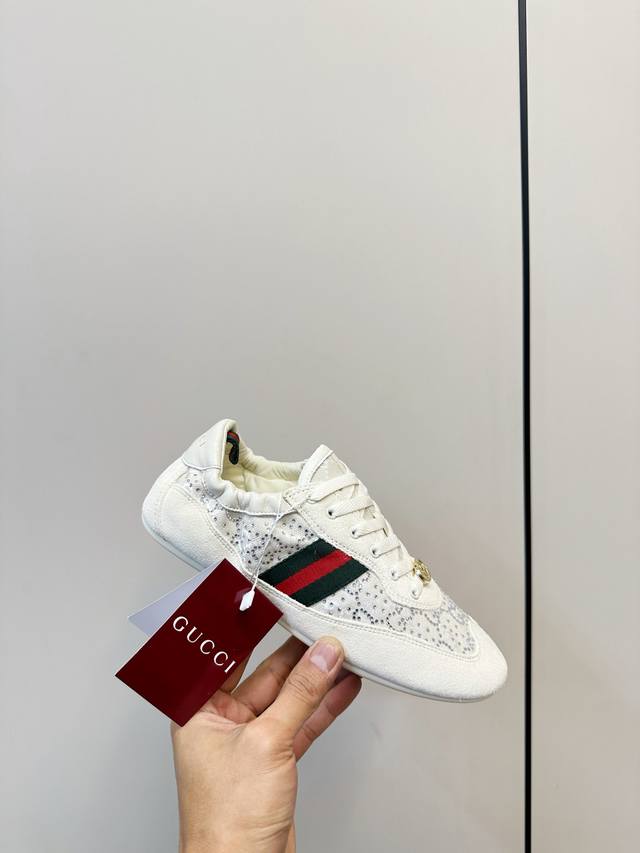 Gucci Shift Series Rhinestone Sneakers (German Training Shoes) Gucci Shift series rhinestone sneakers, featuring a double G monogram canvas and leather patchwork, adorned with imitation crystals for a luxurious feel! Classic red and green webbing and a metal double G logo ensure high brand recognition. The lightweight sole design makes them comfortable for everyday wear or long walks. The shell toe adds a retro touch, making feet appear smaller and more stylish, easily paired with skirts and jeans. Designed by Demna Gvasalia, these shoes combine fashion and function, making them one of Gucci's most popular items! Material: Deerskin patchwork monogram canvas + sheepskin. Lining: Chiffon. Insole: Sheepskin. Sizes: 35-40. 40.41 Custom made.