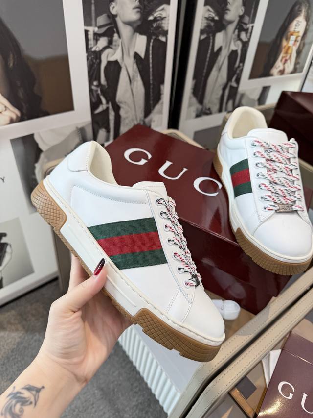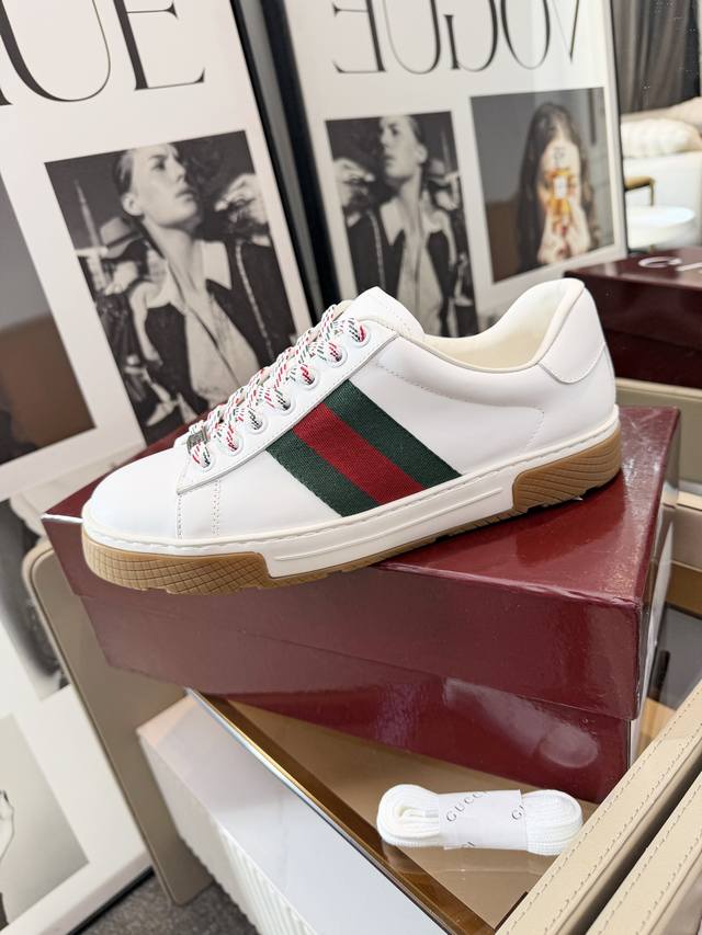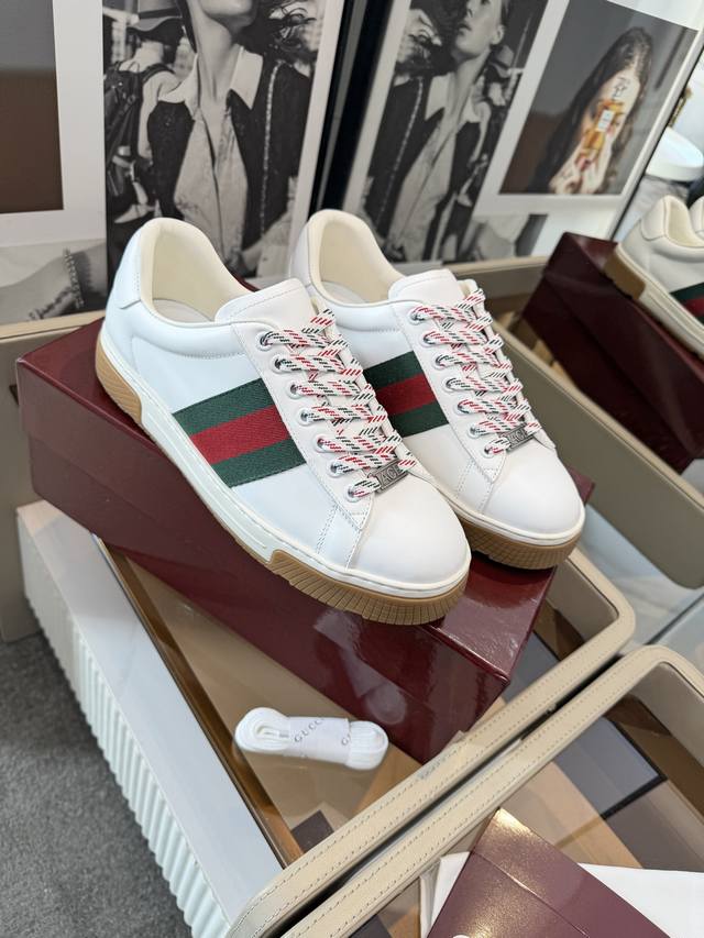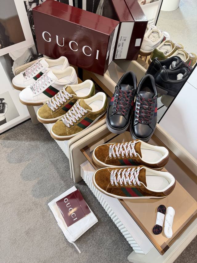 Gucci's new men's shoes feature classic webbing elements in a black and white color scheme. They retain Gucci's signature retro luxury while adding a touch of modern, trendy casualness. The distinctive lettering on the heel is highly recognizable. The low-top design with laces is understated yet sophisticated. The quality and design are impeccable, making them an absolute must-have for elevating your style. Sizes 39-45 DDD