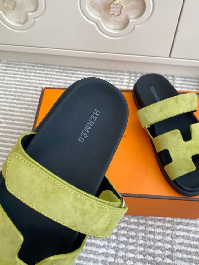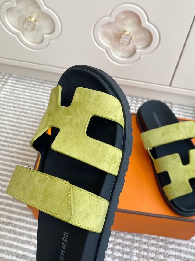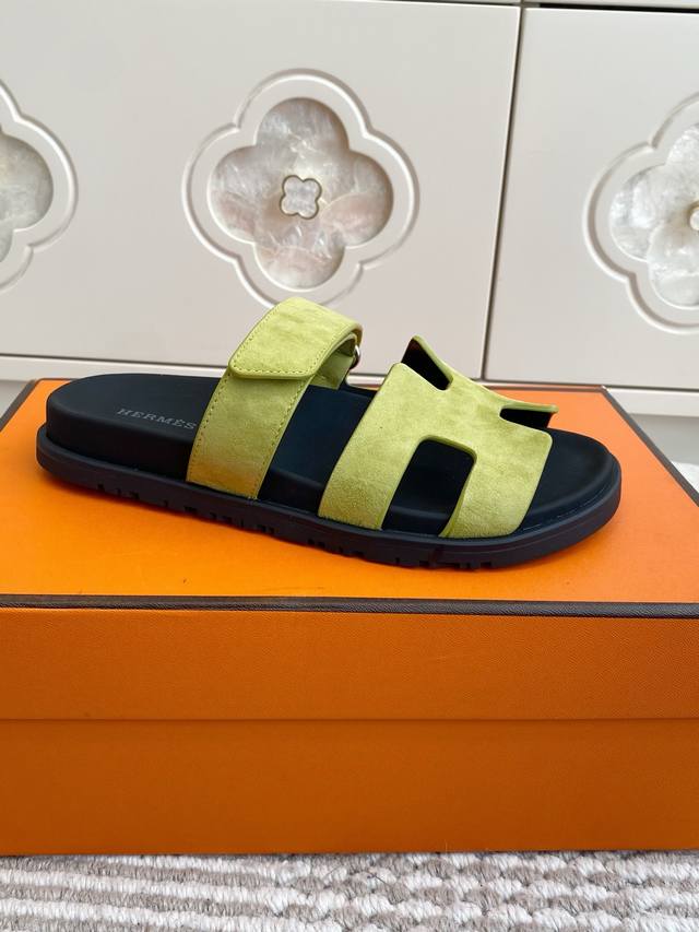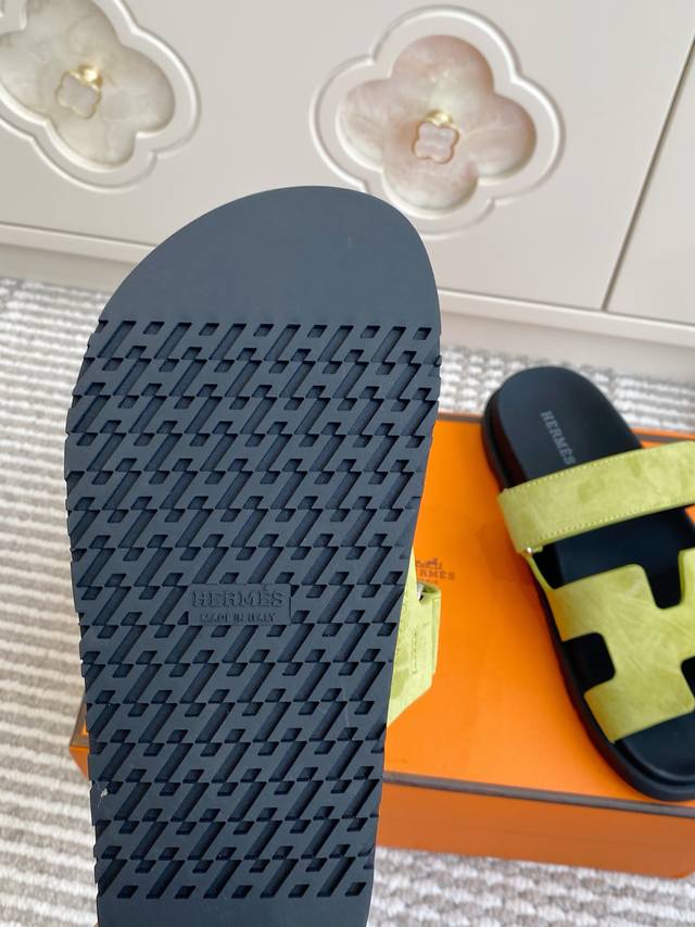 Batch of women's p men's p Ddd New color Ddd Hermes Chypre series Velcro slippers Ddd Top quality Ddd Upper: Imported top layer stone-textured cowhide, palm-textured cowhide, gradient cowhide, goatskin, sheepskin denim Ddd Insole: Mixed sheepskin, original molded outsole Ddd Women's size 35-39, women's size 41 (custom made), men's size 39-45, men's size 46 (custom made) DDD