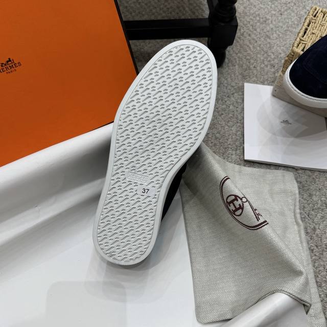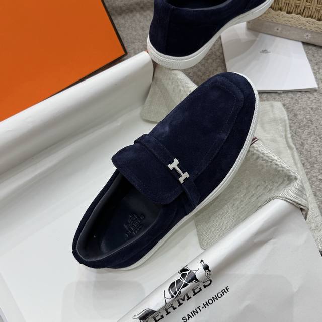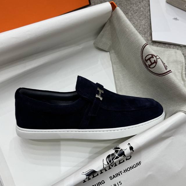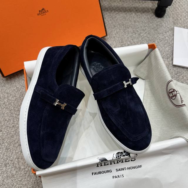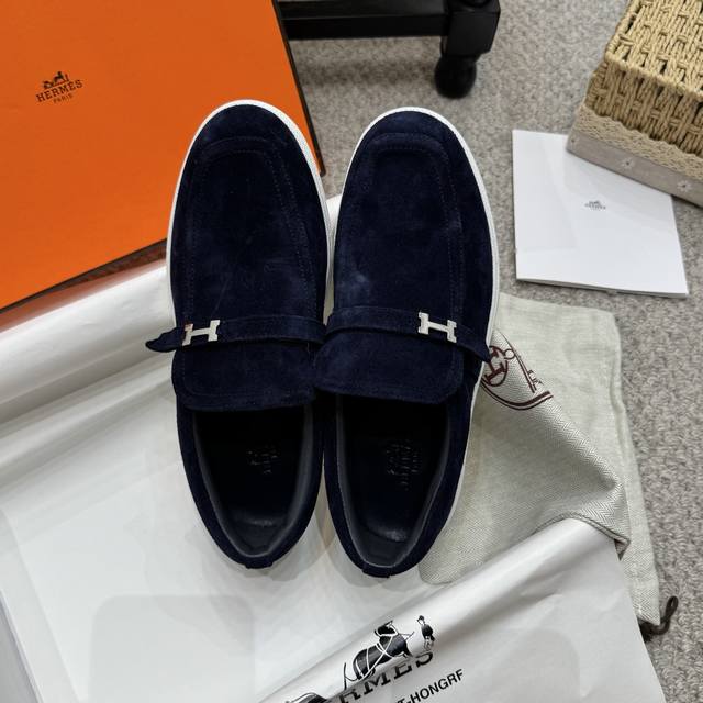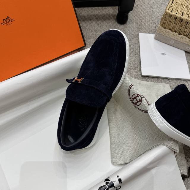 Couple style men's loafers, Hermes 25Ss autumn/winter new style, British retro design, classic and timeless! Original molded last, perfect 1:1 shape. Upper: calfskin suede; Lining: imported sheepskin; Outsole: custom-molded rubber sole; Sizes: 35-45