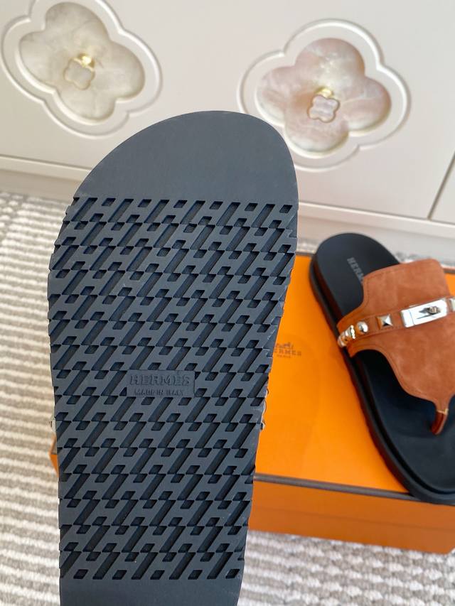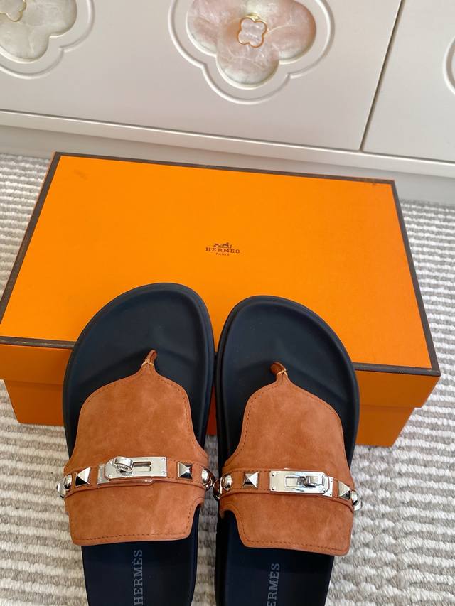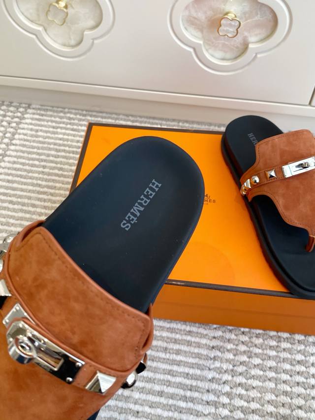 Couple's Hermes Empire Series Kelly Buckle Flip-Flops, Top Quality Calfskin Slippers with Ergonomic Sole and Kelly Buckle. Upper: Imported Calfskin, Original Mold Outsole. Unisex: Sizes 35-45, 46 (Custom Made).