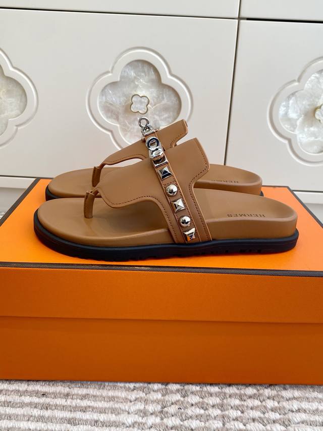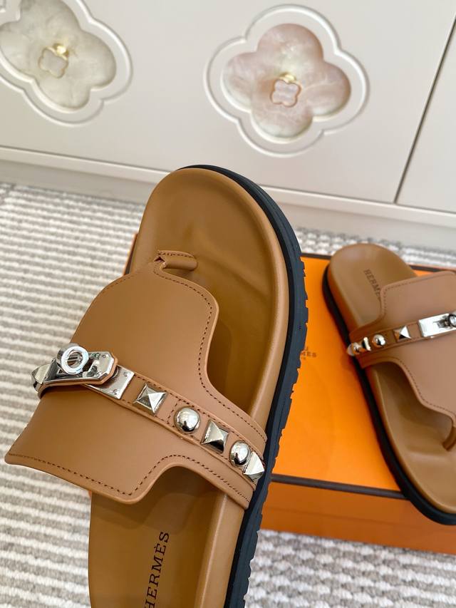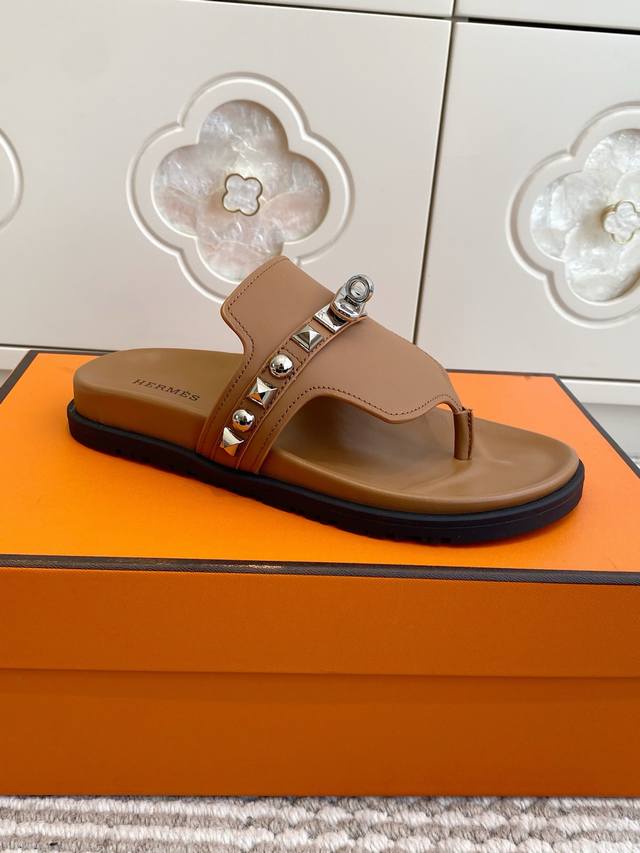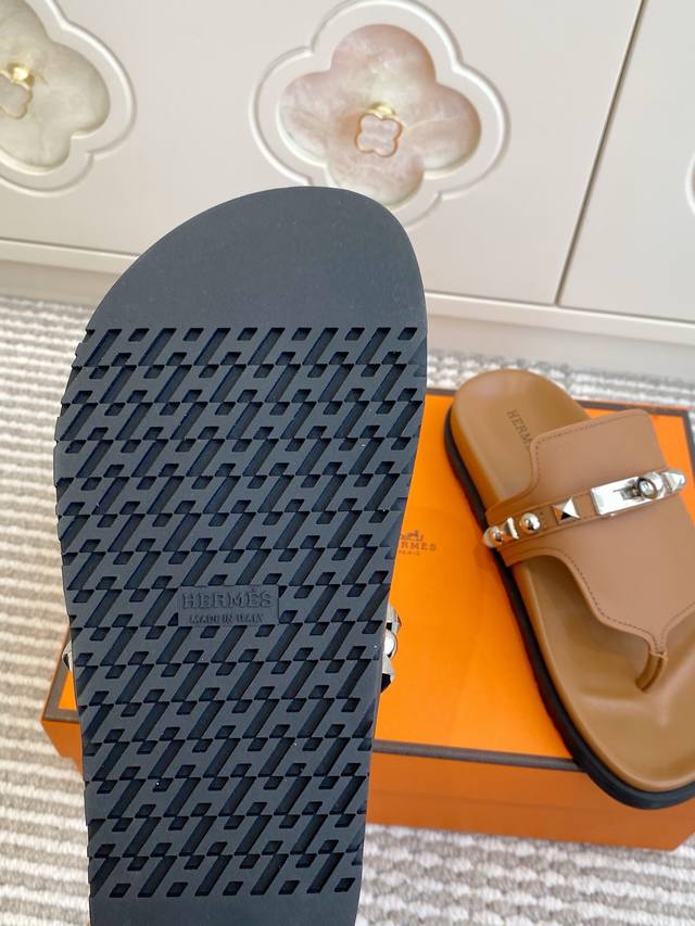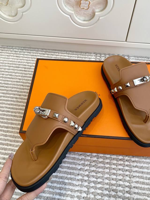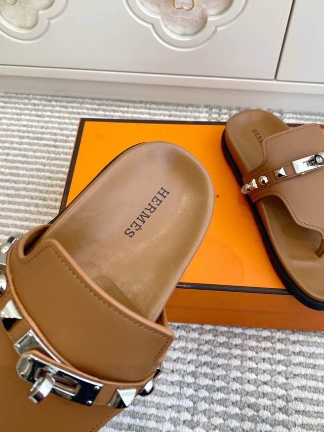 Couple's Hermes Empire Series Kelly Buckle Flip-Flops, Top Quality Calfskin Slippers with Ergonomic Sole and Kelly Buckle. Upper: Imported Calfskin, Original Mold Outsole. Unisex: Sizes 35-45, 46 (Custom Made).