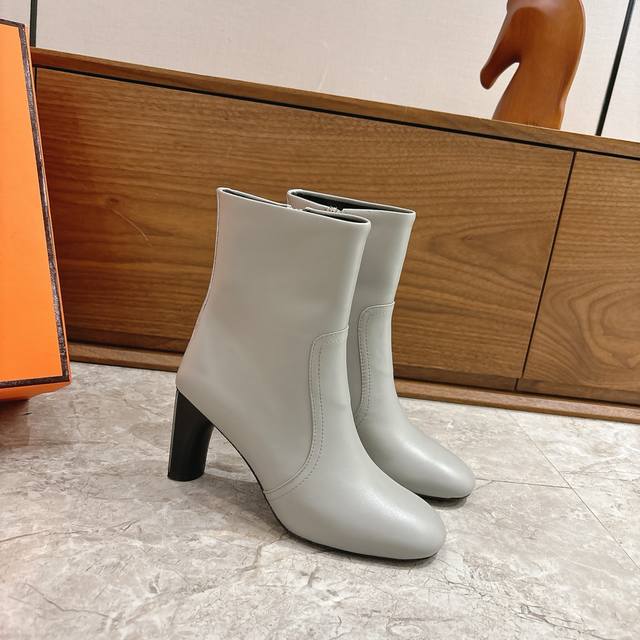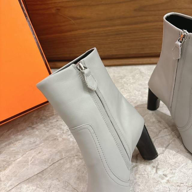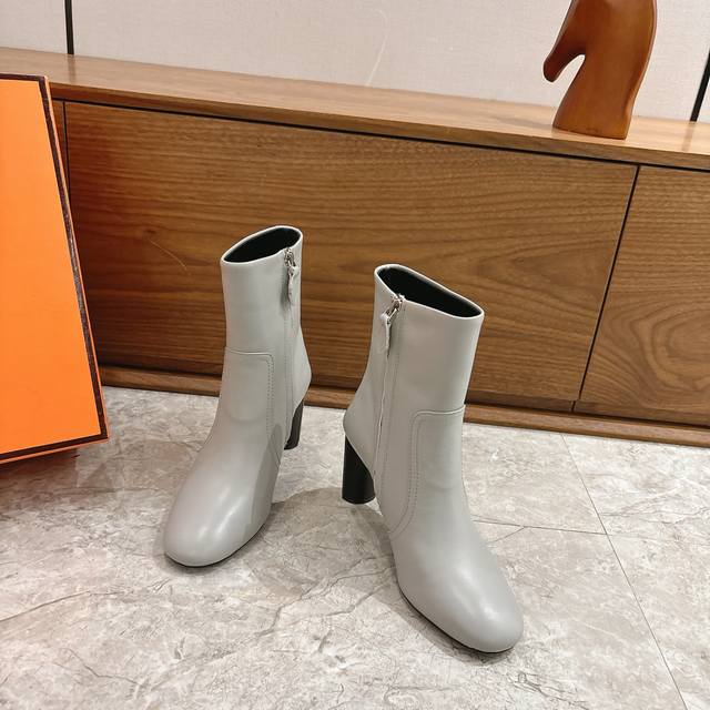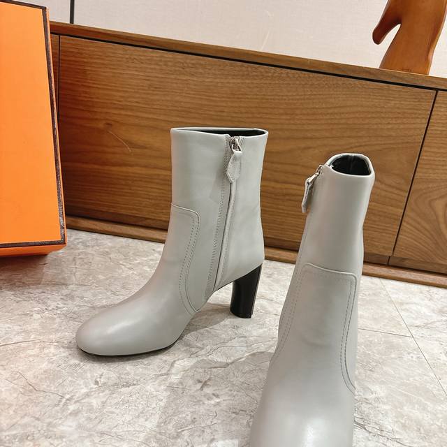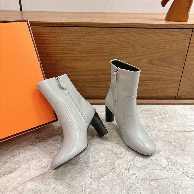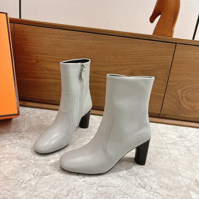 Factory direct Hermes Fall/Winter latest vintage-style ankle boots, extremely difficult to find in boutiques. Hermes boots typically feature classic and minimalist designs. This runway boot breaks with tradition, featuring a round toe and the latest trendy silhouette, showcasing a noble and sophisticated quality. The smooth, natural lines elegantly hug the leg, highlighting its elongated shape. It pairs beautifully with both skirts and trousers. Upper: Custom calfskin; Lining/Insole: Cowhide; Heel height: 7.5cm; Italian genuine leather outsole; Size: 35-39; 40-41 (Made to order, no returns or exchanges).