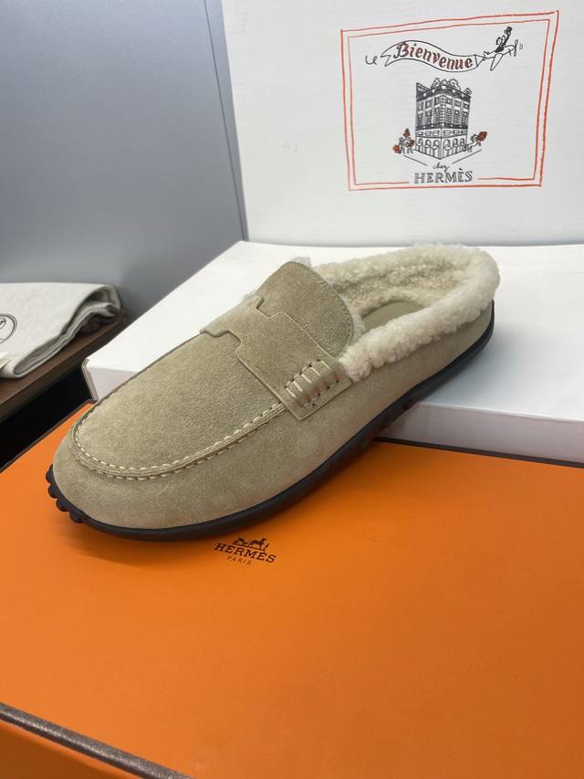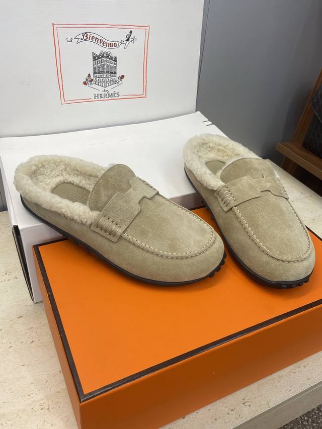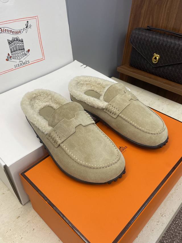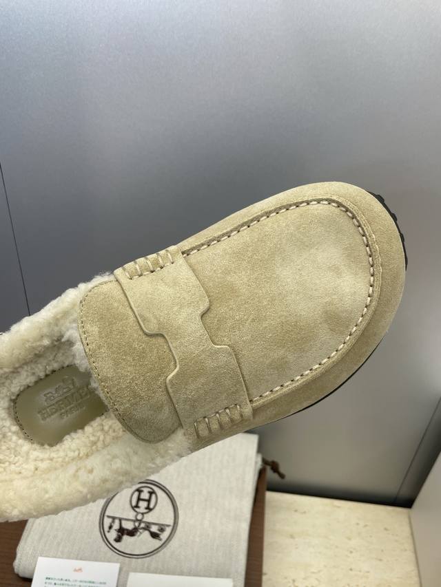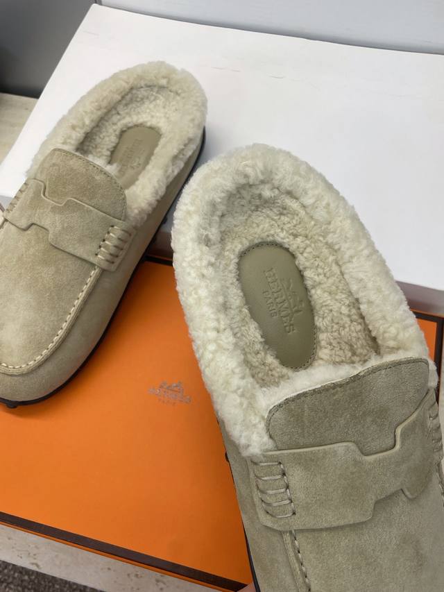 Factory direct price, comes with a full set of airplane boxes. Dongguan-made, high-quality Hermes 2025 Spring/Summer new Lazy warm lamb wool loafers for women. Flat, round toe, fashionable, casual, and homey mule slippers. Material: Imported suede upper + lamb wool lining + original mold TPU outsole. Size: Women's sizes 35-41, 40.41. Custom orders are non-refundable.