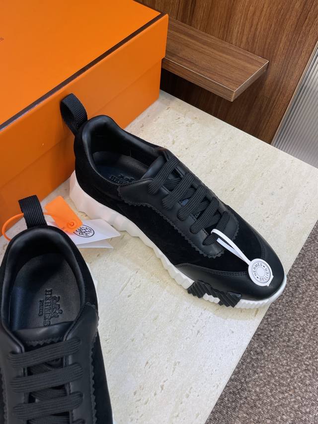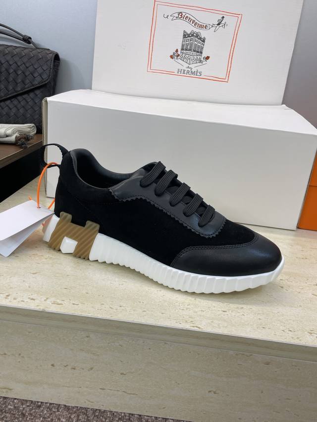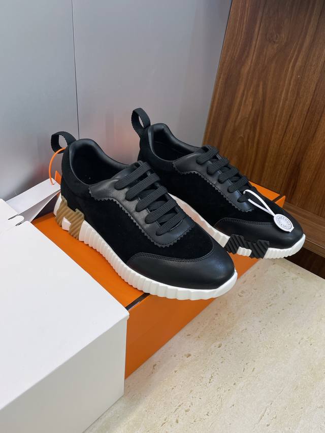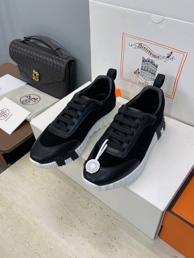 Factory direct price, comes with a full set of airplane boxes. Top-quality Hermes 2025 Autumn/Winter classic couple's Bouuncing casual lace-up sneakers, H-brand thick-soled fashionable color-blocked running shoes. Material: Imported suede upper, imported calfskin + water-dyed sheepskin lining + original molded outsole. Sole thickness: 2.5cm. Size: Women's sizes 35-42, 40, 41, 42 (custom sizes, no returns/exchanges); Men's sizes 39-46, 39, 46 (custom sizes, no returns/exchanges).