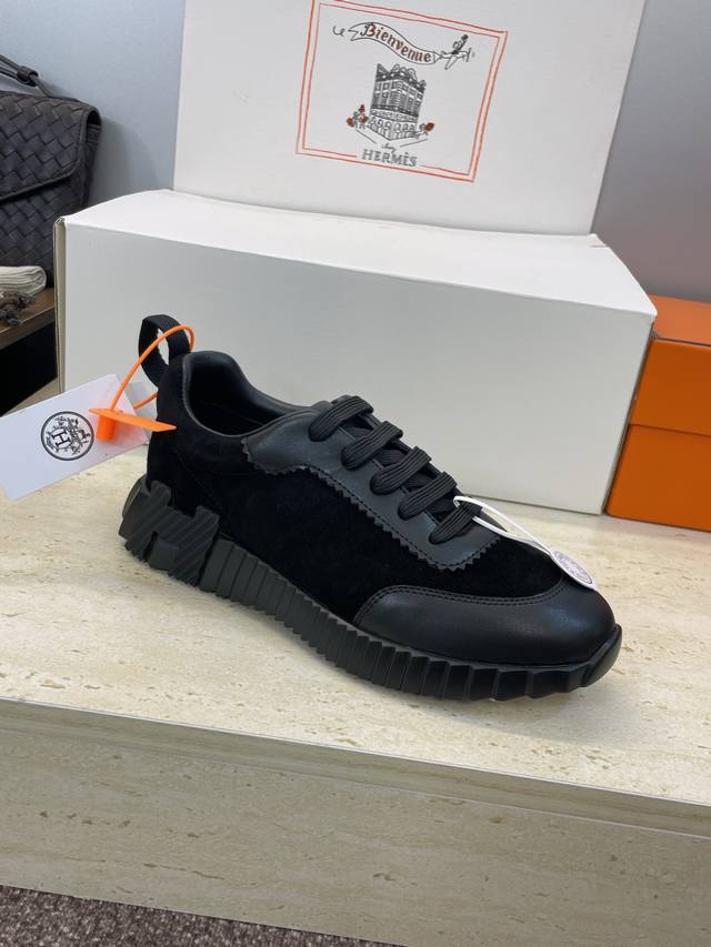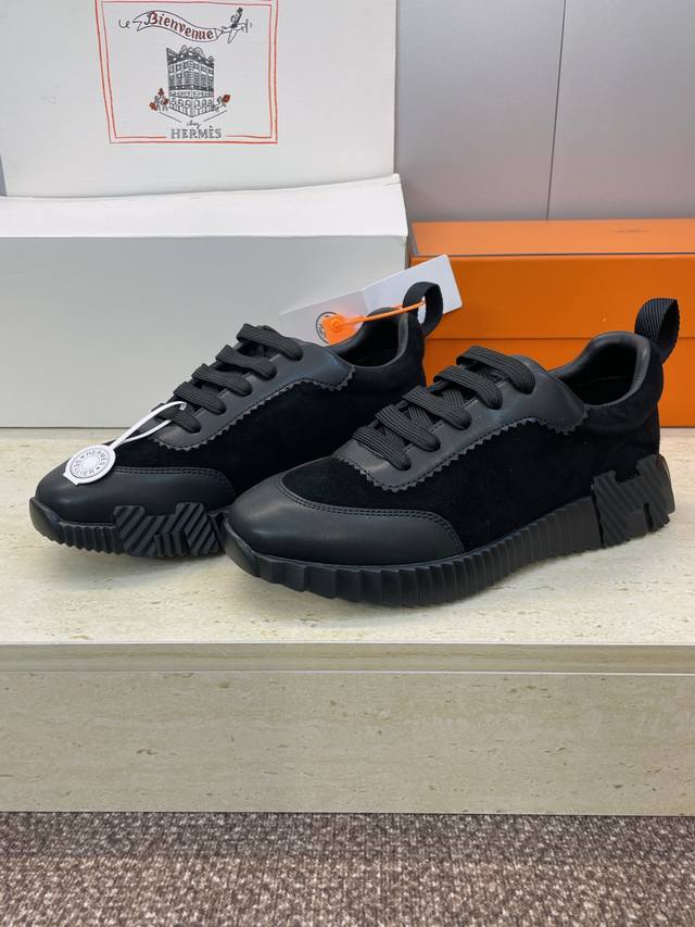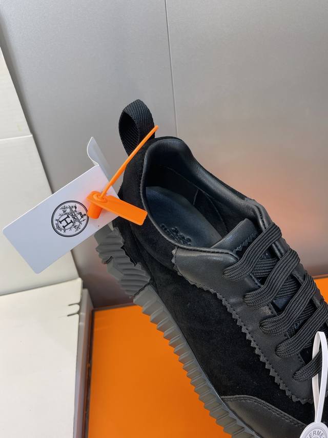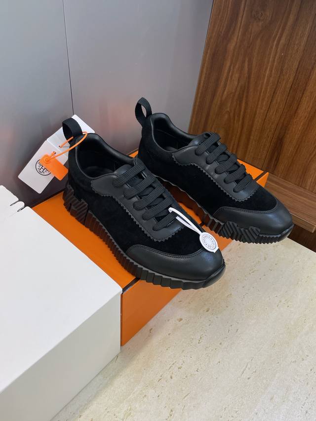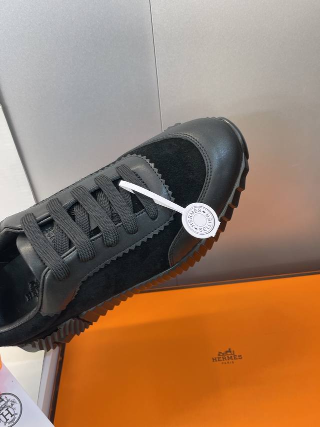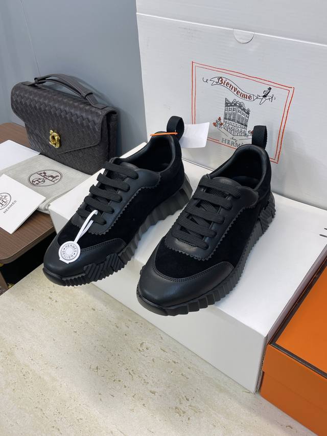 Factory direct price, comes with a full set of airplane boxes. Top-quality Hermes 2025 Autumn/Winter classic couple's Bouuncing casual lace-up sneakers, H-brand thick-soled fashionable color-blocked running shoes. Material: Imported suede upper, imported calfskin + water-dyed sheepskin lining + original molded outsole. Sole thickness: 2.5cm. Size: Women's sizes 35-42, 40, 41, 42 (custom sizes, no returns/exchanges); Men's sizes 39-46, 39, 46 (custom sizes, no returns/exchanges).