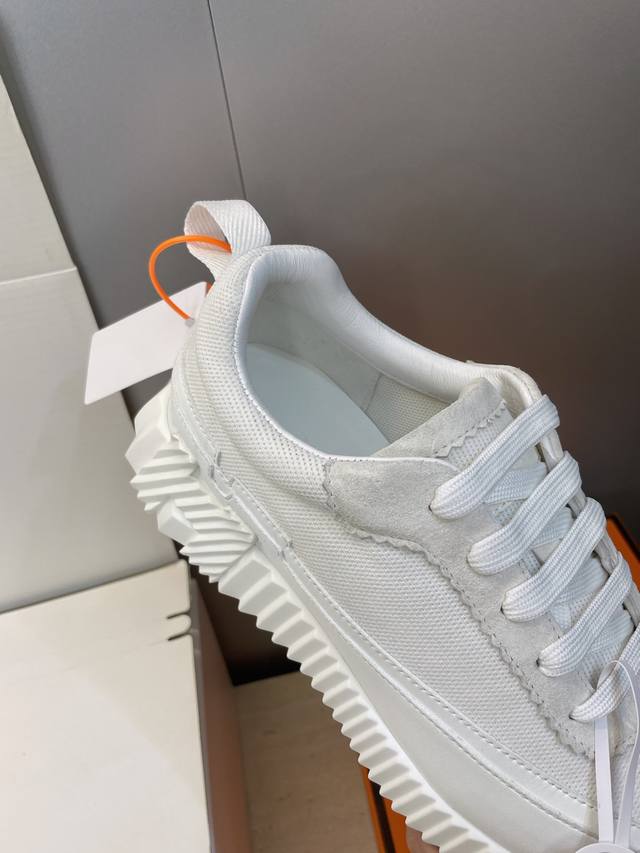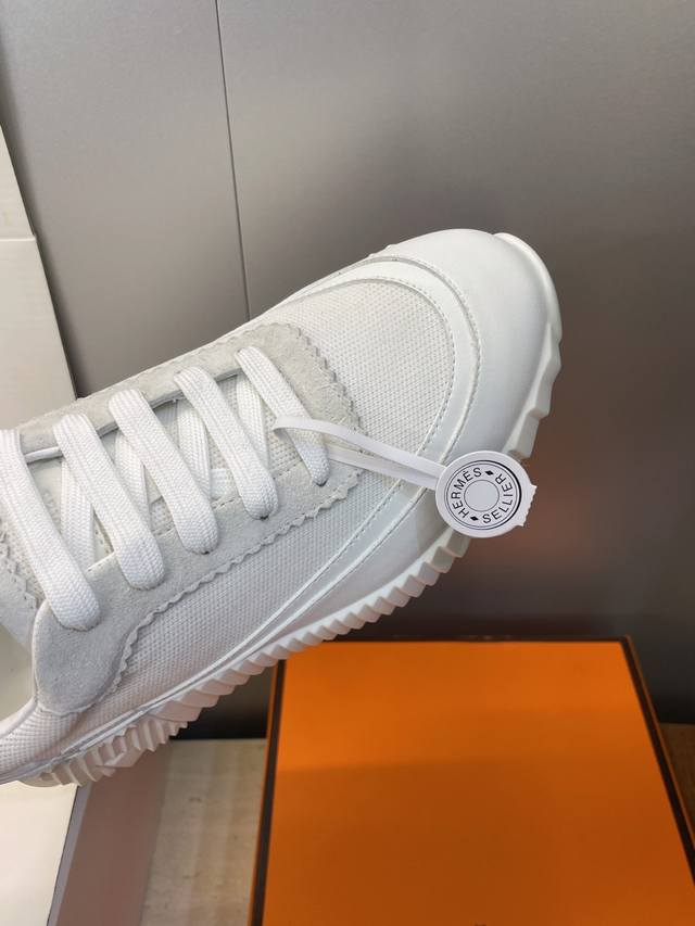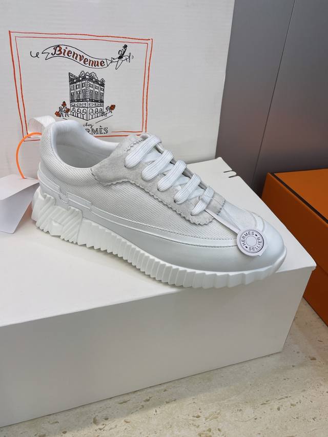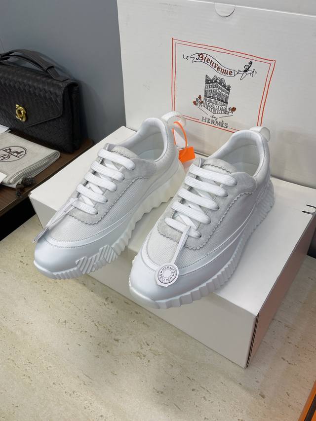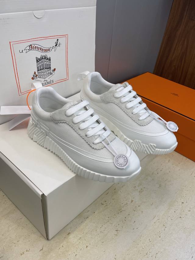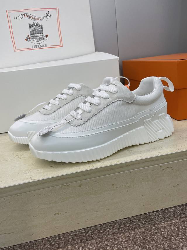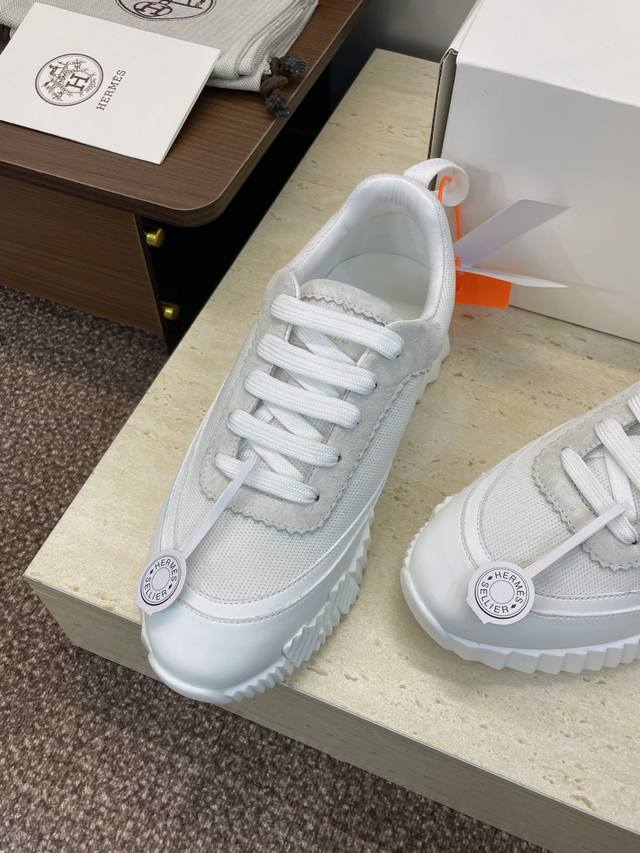 Factory direct price, comes with a full set of airplane boxes. Top-quality Hermes 2025 Autumn/Winter classic couple's Bouuncing casual lace-up versatile sneakers. High-quality Hermes platform running shoes with fashionable color blocking. Material: Imported environmentally friendly breathable mesh upper combined with imported suede calfskin + water-dyed sheepskin lining + original molded outsole. Sole thickness: 2.5cm. Size: Women's sizes 35-42, 40, 41, 42 (custom sizes, no returns/exchanges); Men's sizes 39-46, 39, 46 (custom sizes, no returns/exchanges).