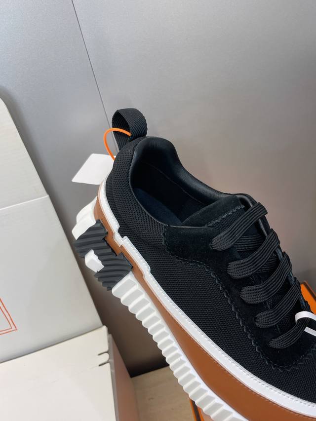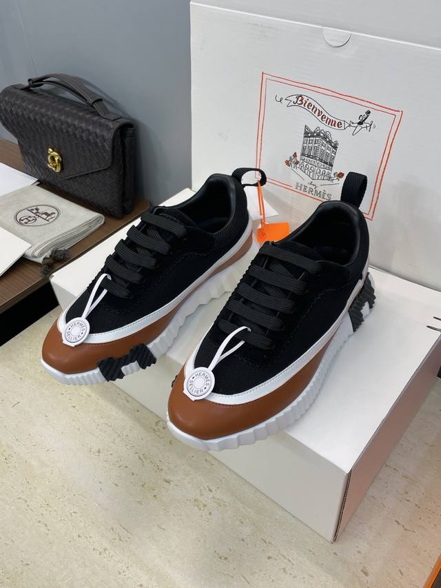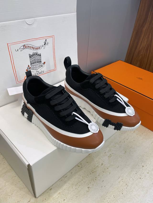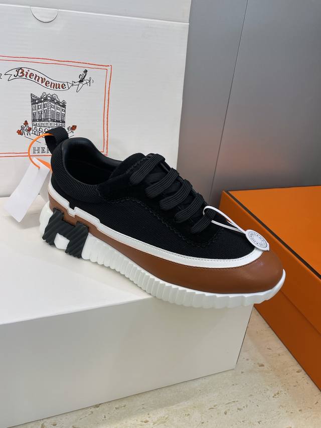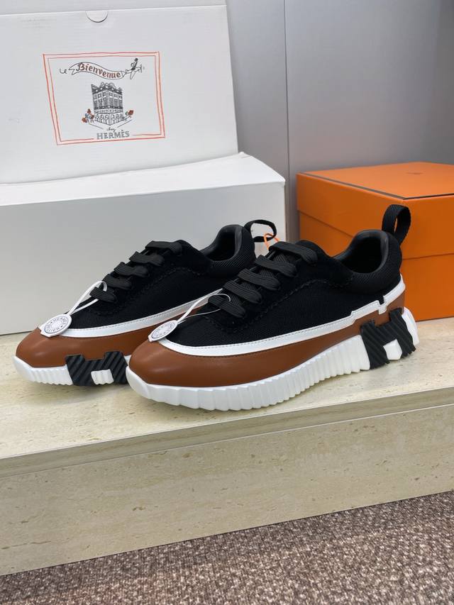 Factory direct price, comes with a full set of airplane boxes. Top-quality Hermes 2025 Autumn/Winter classic couple's Bouuncing casual lace-up versatile sneakers. High-quality Hermes platform running shoes with fashionable color blocking. Material: Imported environmentally friendly breathable mesh upper combined with imported suede calfskin + water-dyed sheepskin lining + original molded outsole. Sole thickness: 2.5cm. Size: Women's sizes 35-42, 40, 41, 42 (custom sizes, no returns/exchanges); Men's sizes 39-46, 39, 46 (custom sizes, no returns/exchanges).