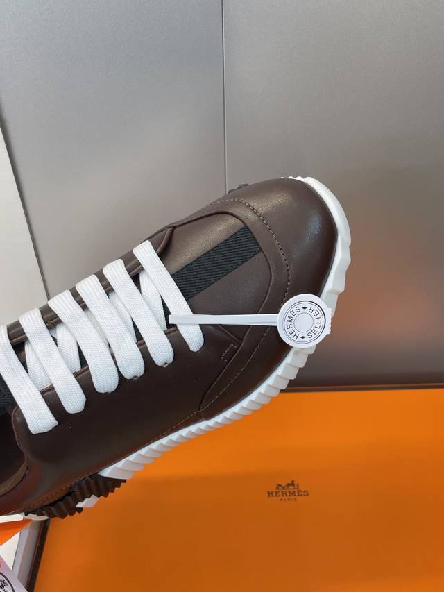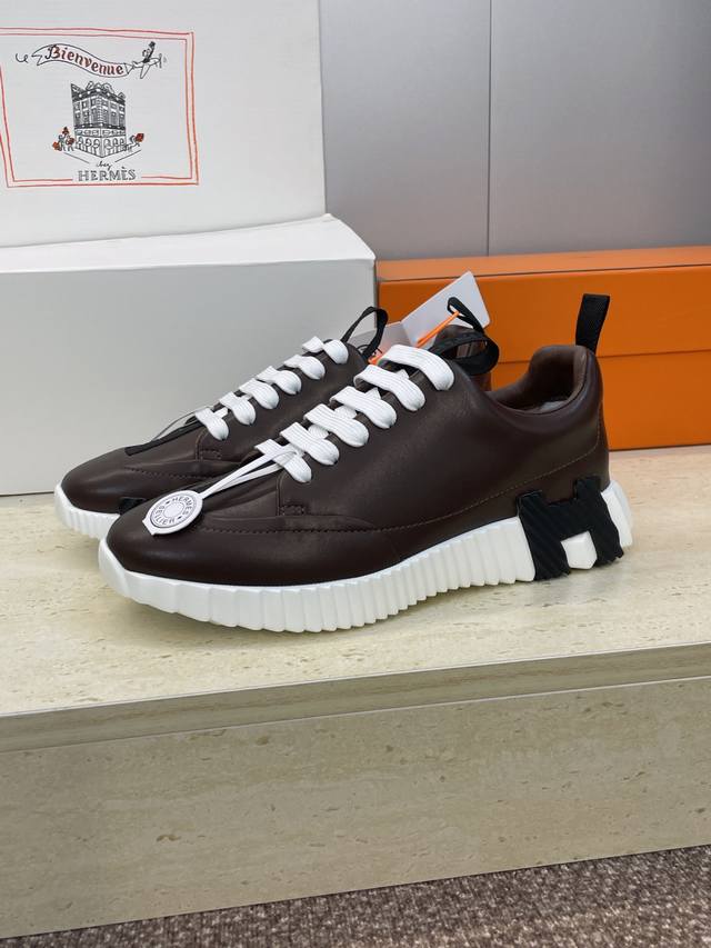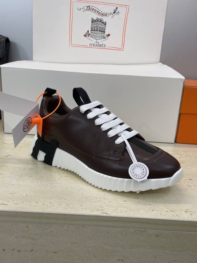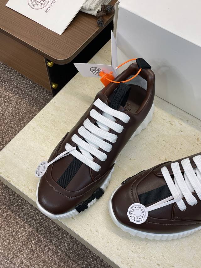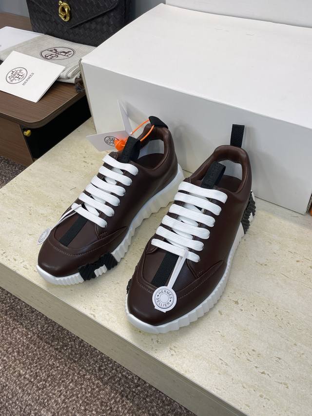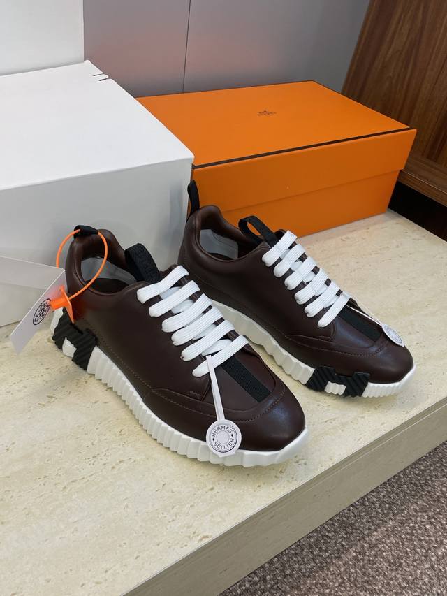 Factory direct price, comes with a full set of airplane boxes. Top-quality Hermes 2025 Fall/Winter classic couple's Bounching casual lace-up sneakers, H-brand thick-soled fashionable color-blocked running shoes. Material: Imported calfskin upper + water-dyed sheepskin lining + original molded outsole. Sole thickness: 2.5cm. Size: Women's sizes 35-42, 40, 41, 42 (custom sizes, no returns/exchanges); Men's sizes 39-46, 39, 46 (custom sizes, no returns/exchanges).