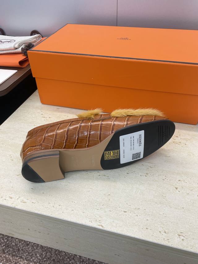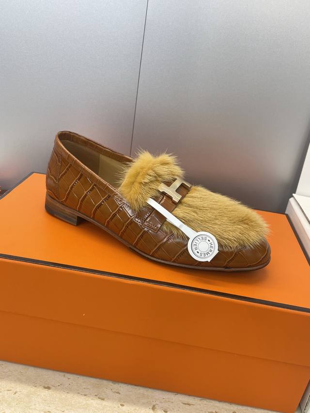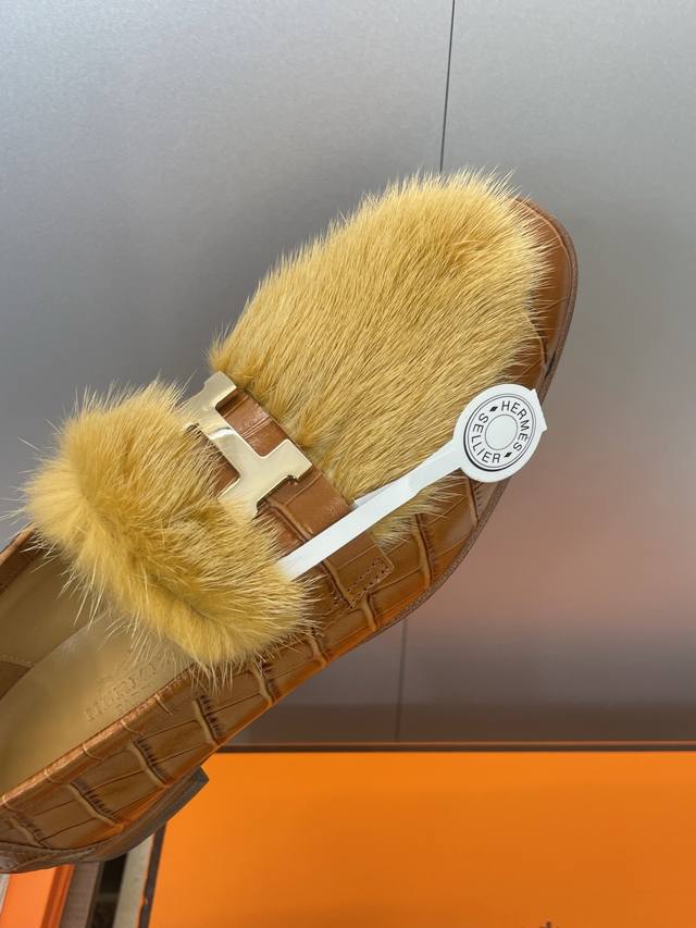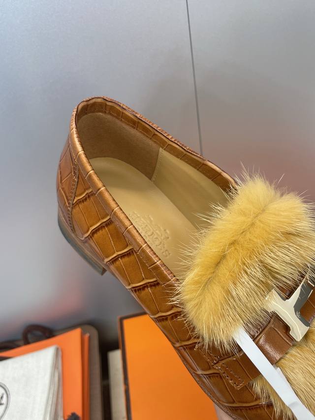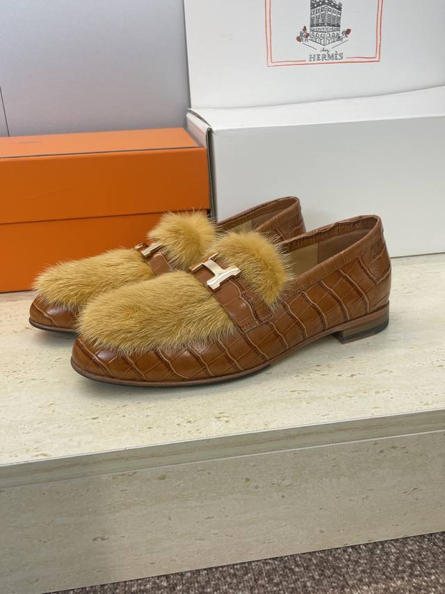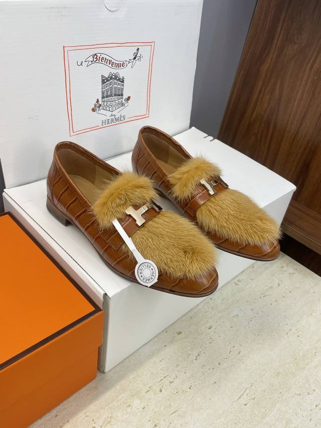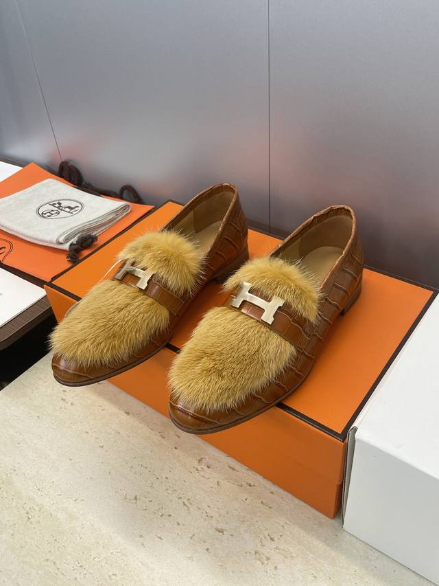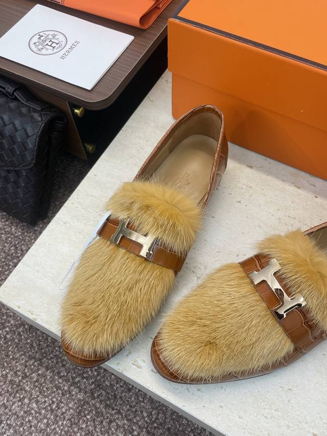 Factory direct price. Dongguan-made Hermes 2025 Autumn/Winter New Royal Color Block Low-Heeled Lambswool Ballet Flats with Hermes Logo, Hardware Buckle, Flat Round Toe, Warm and Stylish. Material: Imported calfskin, imported suede, imported lambswool + water-dyed sheepskin lining + Italian genuine leather outsole. Size: 35-43 (34, 40, 41, 42, 43 - custom sizes, no returns or exchanges).