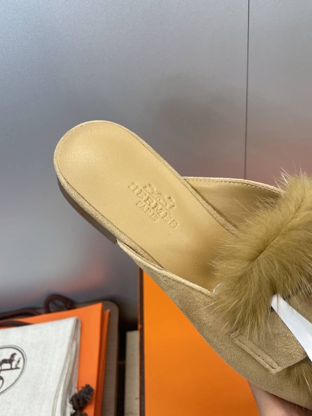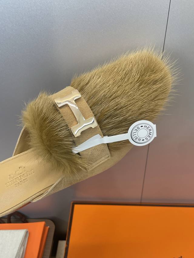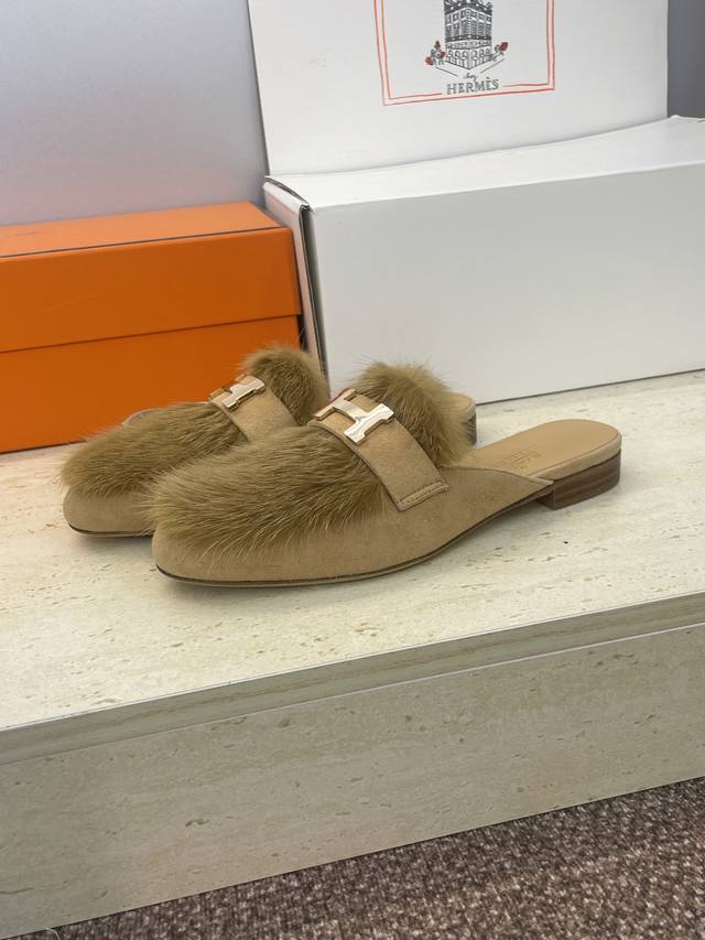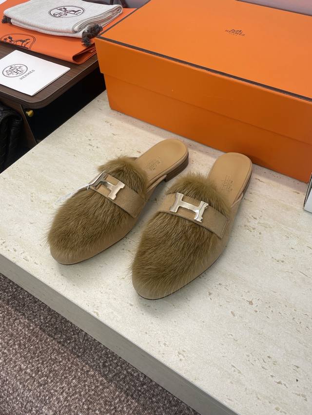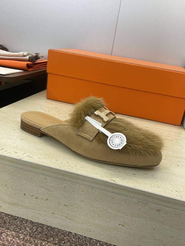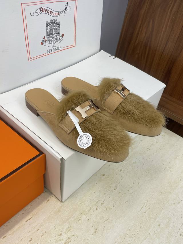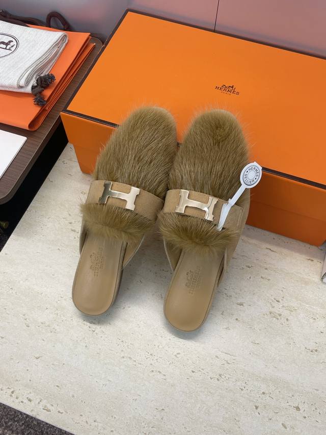 Factory direct price. Dongguan-made Hermes 2025 Autumn/Winter New Royal Color Block Low-Heel Lambswool Women's Shoes with Hermes Logo, Hardware Buckle, Flat Round Toe, Warm and Cold-Resistant Mule Slippers. Material: Imported calfskin, imported suede, imported lambswool + water-dyed sheepskin lining + Italian genuine leather outsole. Size: 35-43 (34, 40, 41, 42, 43 - Custom sizes, no returns or exchanges).