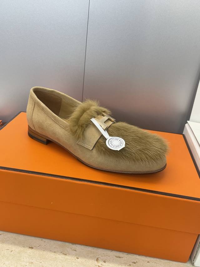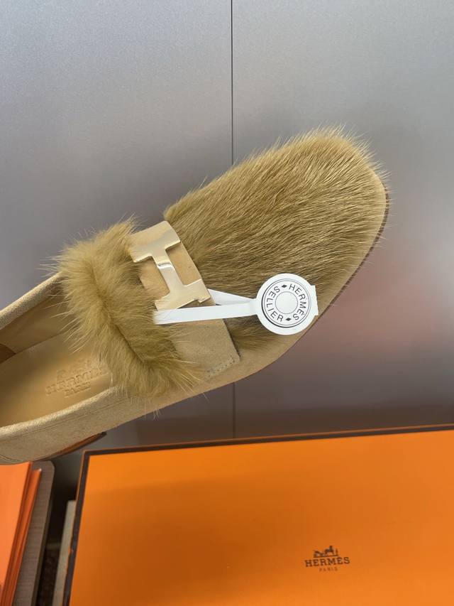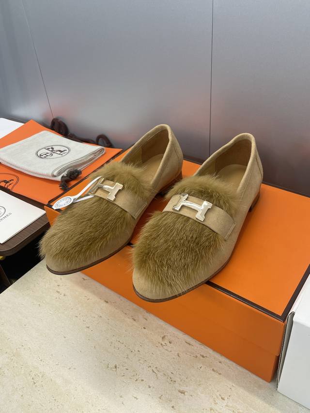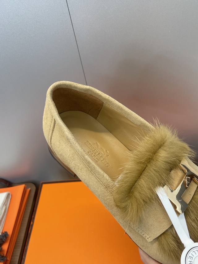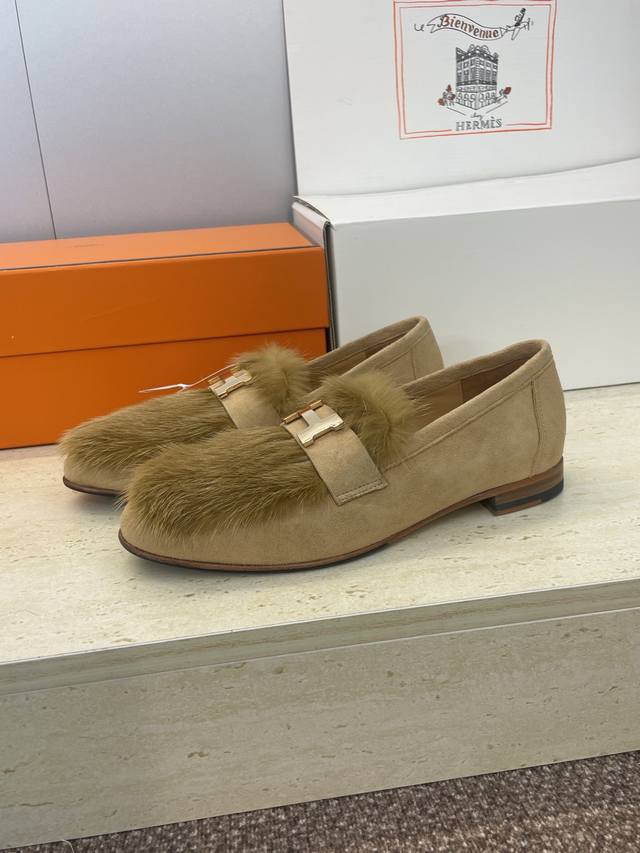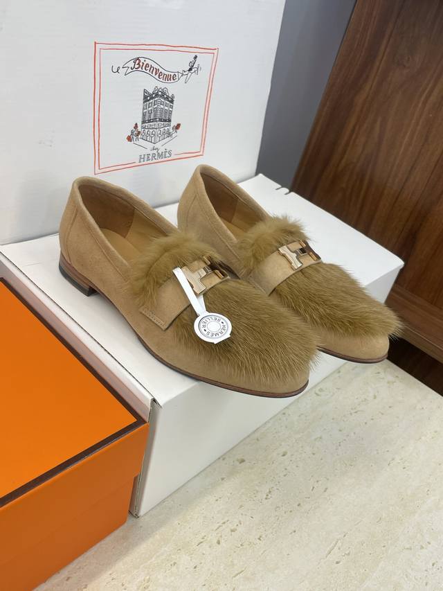 Factory direct price. Dongguan-made Hermes 2025 Autumn/Winter new Royal color-blocked low-heeled lamb wool ballet flats with Hermes logo, metal buckle, flat round toe, warm and comfortable. Material: Imported calfskin, imported suede, imported lamb wool + water-dyed sheepskin lining + Italian genuine leather outsole. Size: 35-43 (34, 40, 41, 42, 43 - custom sizes, no returns or exchanges).