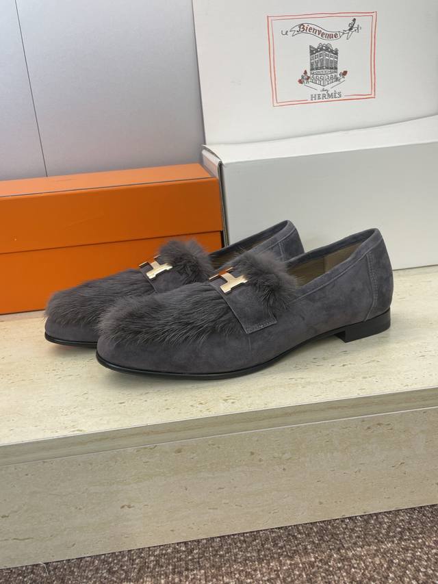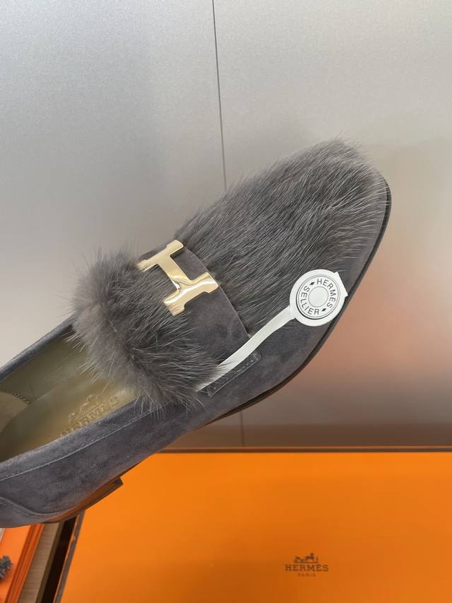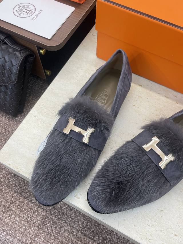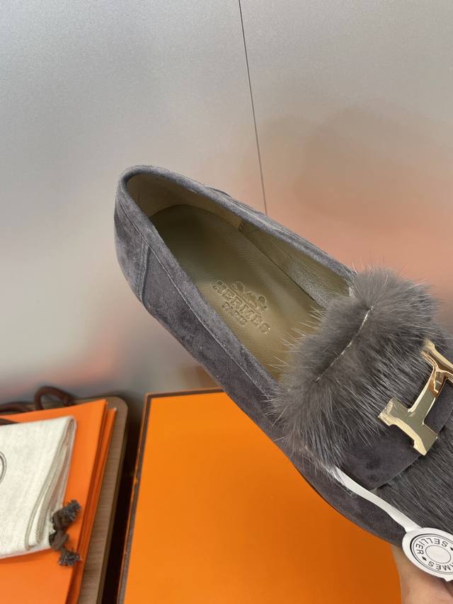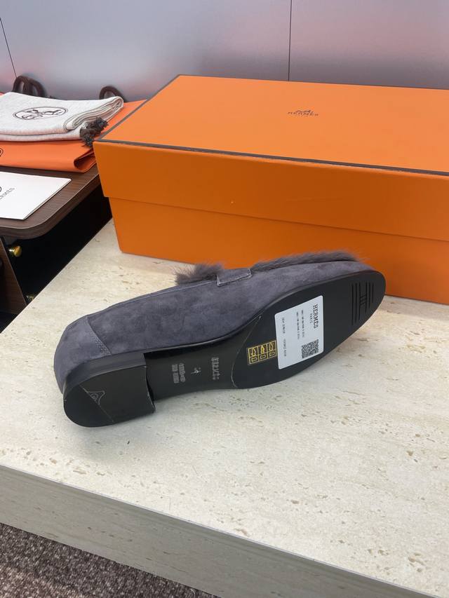 Factory direct price. Dongguan-made Hermes 2025 Autumn/Winter new Royal color-blocked low-heeled lamb wool ballet flats with Hermes logo, metal buckle, flat round toe, warm and comfortable. Material: Imported calfskin, imported suede, imported lamb wool + water-dyed sheepskin lining + Italian genuine leather outsole. Size: 35-43 (34, 40, 41, 42, 43 - custom sizes, no returns or exchanges).