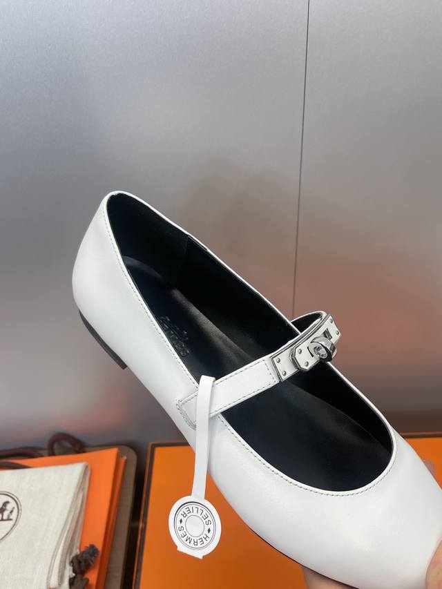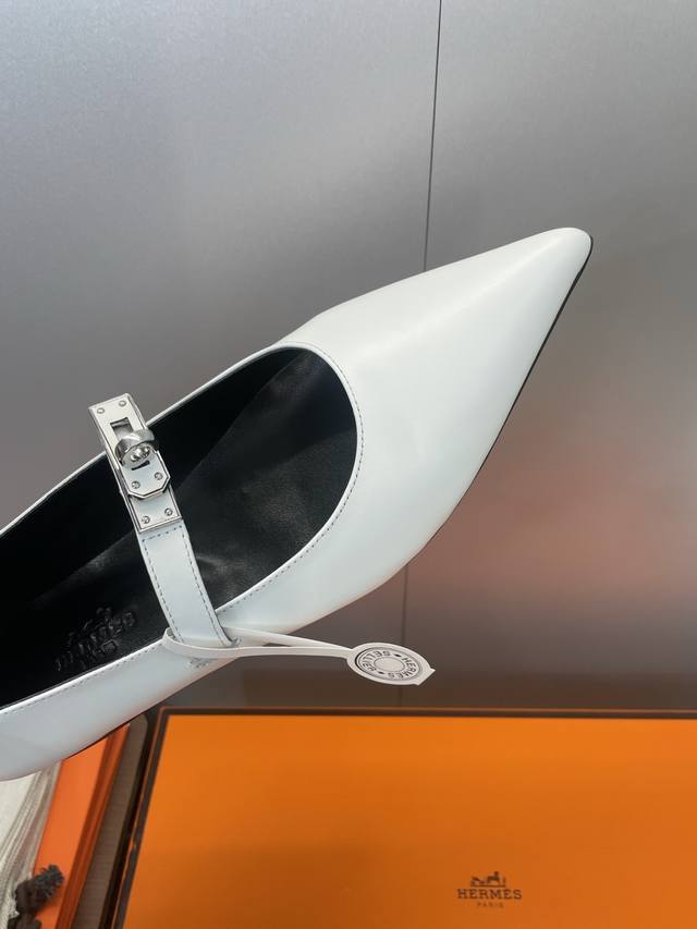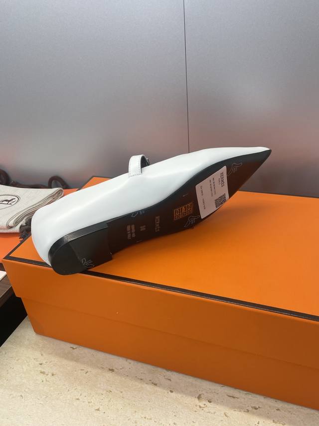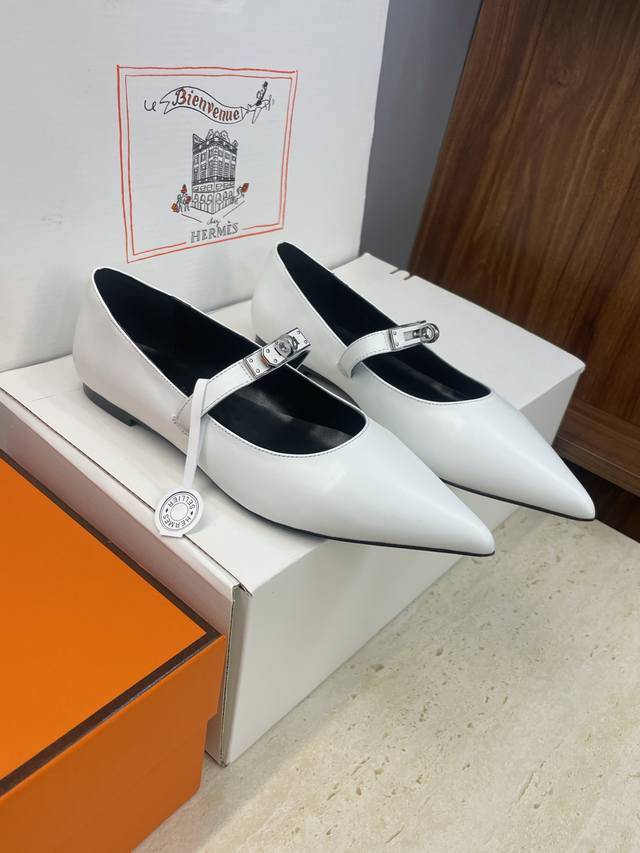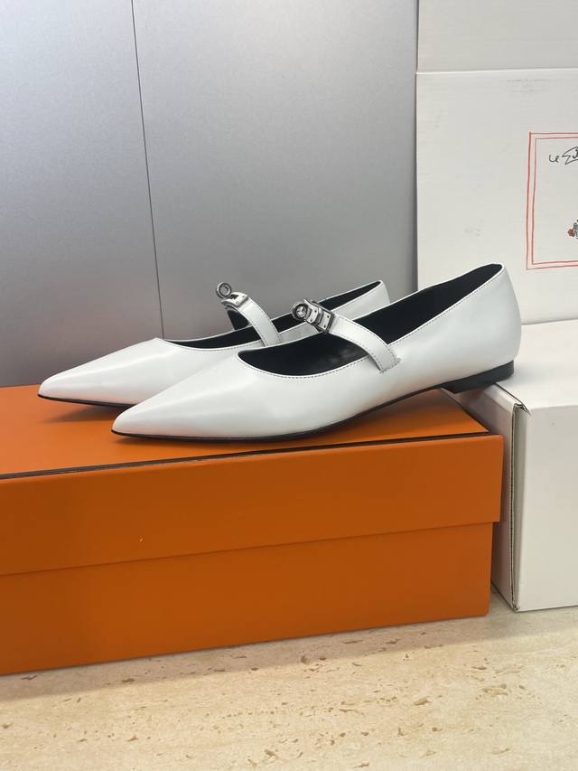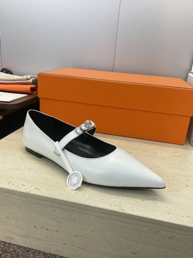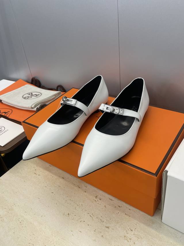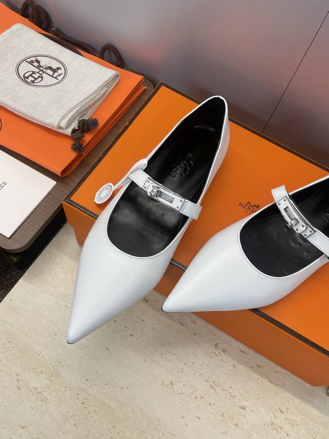 Factory direct price. Dongguan-made, high-quality Hermes 2025 Autumn/Winter new Lover color-block women's shoes, classic Kelly design with hardware and leather belt, flat pointed toe, elegant style. Material: Imported calfskin upper + water-dyed sheepskin lining + Italian genuine leather outsole. Size: 34-43 (34, 40, 41, 42, 43 - custom sizes, no returns or exchanges).