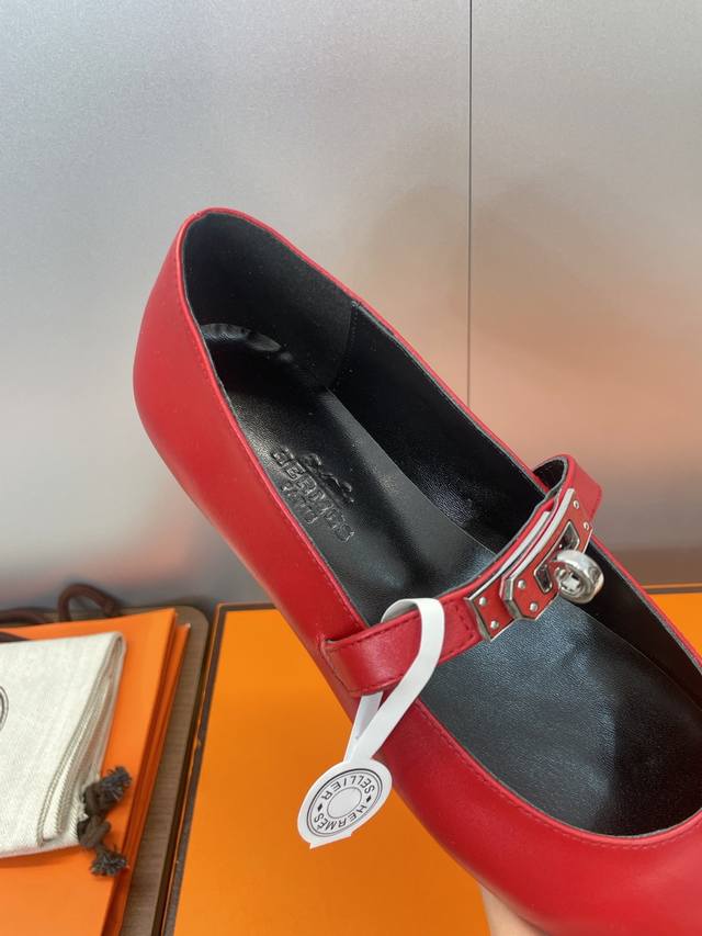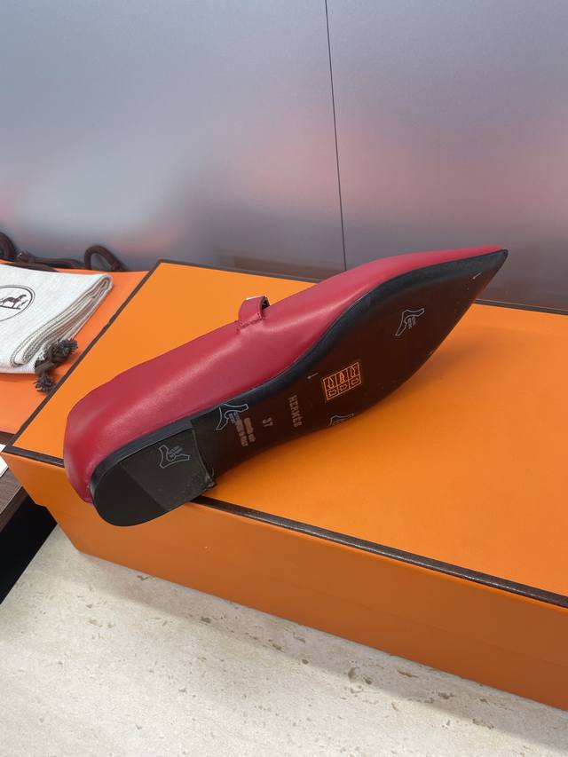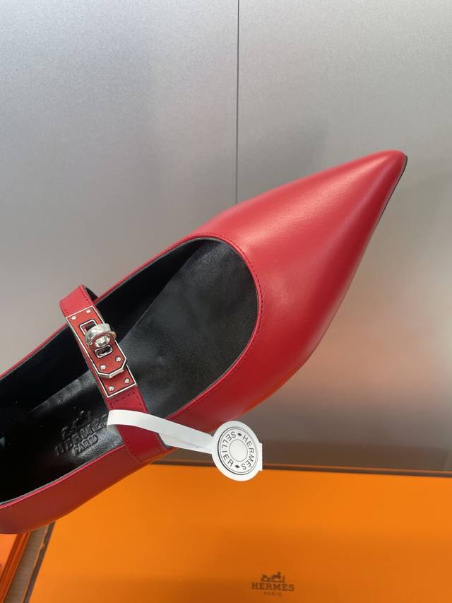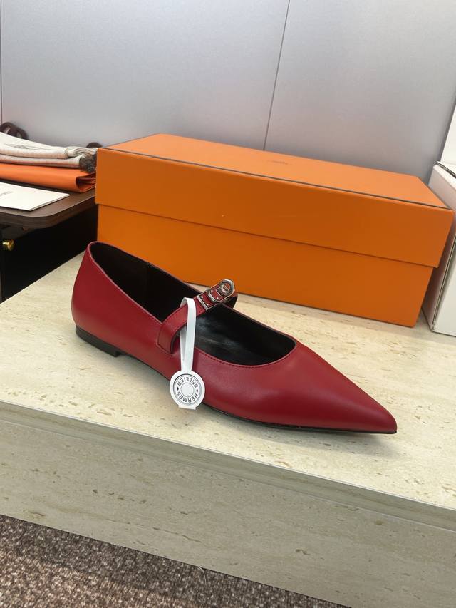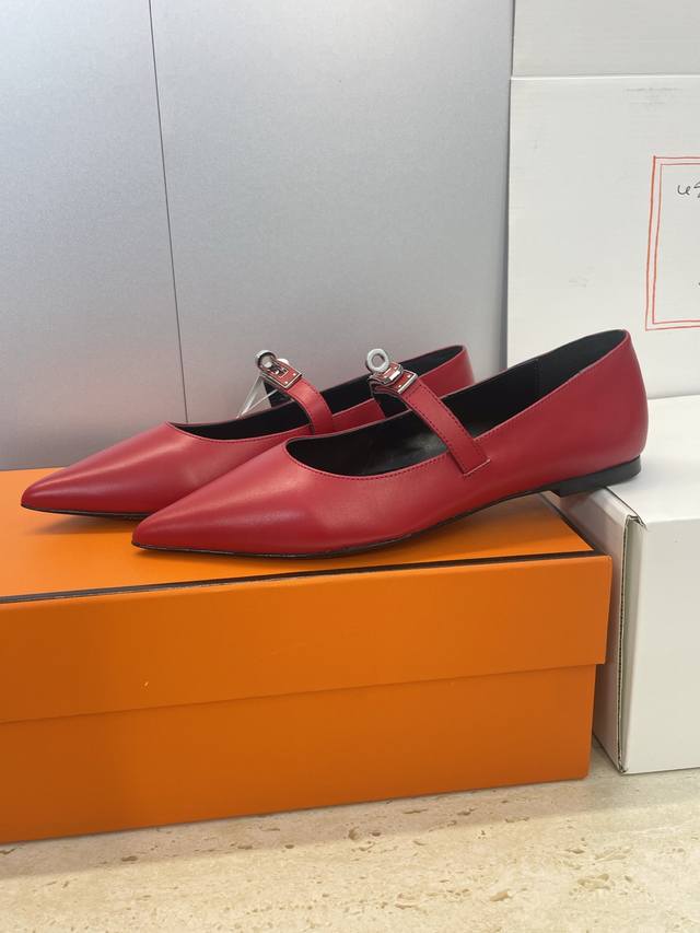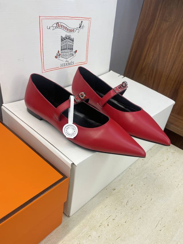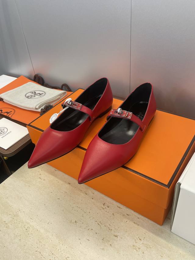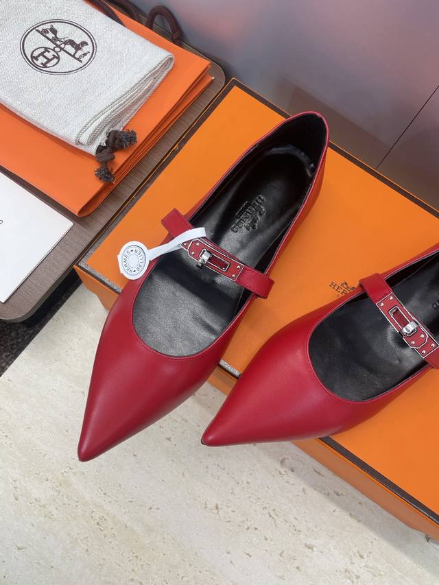 Factory direct price. Dongguan-made, high-quality Hermes 2025 Autumn/Winter new Lover color-block women's shoes, classic Kelly design with hardware and leather belt, flat pointed toe, elegant style. Material: Imported calfskin upper + water-dyed sheepskin lining + Italian genuine leather outsole. Size: 34-43 (34, 40, 41, 42, 43 - custom sizes, no returns or exchanges).