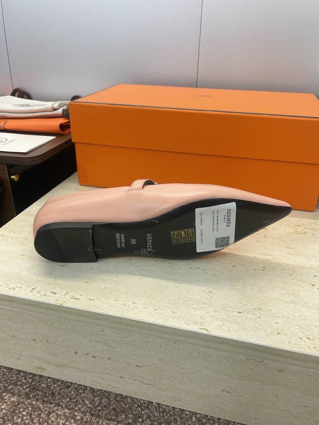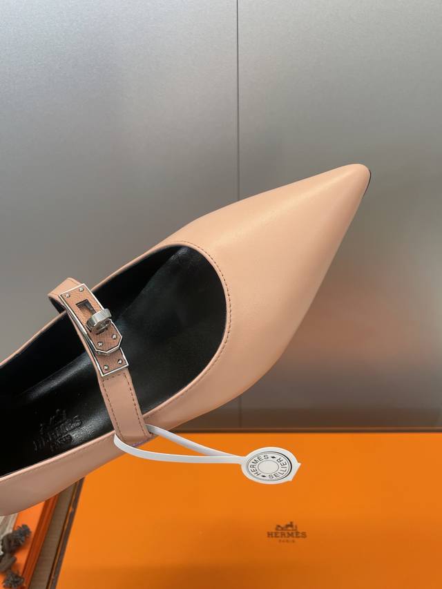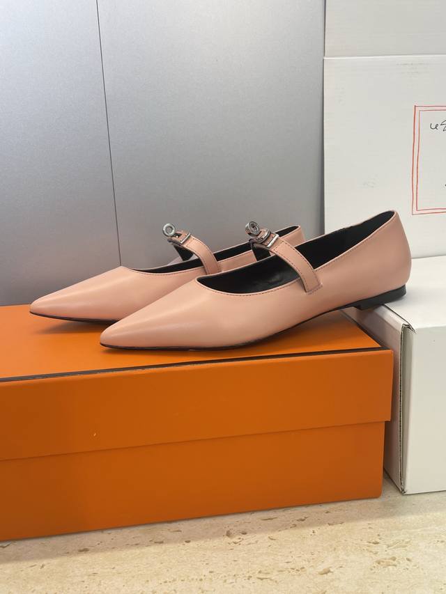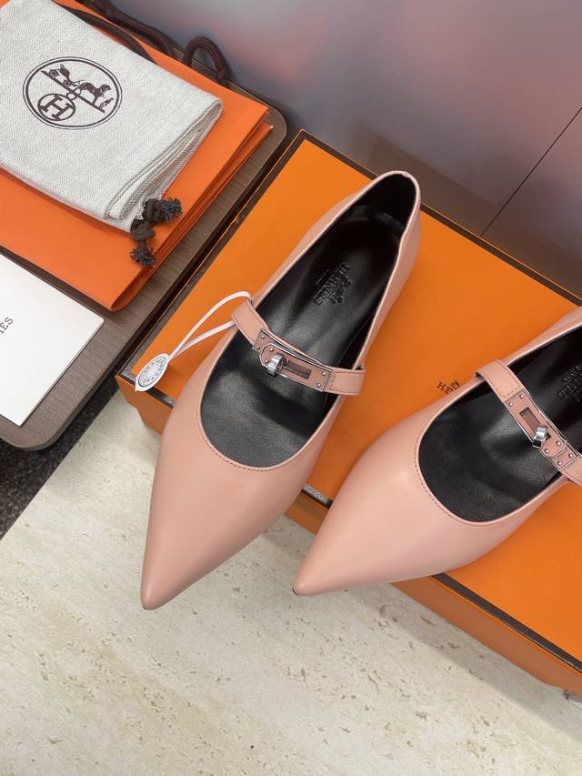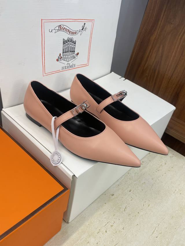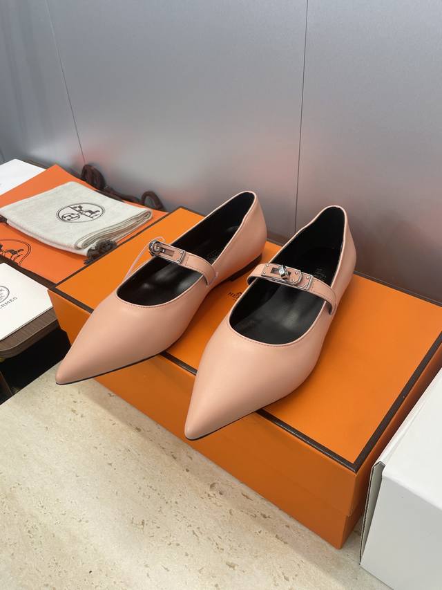 Factory direct price. Dongguan-made, high-quality Hermes 2025 Autumn/Winter new Lover color-block women's shoes, classic Kelly design with hardware and leather belt, flat pointed toe, elegant style. Material: Imported calfskin upper + water-dyed sheepskin lining + Italian genuine leather outsole. Size: 34-43 (34, 40, 41, 42, 43 - custom sizes, no returns or exchanges).