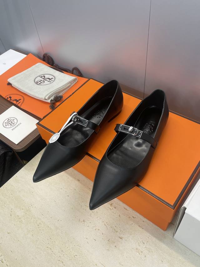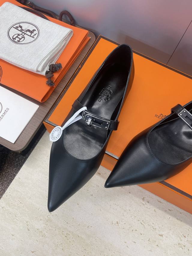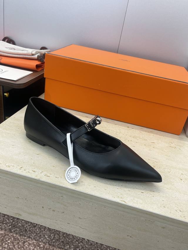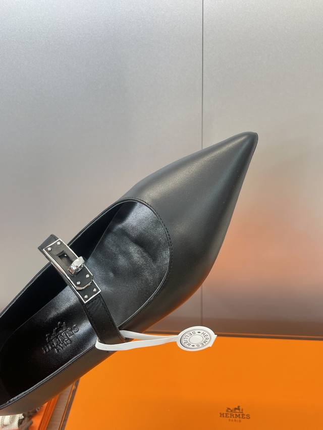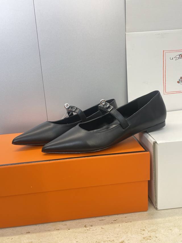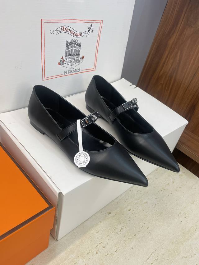 Factory direct price. Dongguan-made, high-quality Hermes 2025 Autumn/Winter new Lover color-block women's shoes, classic Kelly design with hardware and leather belt, flat pointed toe, elegant style. Material: Imported calfskin upper + water-dyed sheepskin lining + Italian genuine leather outsole. Size: 34-43 (34, 40, 41, 42, 43 - custom sizes, no returns or exchanges).