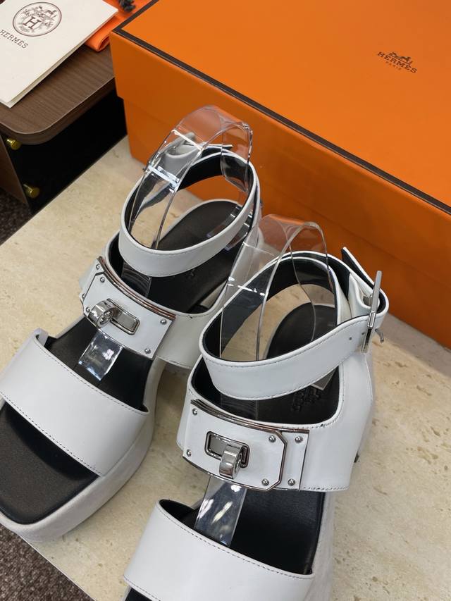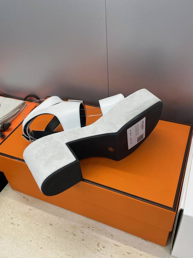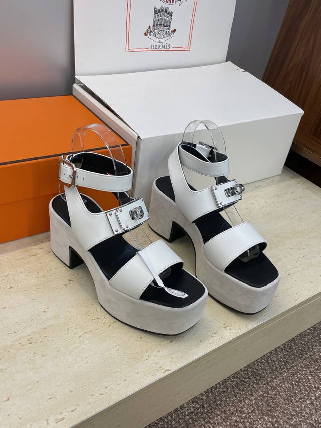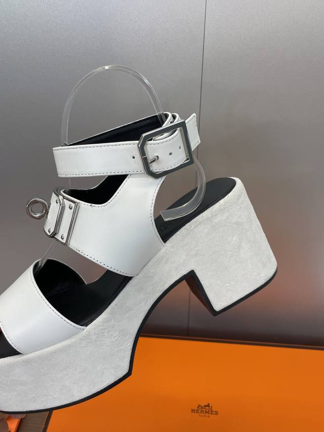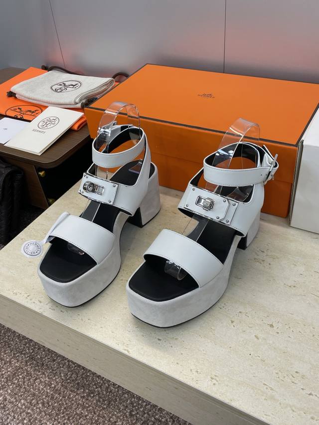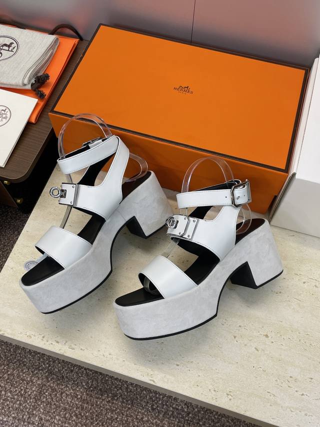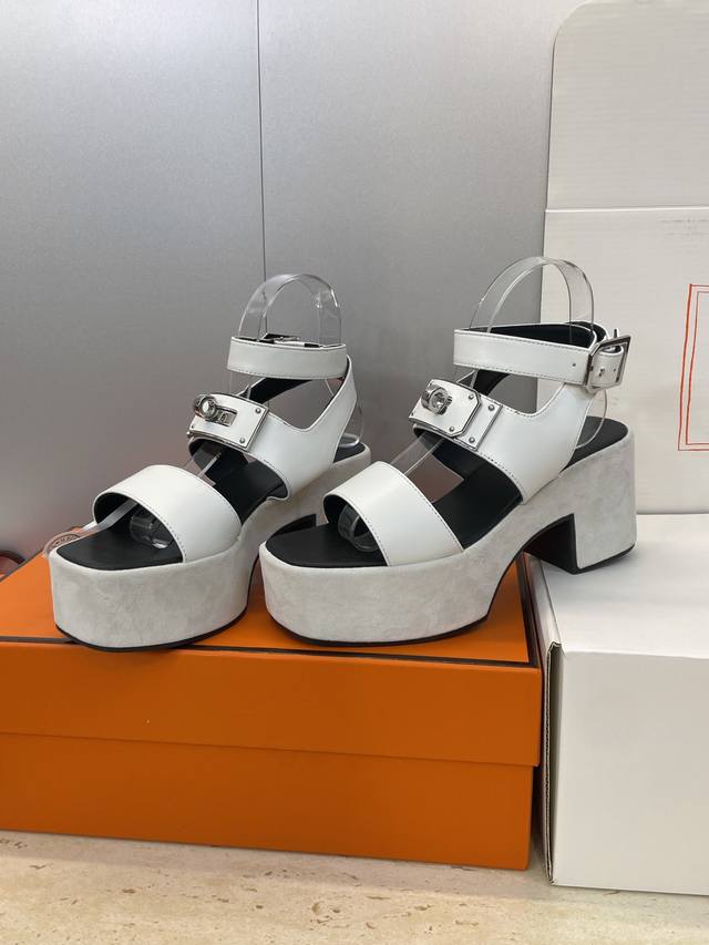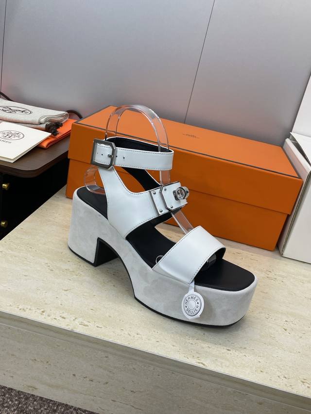 Factory direct price. Dongguan-made, high-quality Hermes 2025 Spring/Summer new Kelly buckle Lola color-blocked chunky heel women's shoes, H-brand high-heeled platform sandals with round toe and Roman style cross straps. Material: Imported calfskin upper, imported suede + water-dyed cowhide lining + original molded outsole. Heel height: 7.5cm. Platform: 3.5cm. Size: 34-43 (34, 40, 41, 42, 43 - custom sizes, no returns or exchanges).