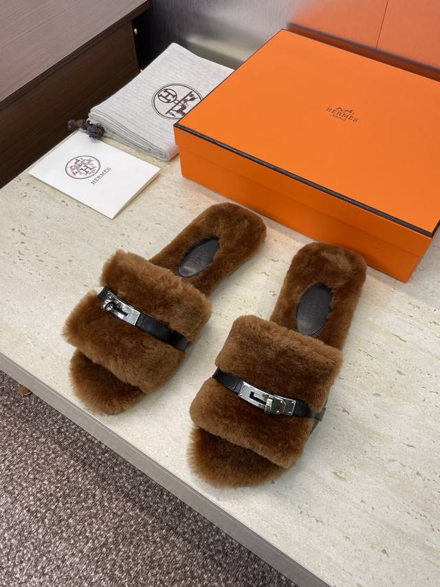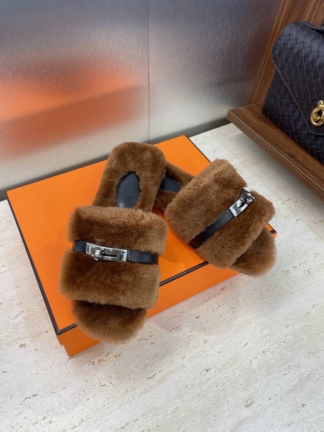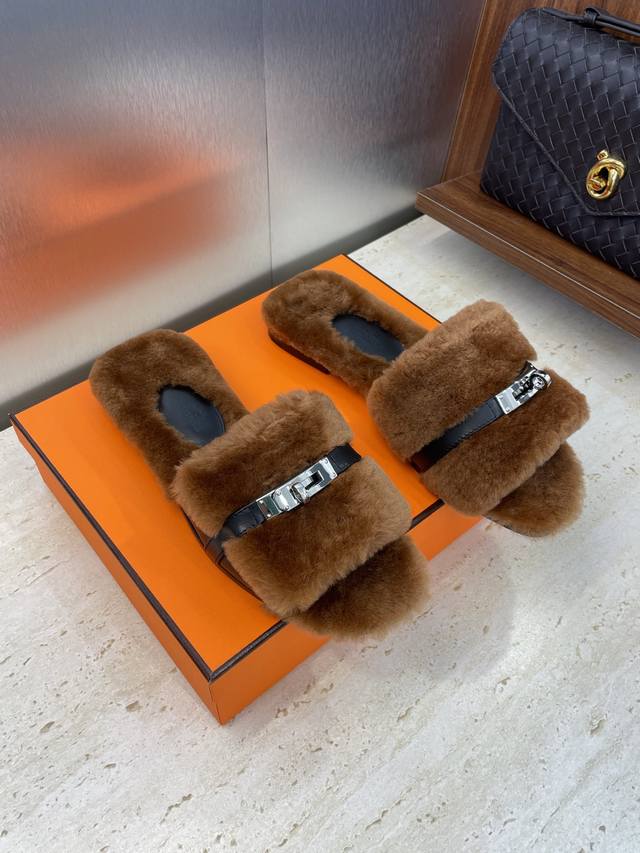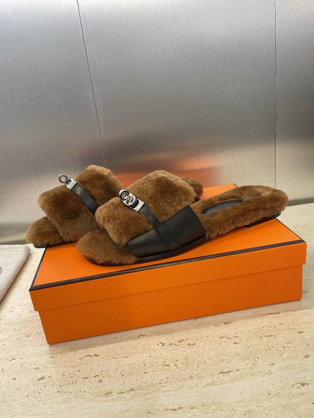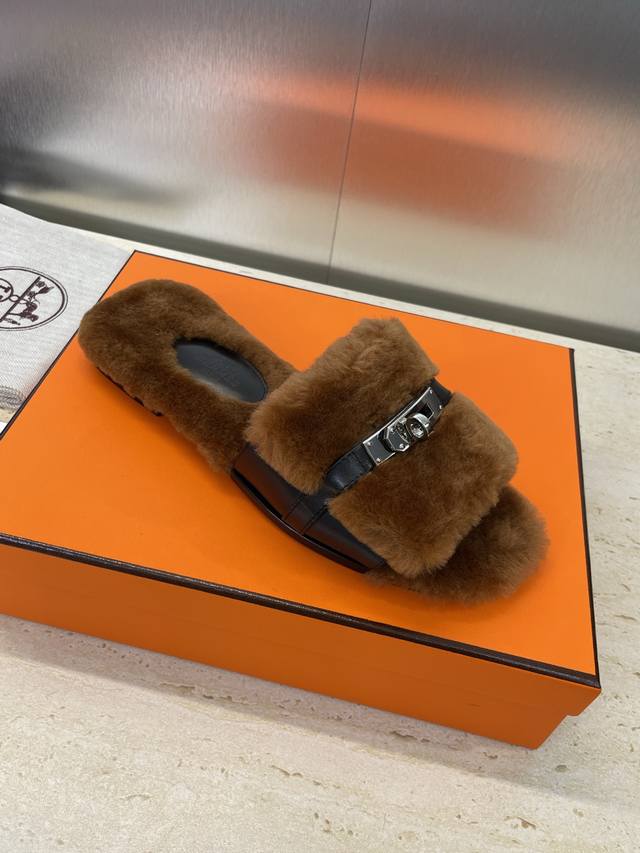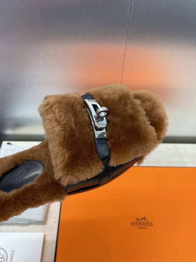 Factory direct price. Hermes 2025 Autumn/Winter new Giulia punk style color-blocked furry women's shoes, flat Kelly style with metal buckle, round toe, open-toe lounge shoes. Material: Imported calfskin upper, imported lambskin + lambskin lining + Italian genuine leather outsole. Size: 35-43, 40, 41, 42, 43. Custom orders are non-refundable.