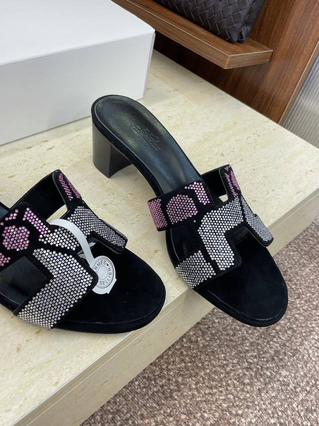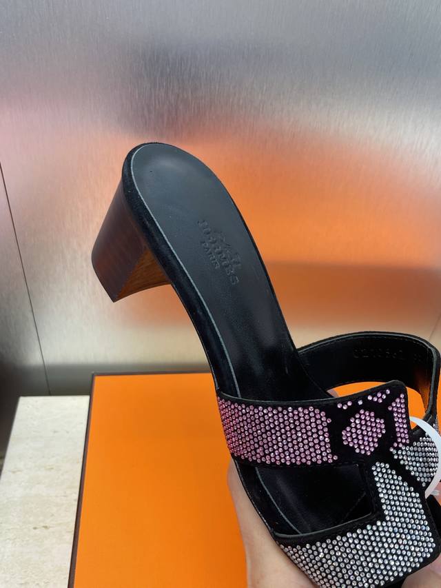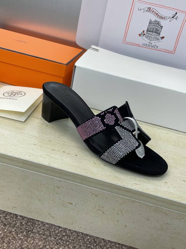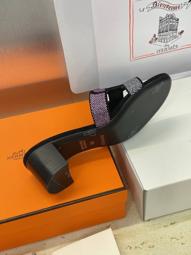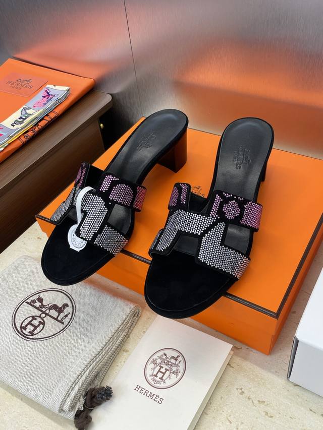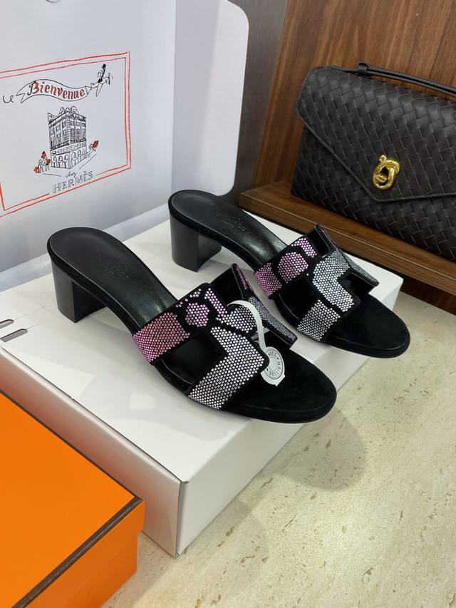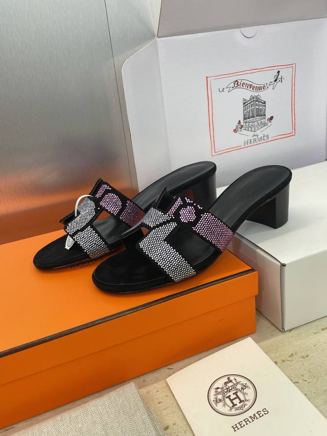 Dongguan goods purchasing Hermes 2025 Spring and Summer new color classic Oran thick heel color matching flip flops rhinestone women's shoes H family flat round toe open toe sandals