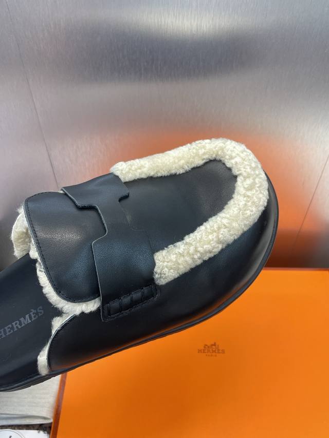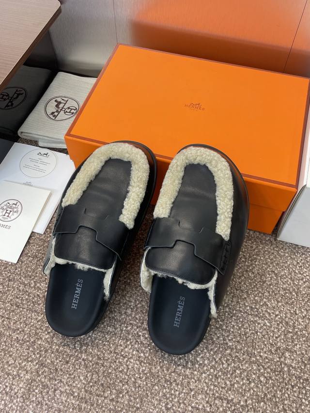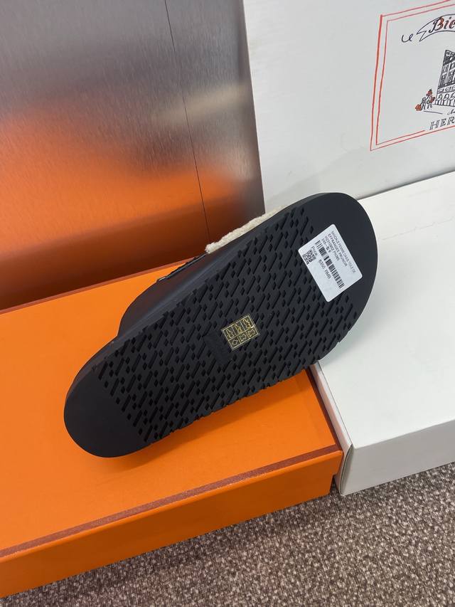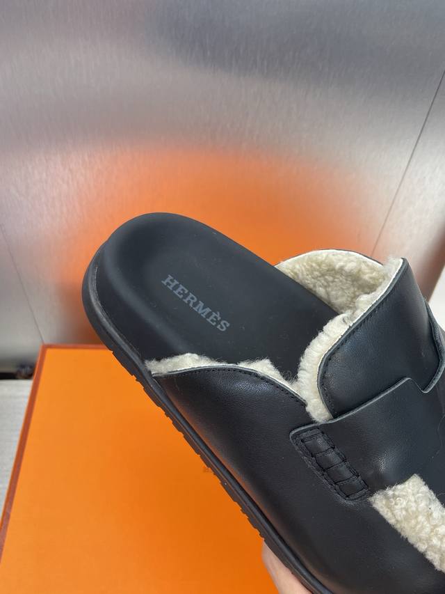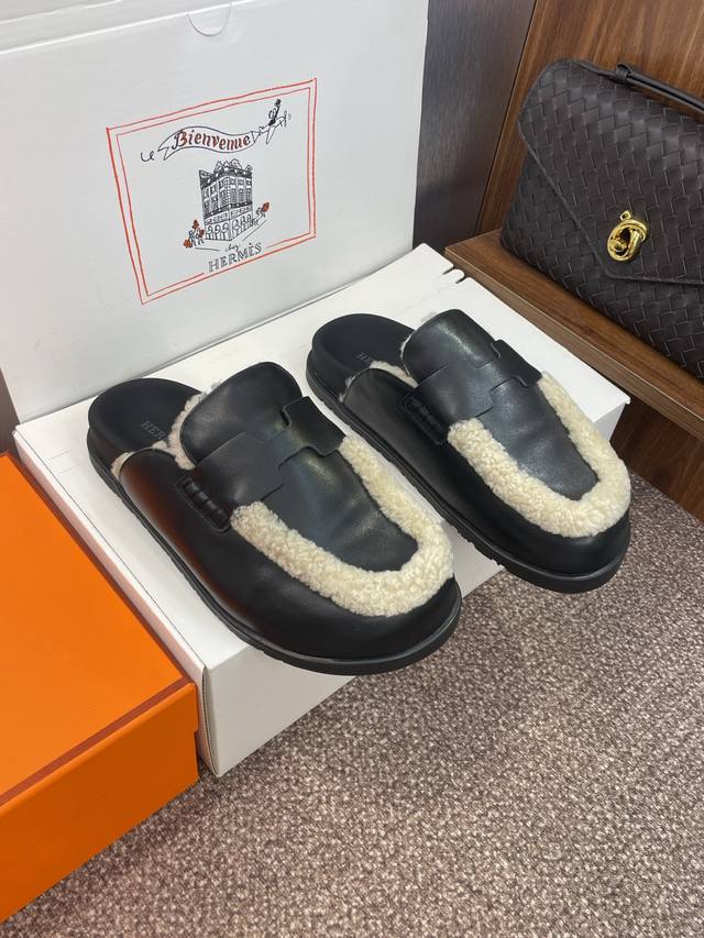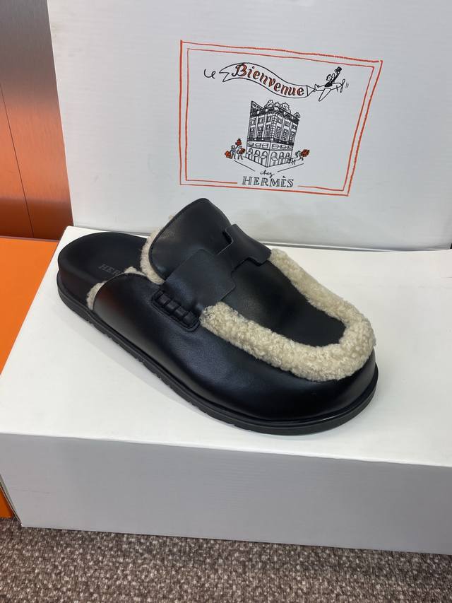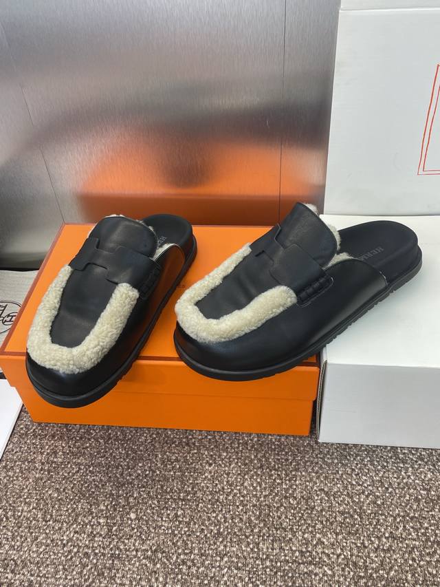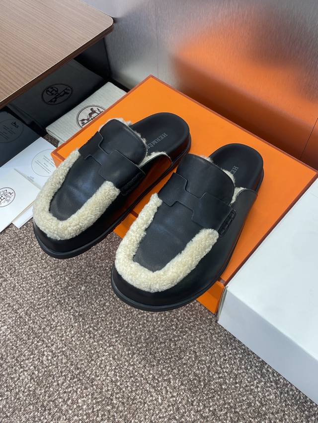 Dongguan goods purchasing Hermes Autumn and Winter Classic Go Colorblock Fur Women's Shoes H Home Flat Round Toe Mule Slippers