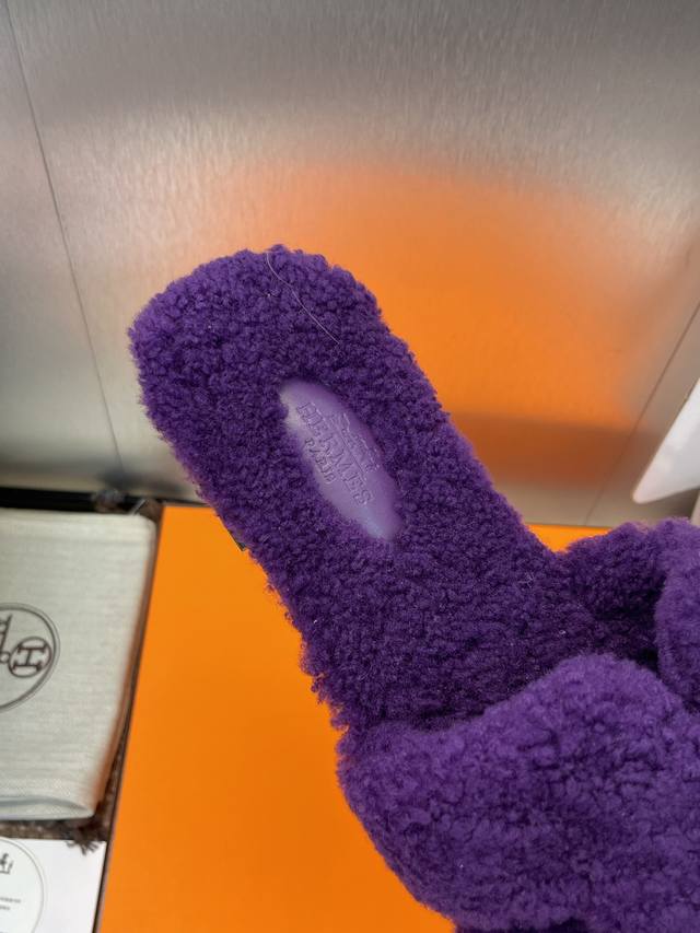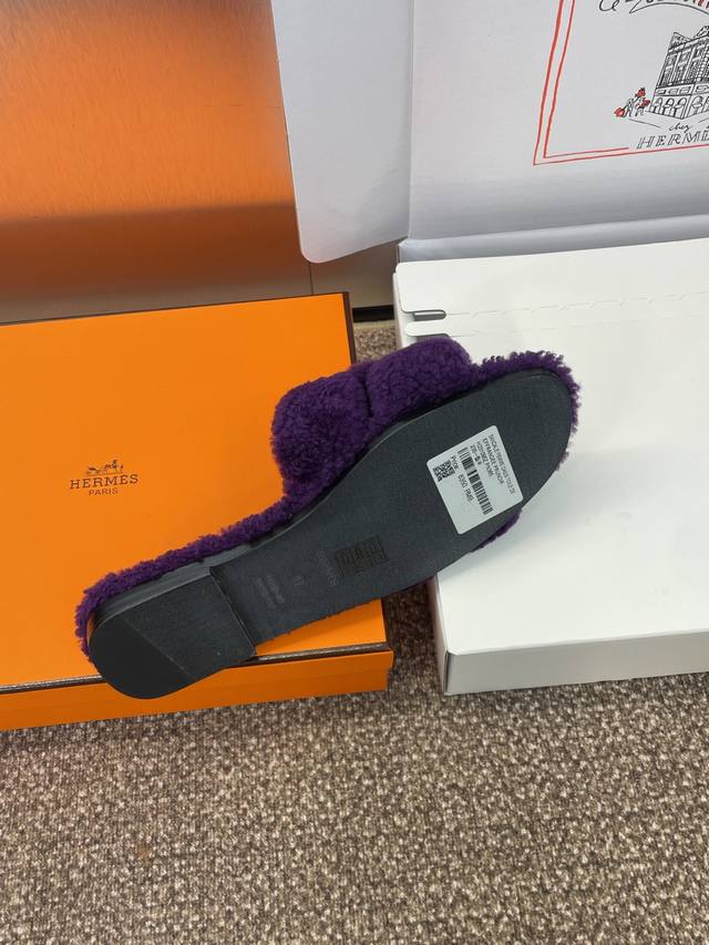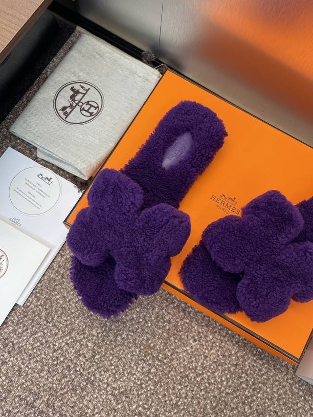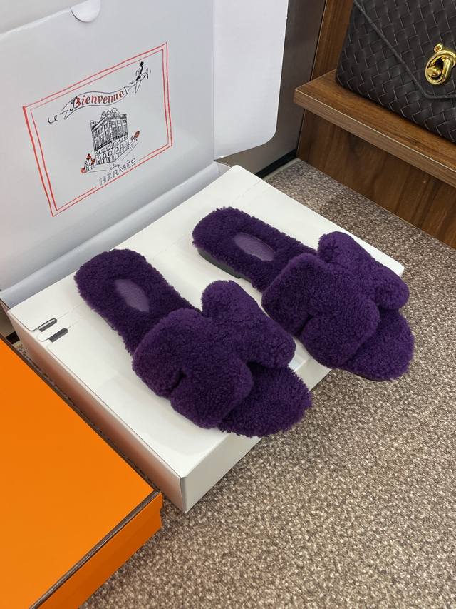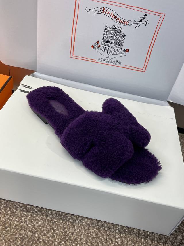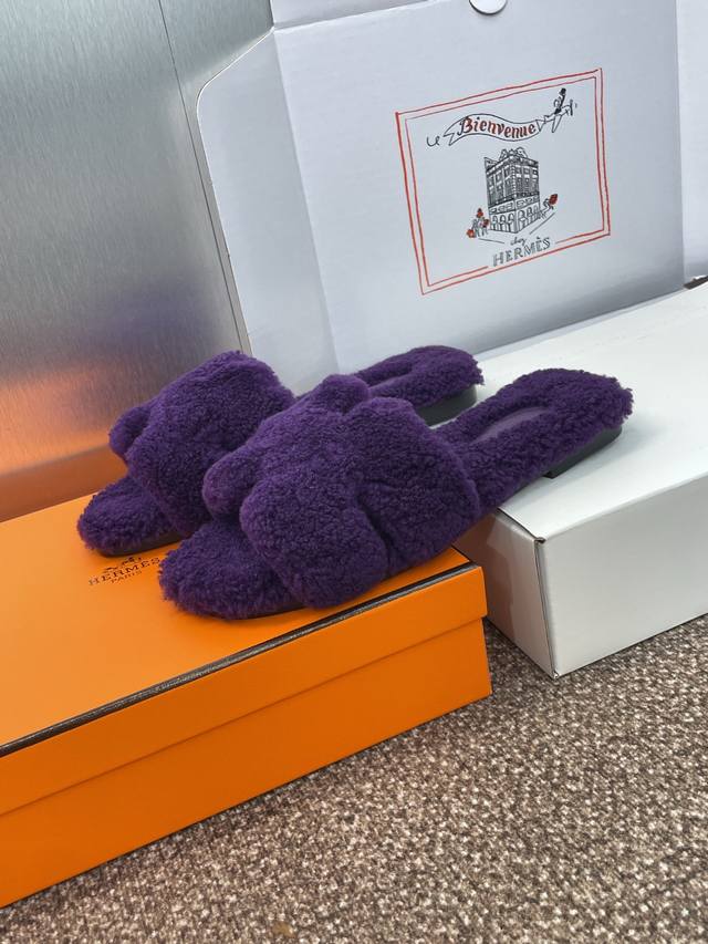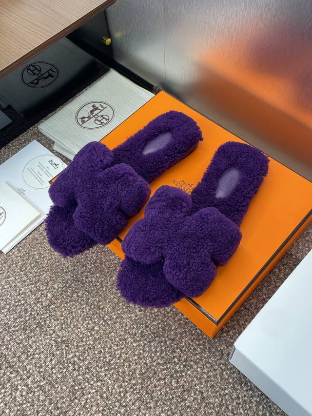 Dongguan goods purchasing Hermes autumn and winter classic Oran candy color flip flops women's shoes H family classic flat round toe open toe lamb wool slippers