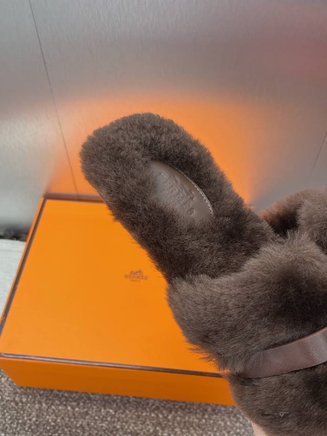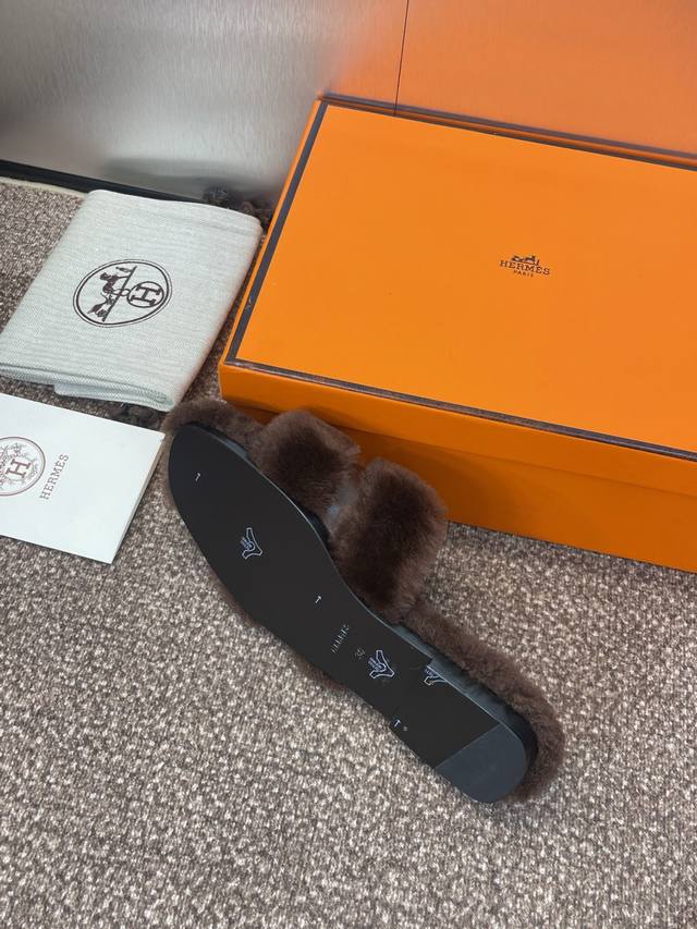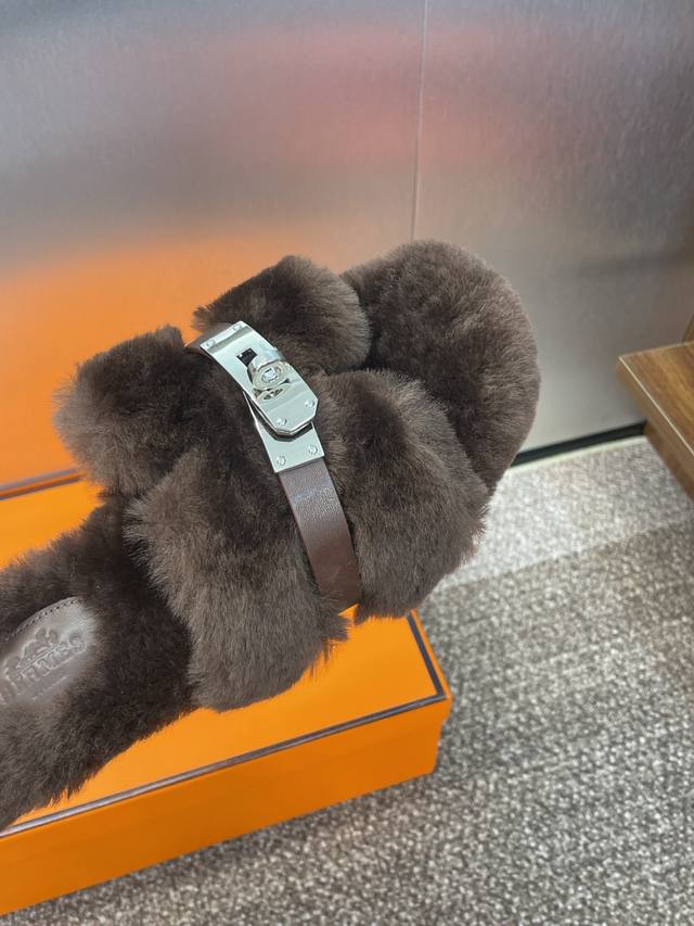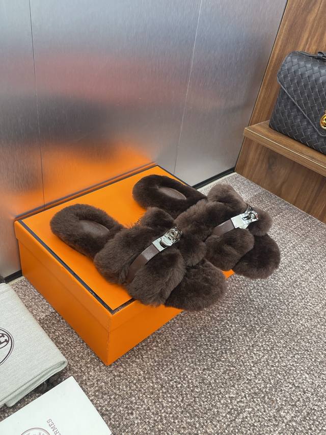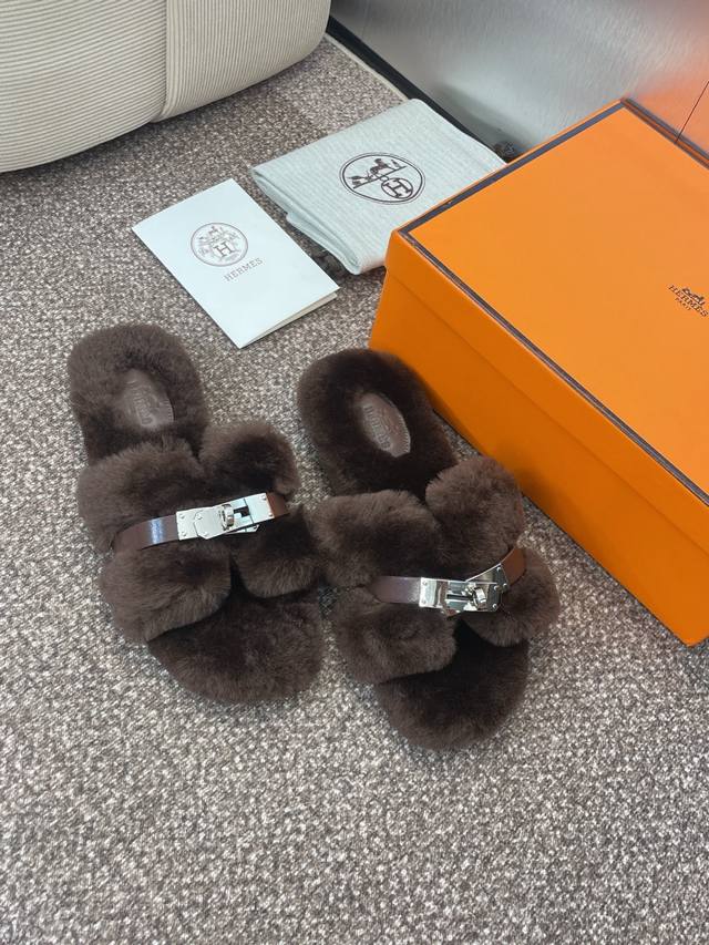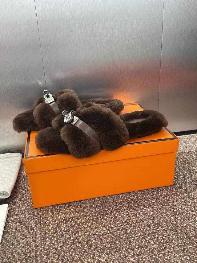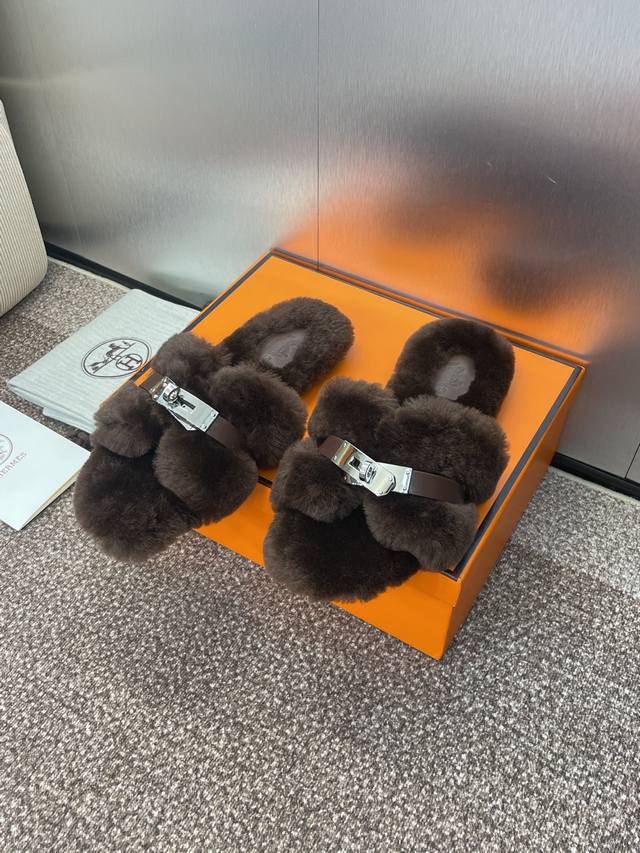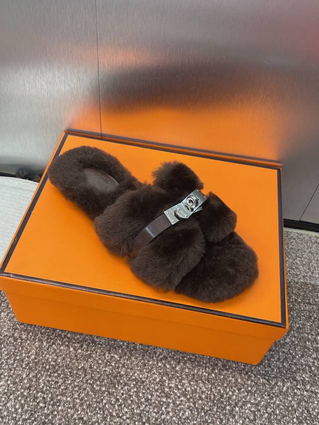 Hermes Autumn and Winter Classic Oran Candy Color Flip Flops Women's Shoes H House Classic Kelly Buckle Flat Round Toe Open Toe Lambswool Slippers