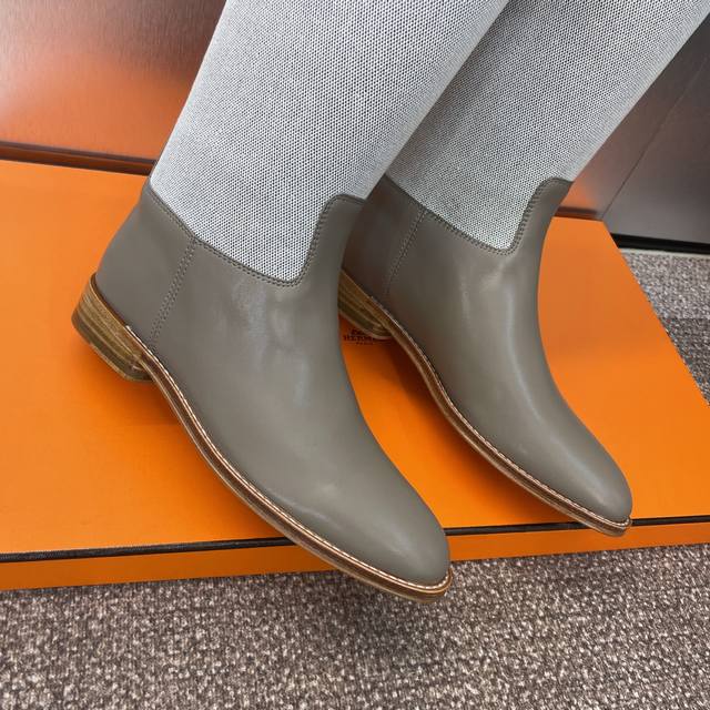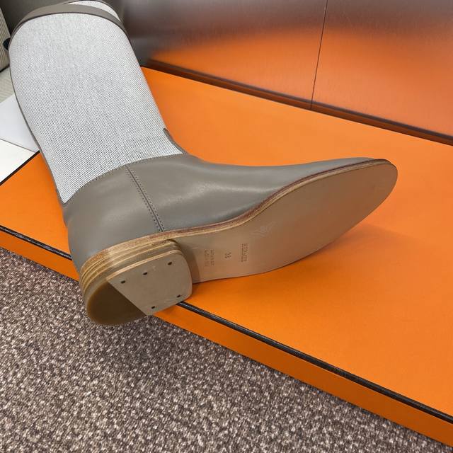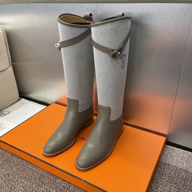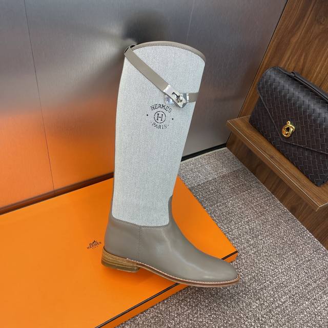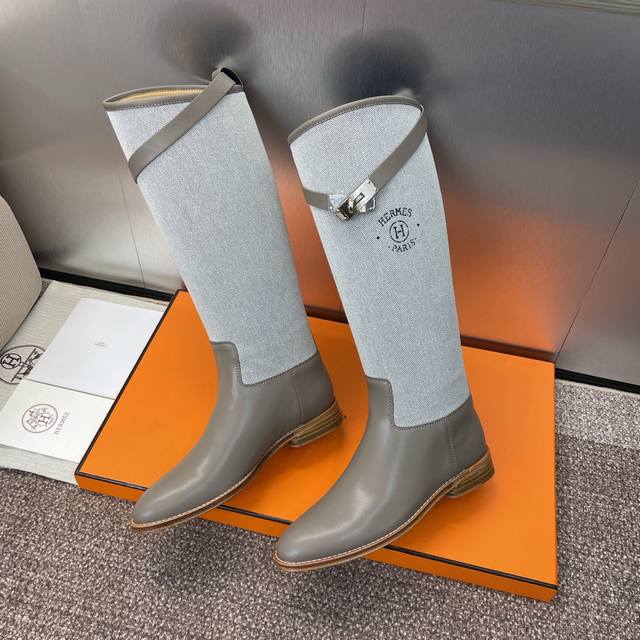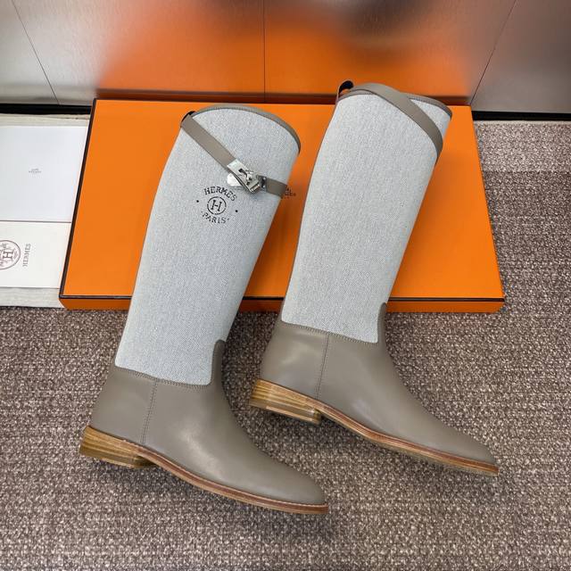 Hermes Classic Series Box Jumpling Punk Style Kelly Buckle Low Heel High Knee-High Colorblocked Women's Boots H House Celebrity Same Letter Logo Round Toe Slip-On Motorcycle Knight Military Boots