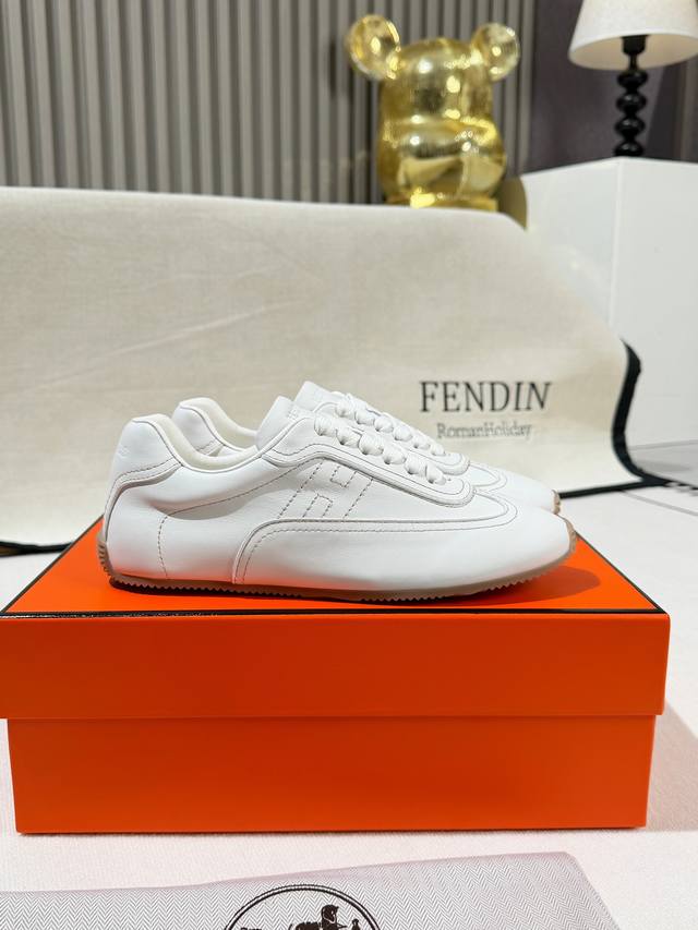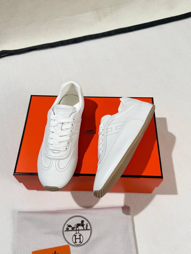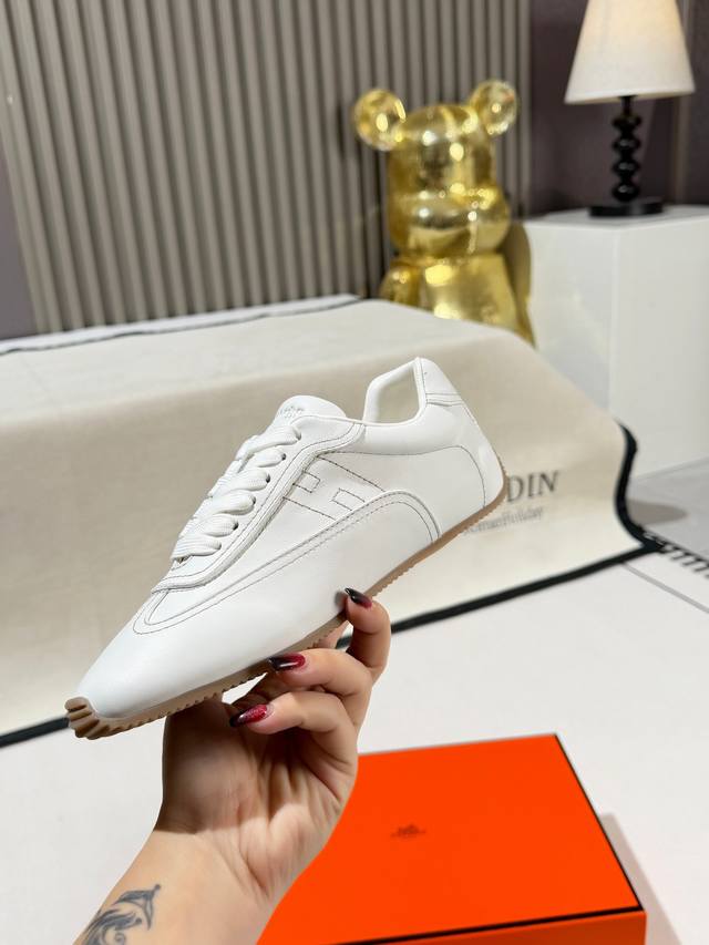 Factory Price: Hermes 2026 Early Spring New Arrival Master Sneakers. The upper is made of original 1:1 soft calfskin paired with a honey-colored thin rubber sole for a retro and minimalist style. The sheepskin lining is soft and comfortable. A must-have item for spring outfits. Colors: Black, White, Brown. Sizes: 35-40. Factory direct supply.