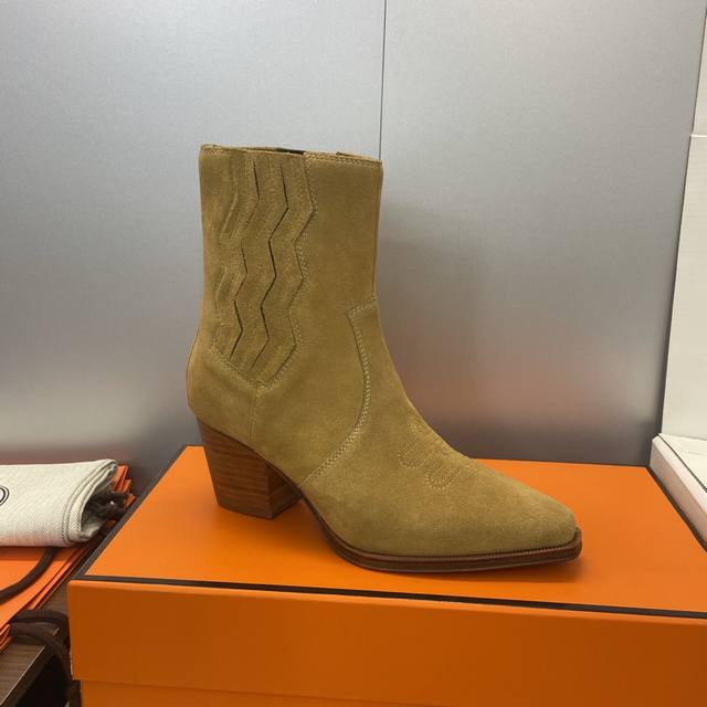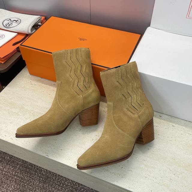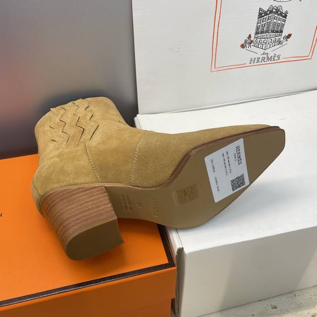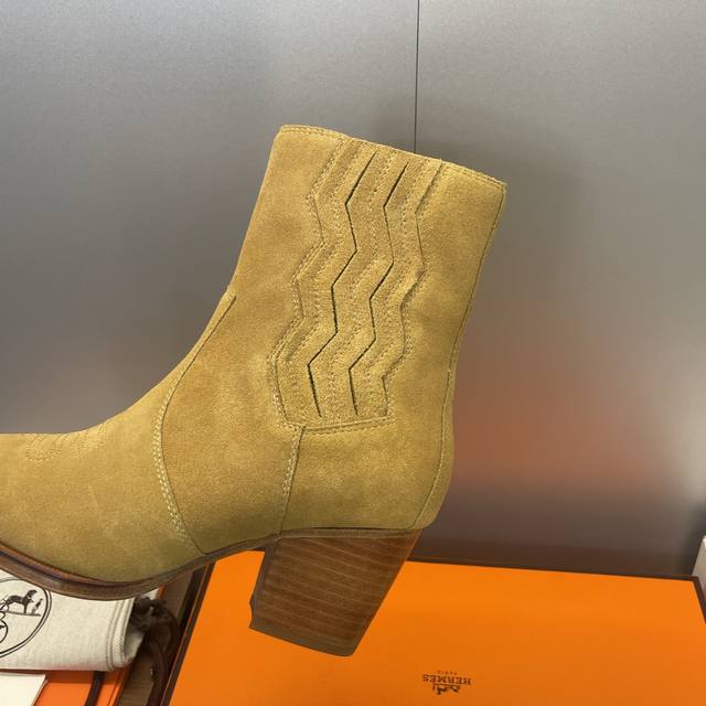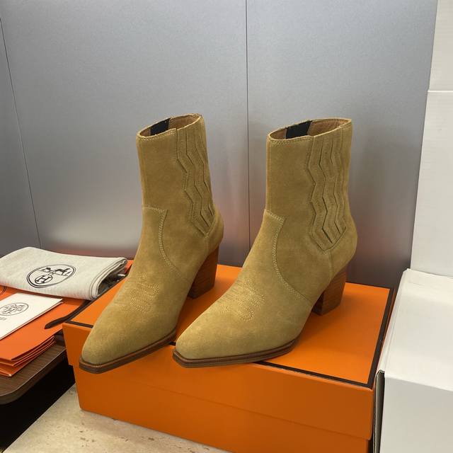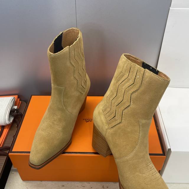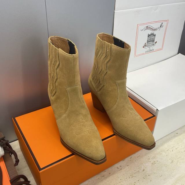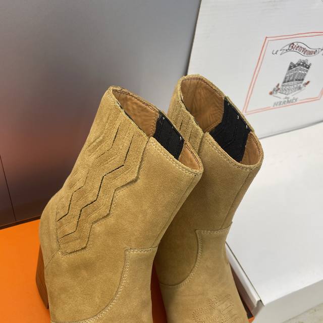 Factory price, no shipping box. Dongguan-made Hermes 2025 Autumn/Winter New Lissa Chelsea Elastic Ankle Boots, featuring H-brand logo embroidery, chunky heel, pointed toe, and color-blocked motorcycle boots. Material: Imported calfskin upper, imported suede, water-dyed cowhide lining, Italian genuine leather outsole. Heel height: 5.5cm. Size: Women's sizes 34-42 (34, 40, 41, 42 - custom orders are non-refundable).