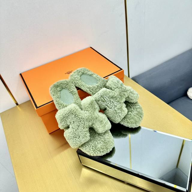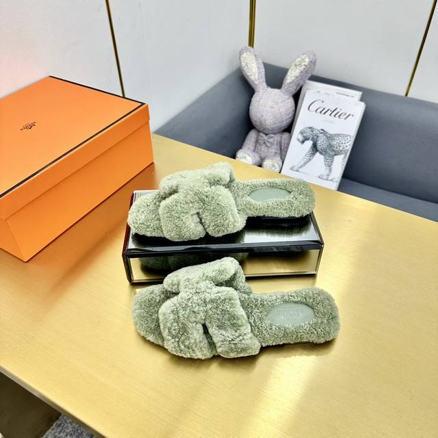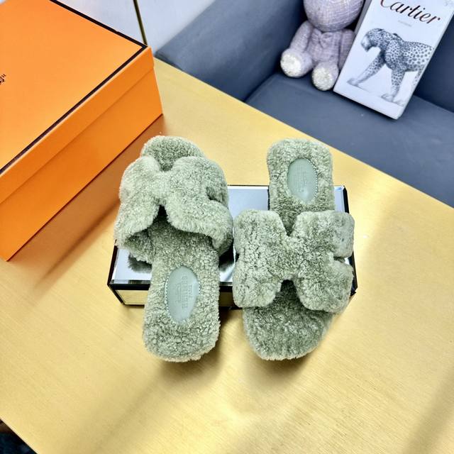 Hermes 2nd generation wool slippers (retailer quality). Available without tags: Note: Tagless slippers require custom orders. Latest color combinations and hot-selling Hermes styles are available on the official website and Xiaohongshu. Upgraded workmanship, high quality! Fashionable and trendy wool slippers, autumn/winter flat slippers. Fabric: Imported lambskin wool. Lining: Imported lambskin wool. Outsole: Genuine leather. Sizes: 35-43. Note: Sizes 41, 42, and 43 are custom-made.