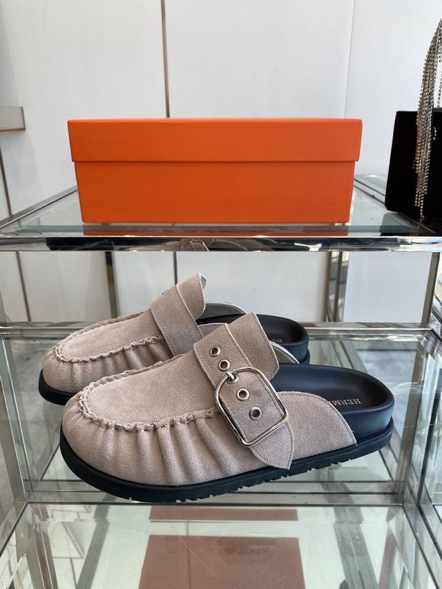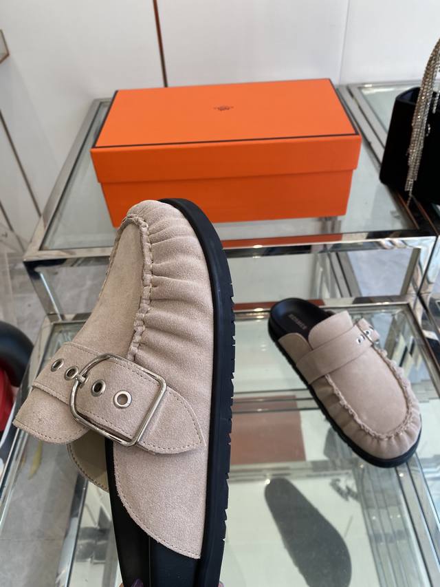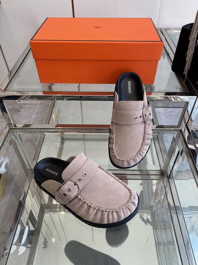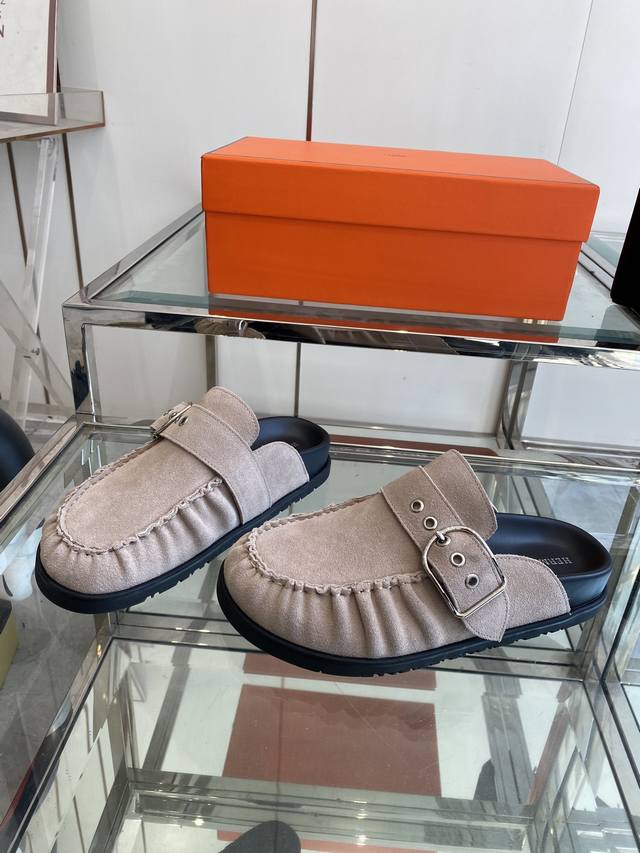 Hermes adorable mule Birkenstocks. These versatile slippers are a summer essential! They look great with everything, exuding a casual yet sophisticated feel. They're also incredibly comfortable and pair perfectly with colorful socks for a super trendy look. Made with imported suede and sheepskin lining, TPU non-slip and wear-resistant outsole. Sizes: 35-40 (Women's size 40, custom made).
