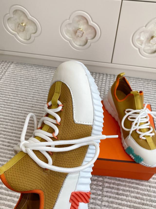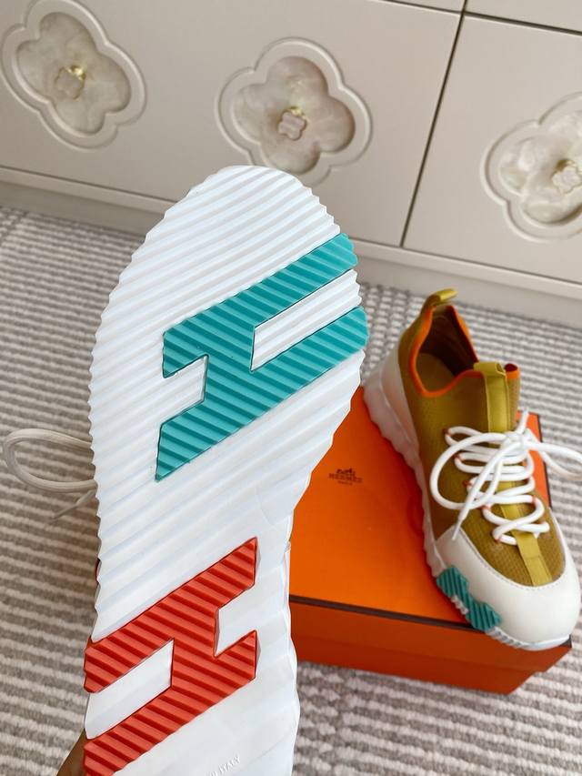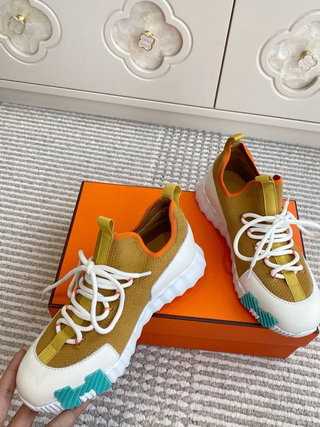 Hermes Bouuncing Couple Style H-lace-up Platform Sneakers (Men's & Women's). Top quality, exquisite craftsmanship, same as the latest arrivals in boutiques. Every detail of the shoes is meticulously crafted, making them quite eye-catching. The elegant patchwork elements highlight their refined style! The fashionable flyknit lace-up design adds a casual touch, while the delicate lines subtly showcase the brand's design language. The interwoven lines perfectly fit the foot shape, naturally outlining a fashionable silhouette and achieving a visually striking effect, fully embodying a unique sporty style! The upper is made of imported high-gloss cashmere, flyknit cowhide, and breathable mesh lining. The insole is made of mixed sheepskin for a comfortable feel. The Ip TPU outsole is seamlessly combined using German technology, making it lightweight, highly elastic, slip-resistant, and wear-resistant! Original box packaging. Size: 35-45 (Women's 41, Men's 46). Custom orders accepted.