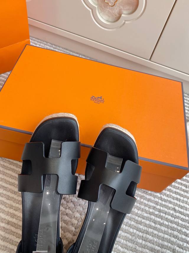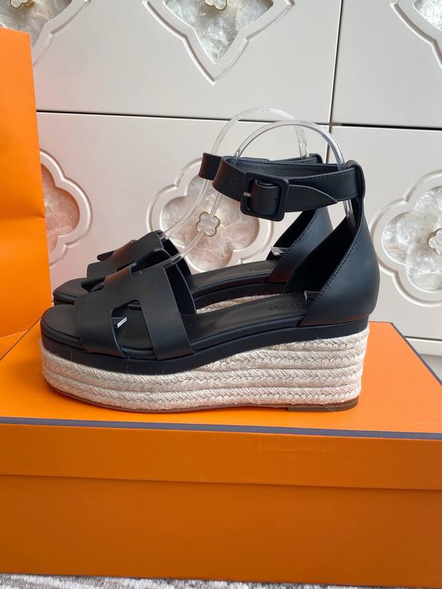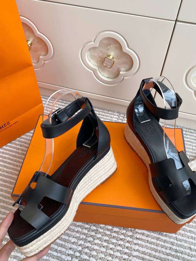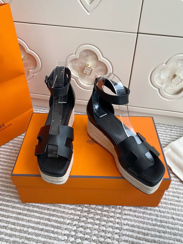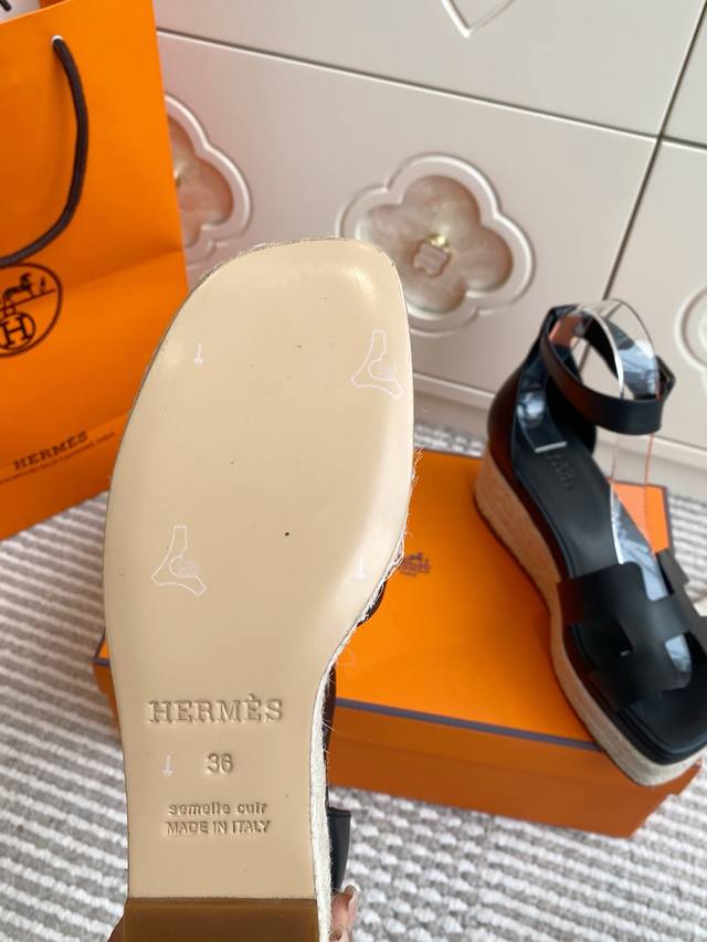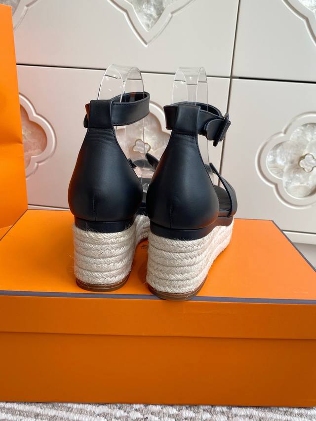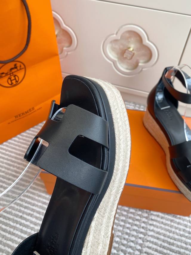 Hermes Elda series hemp rope and straw thick-soled wedge sandals
