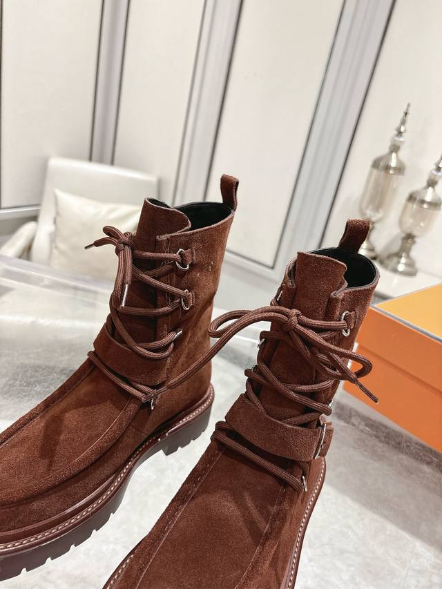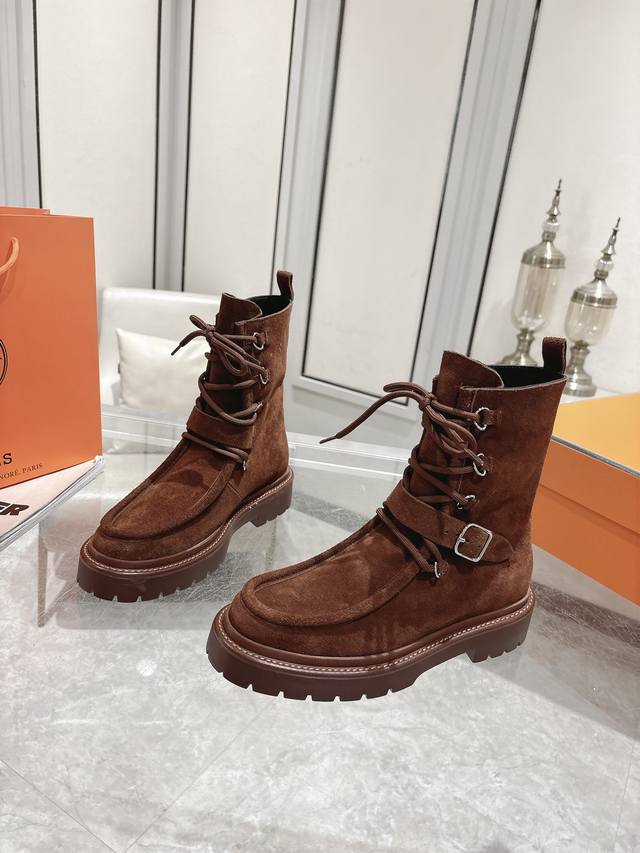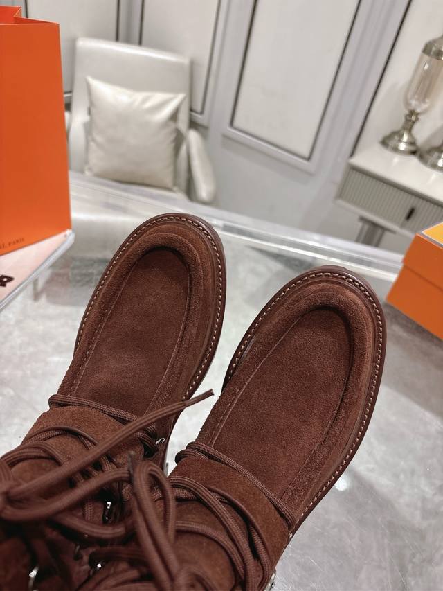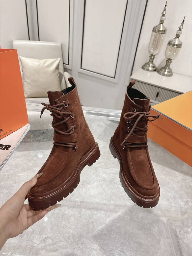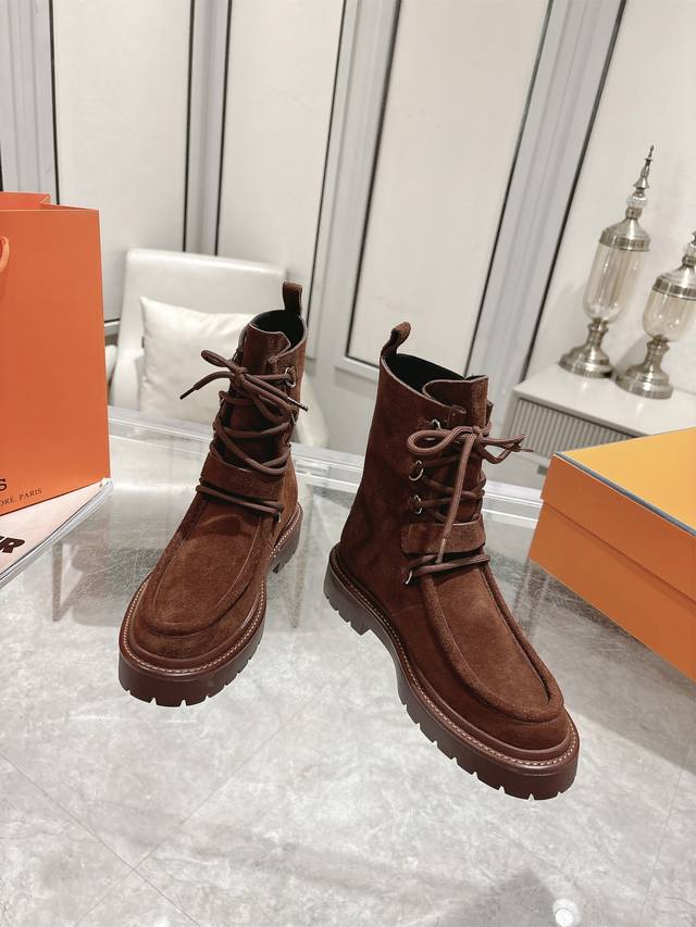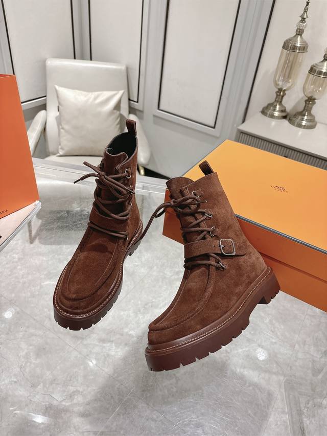 Hermes Land platform lace-up ankle boots, made of calfskin with a thick rubber sole! Create a bold urban style! Material: Imported calfskin leather; Lining: Sheepskin; Outsole: Original molded non-slip rubber outsole; Size: 35-39, 40 (custom sizes available).