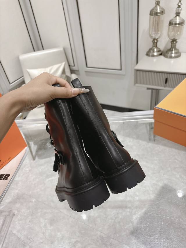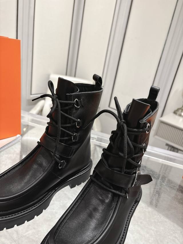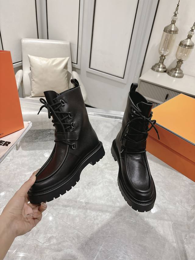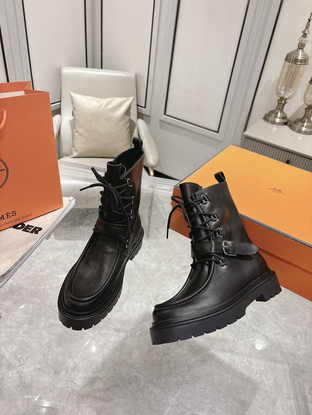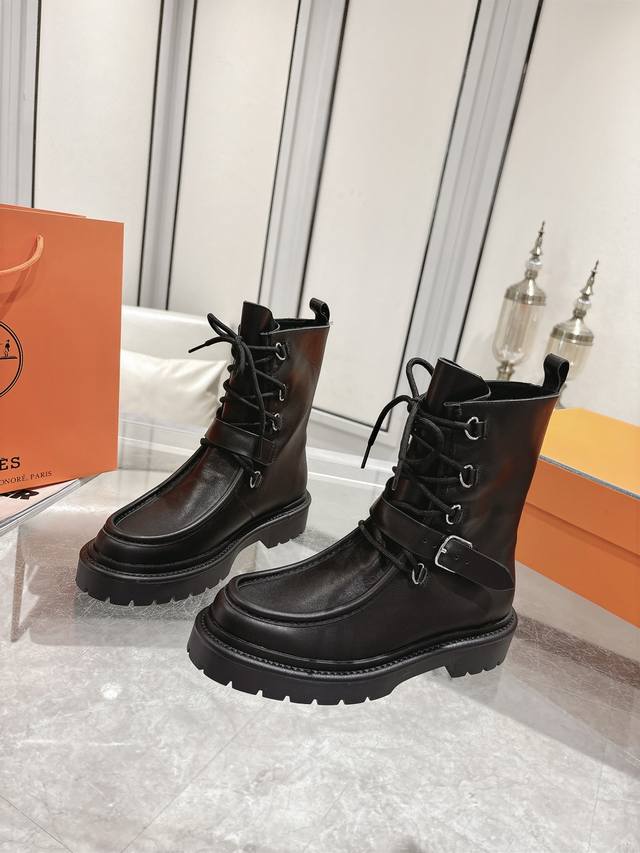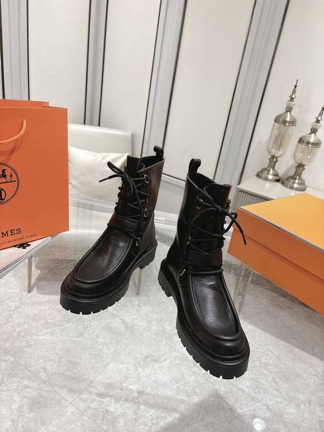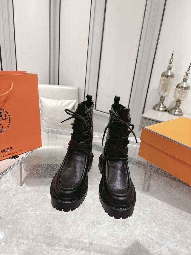Hermes Land platform lace-up ankle boots, made of calfskin with a thick rubber sole! Create a bold urban style! Material: Imported calfskin leather; Lining: Sheepskin leather; Outsole: Original molded non-slip rubber outsole; Size: 35-39, 40 (custom sizes available).