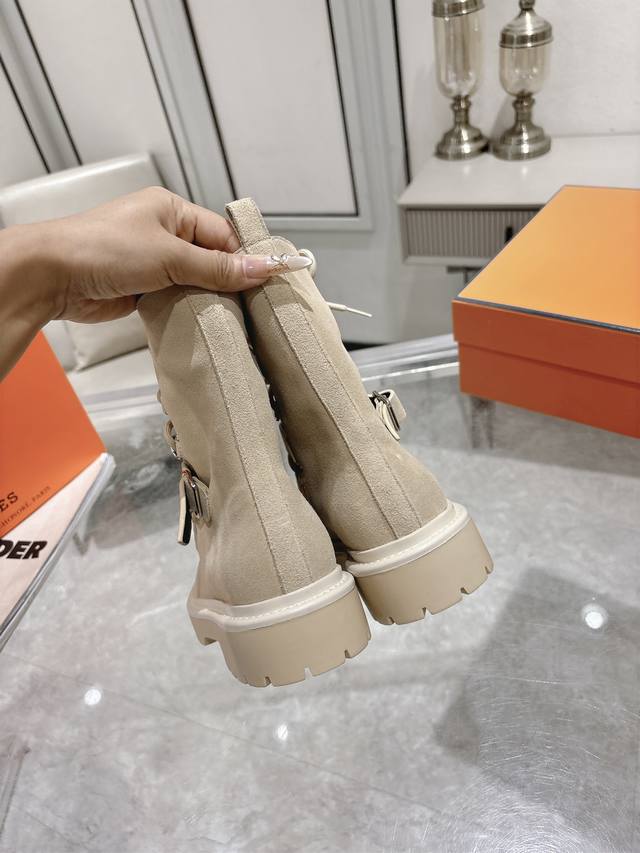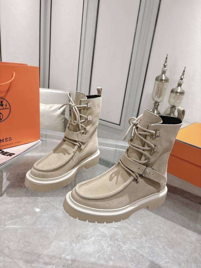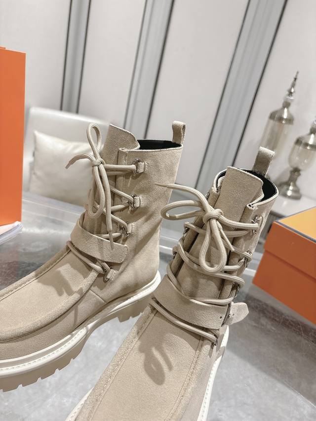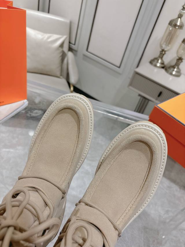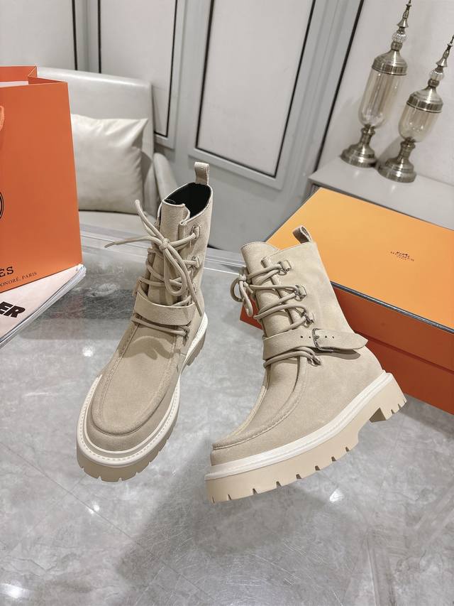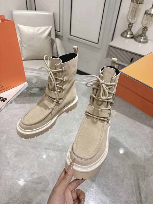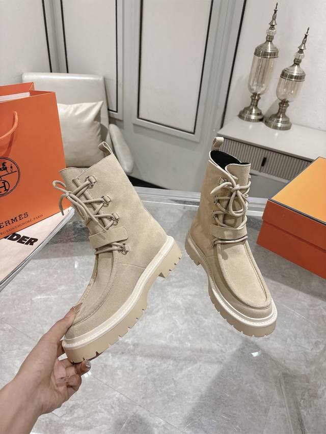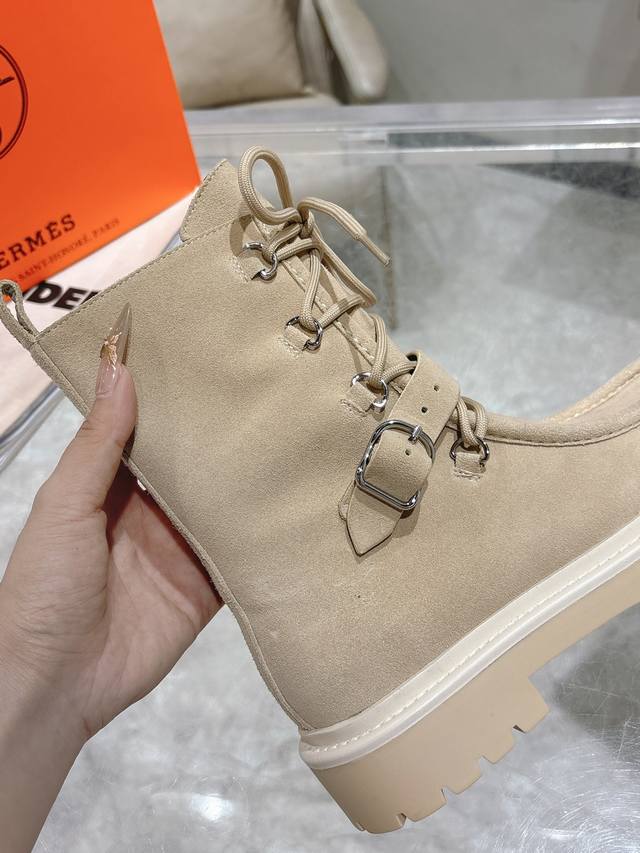 Hermes Land platform lace-up ankle boots, made of calfskin with a thick rubber sole! Create a bold urban style! Material: Imported calfskin leather; Lining: Sheepskin; Outsole: Original molded non-slip rubber outsole; Size: 35-39, 40 (custom sizes available).