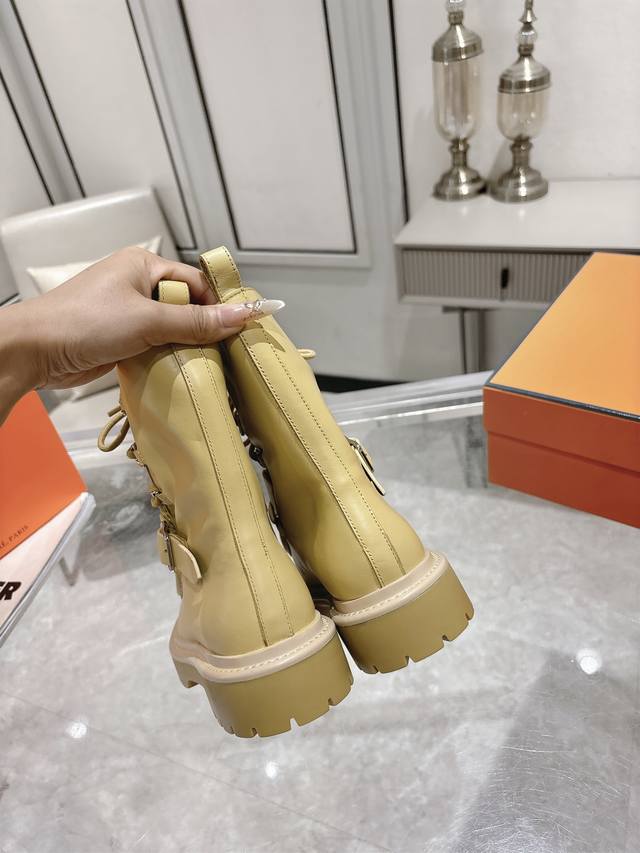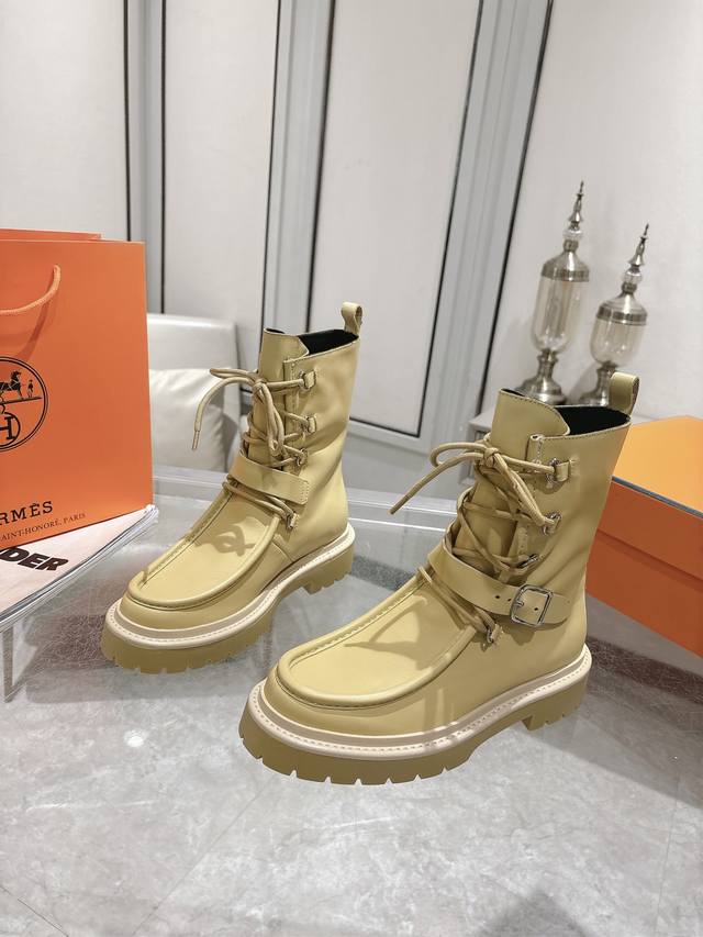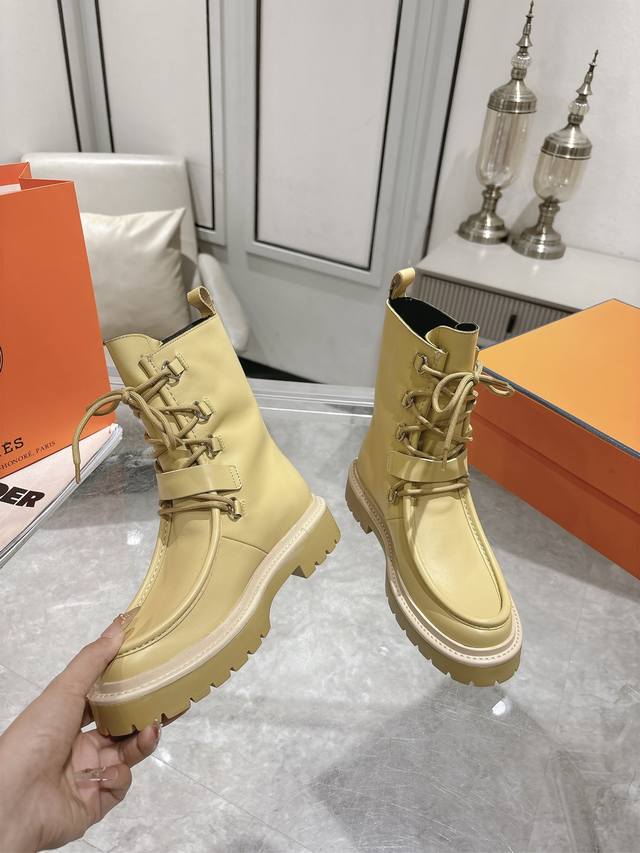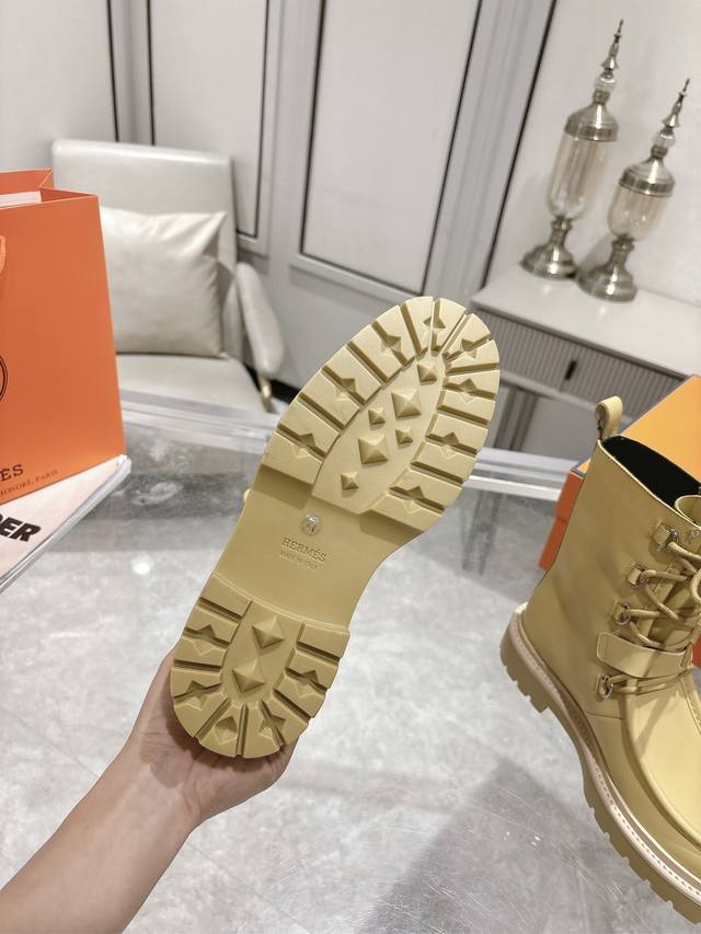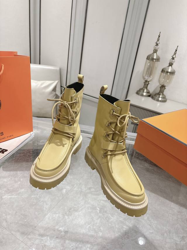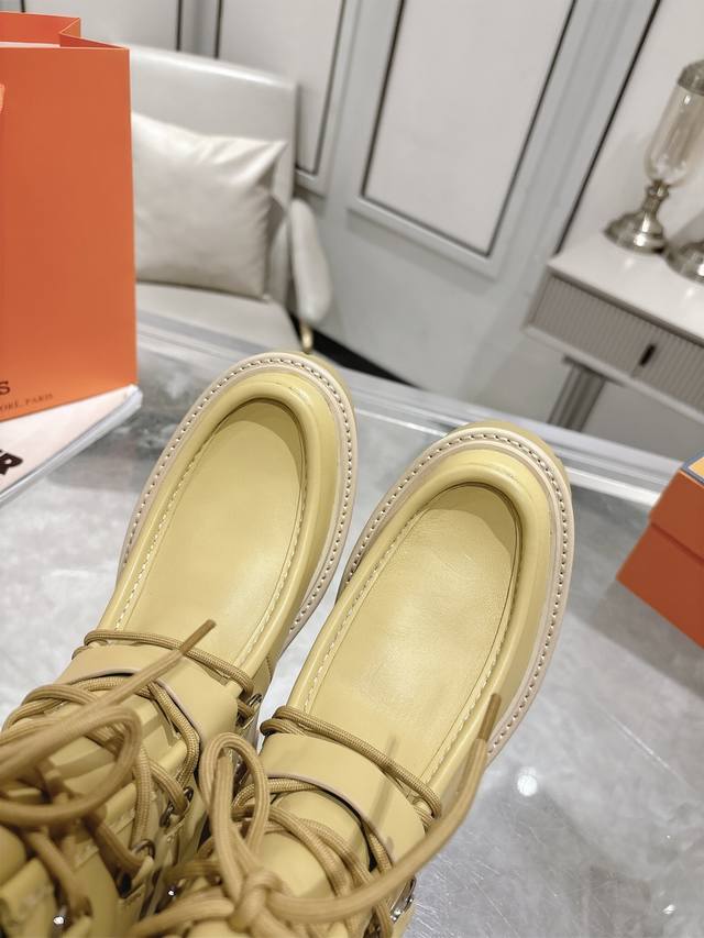 Hermes Land platform lace-up ankle boots, made of calfskin with a thick rubber sole! Create a bold urban style! Material: Imported calfskin leather; Lining: Sheepskin leather; Outsole: Original molded non-slip rubber outsole; Size: 35-39, 40 (custom sizes available).